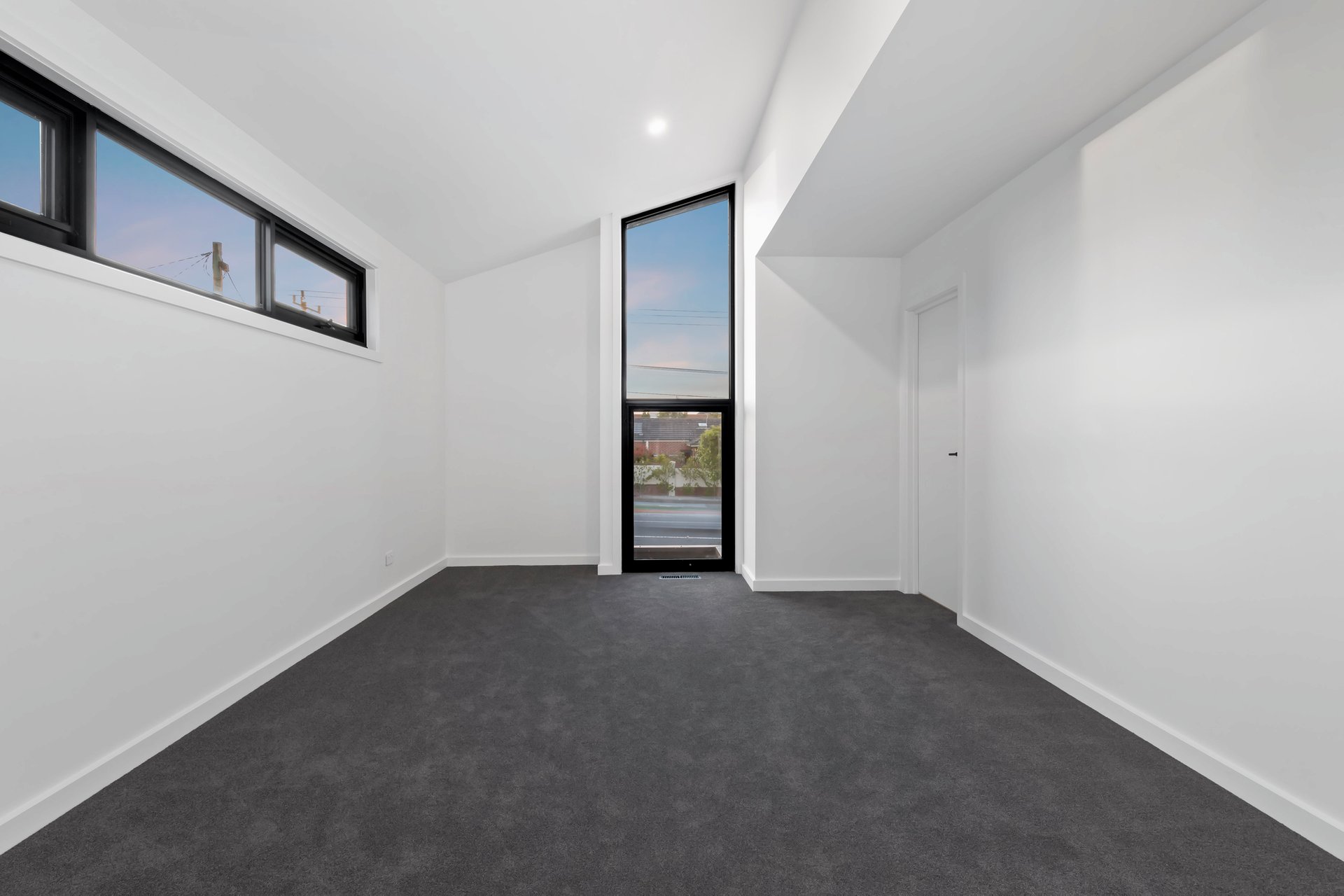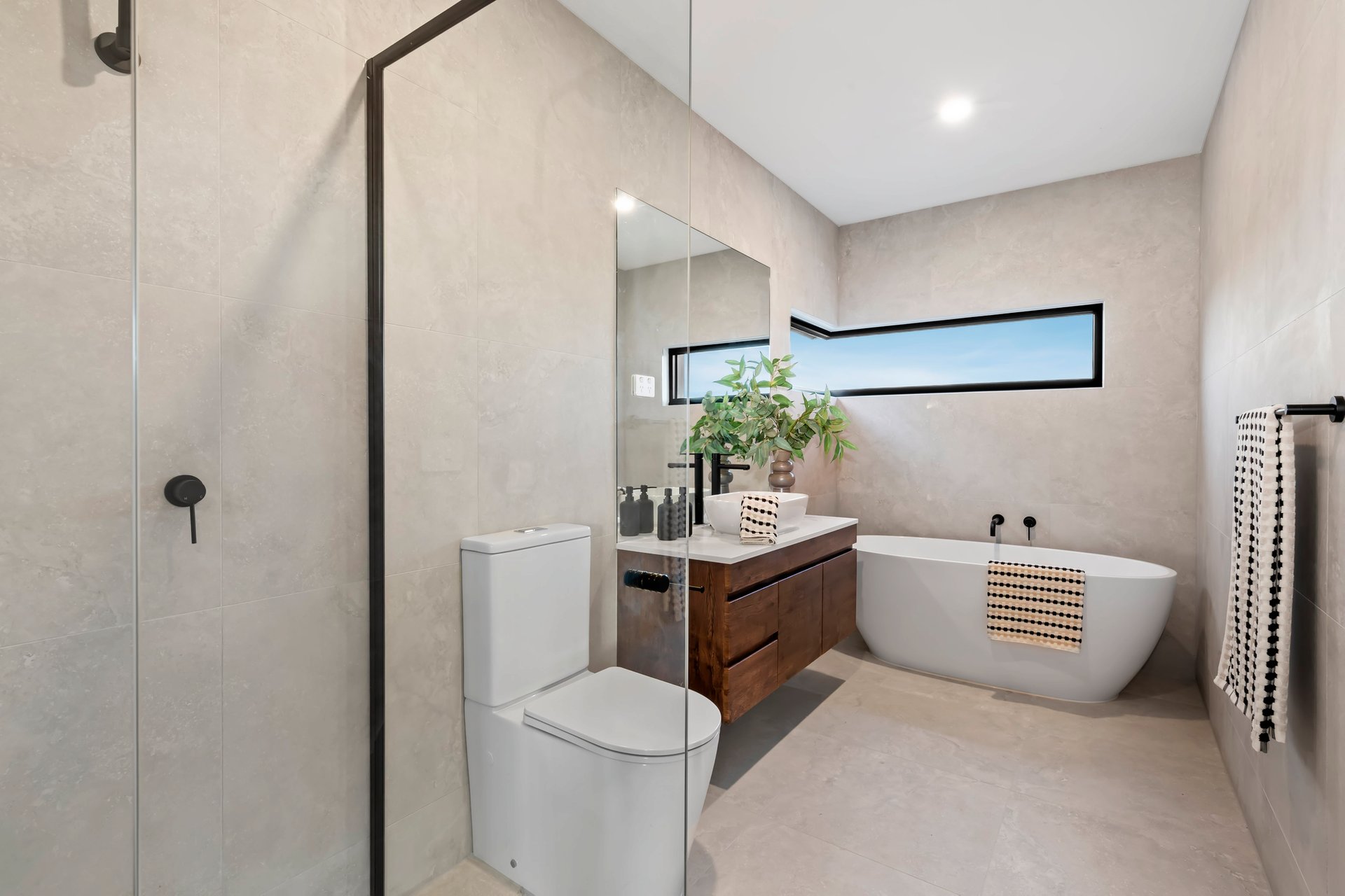 Upstairs, the top level is dedicated to family accommodation with three robed bedrooms, including a stunning master suite. Boasting soaring ceilings, striking feature windows, a walk-in robe, and a deluxe ensuite with a double shower, it offers a luxurious sanctuary. Completing the level is a central retreat with a study nook, plus a beautifully appointed main bathroom with floor-to-ceiling tiles, a freestanding bath, and a stone-topped vanity.
