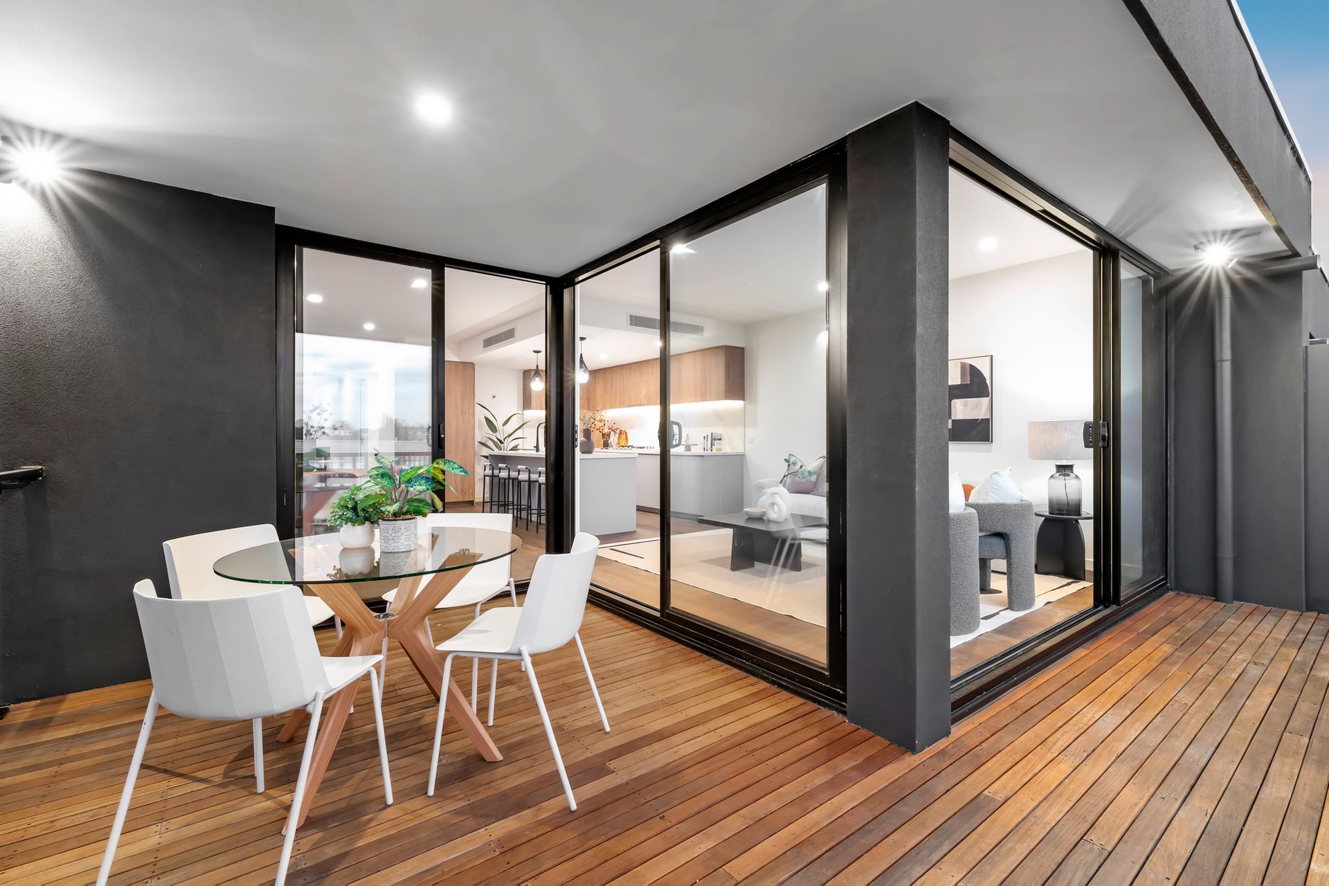 Stacker doors seamlessly extend the living space to a covered timber deck, perfectly positioned for relaxed gatherings and framed by low-maintenance gardens with