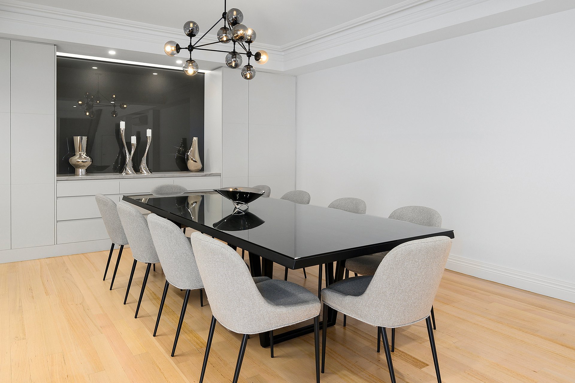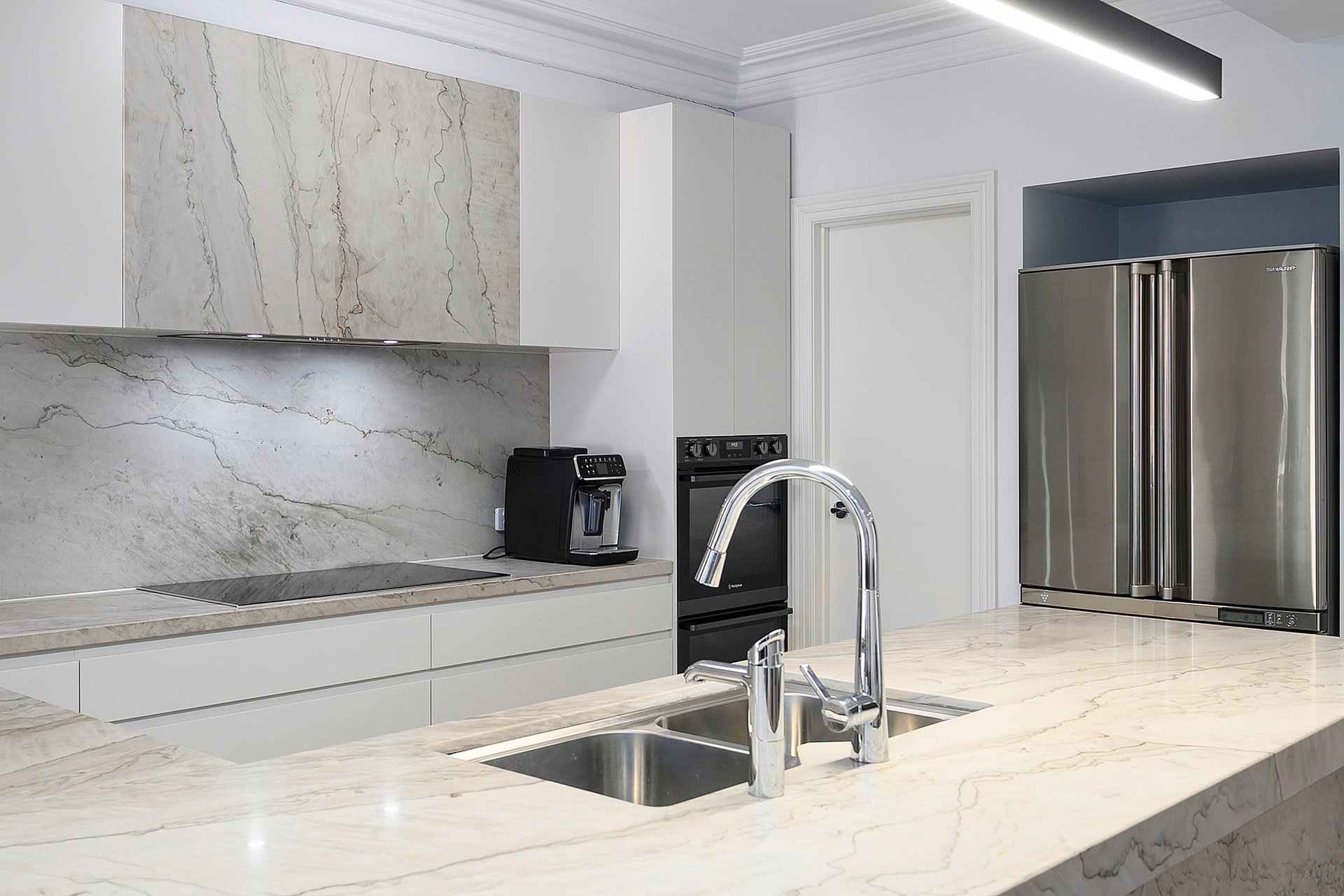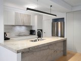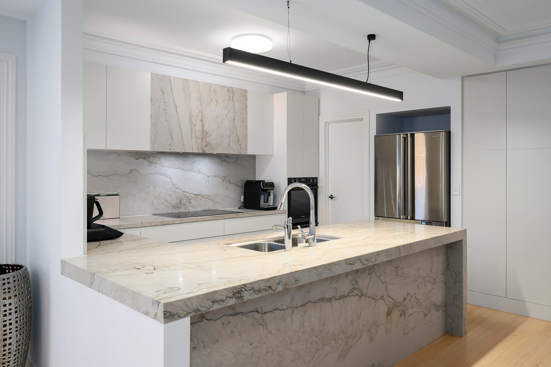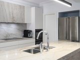 Beyond its striking presence, the ground floor reveals a beautifully appointed interior where natural light enhances every space. A private study provides the ideal work from home environment while the elegant formal living room offers a refined setting for relaxation. At the heart of the home, the expansive open plan kitchen and dining domain showcase premium stone bench tops and high-quality European appliances, seamlessly blending functionality and designer appeal. A stylish bathroom with integrated laundry and an additional living area extend through to the alfresco area featuring a bespoke artistic feature wall creating a superb environment for year-round entertaining.