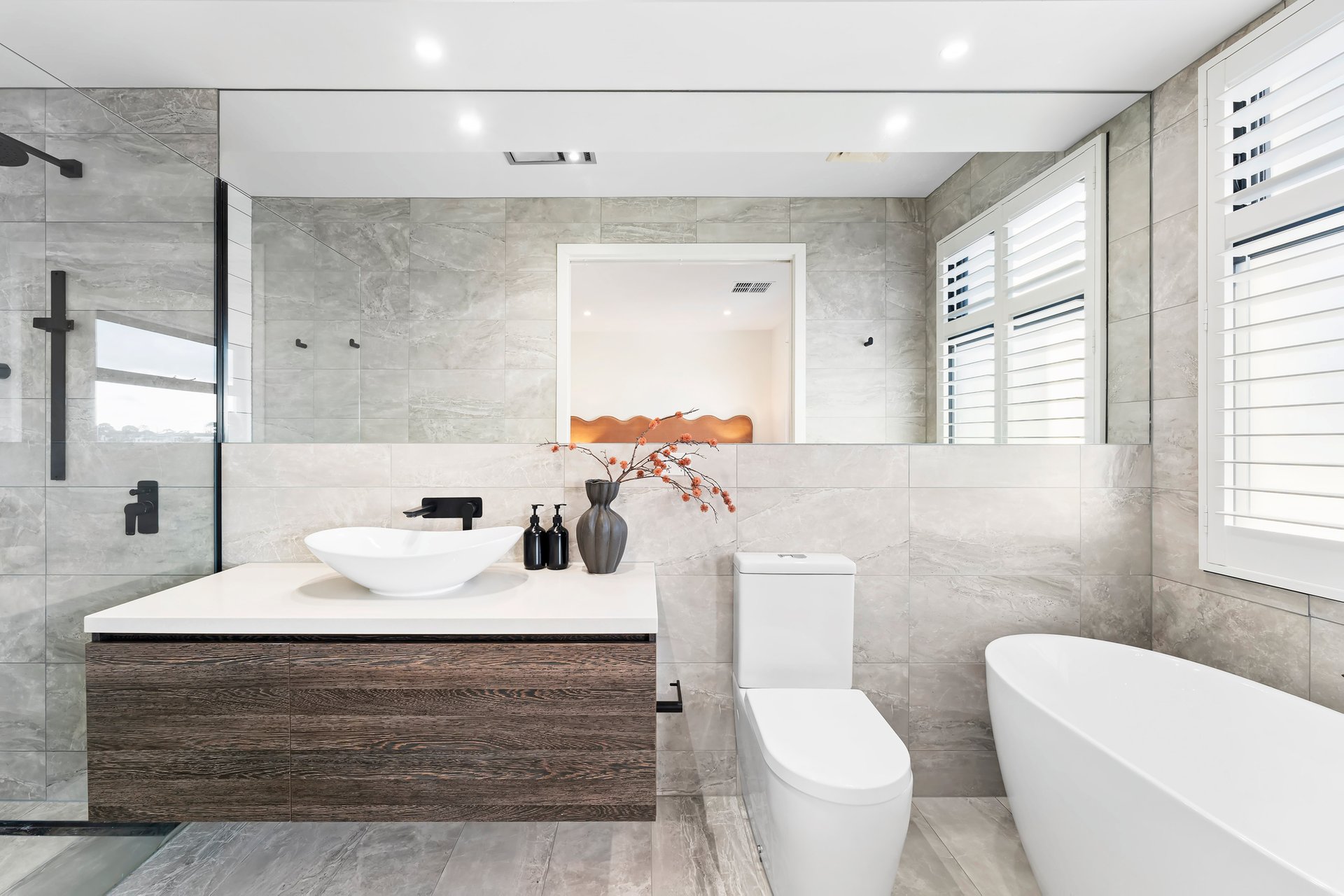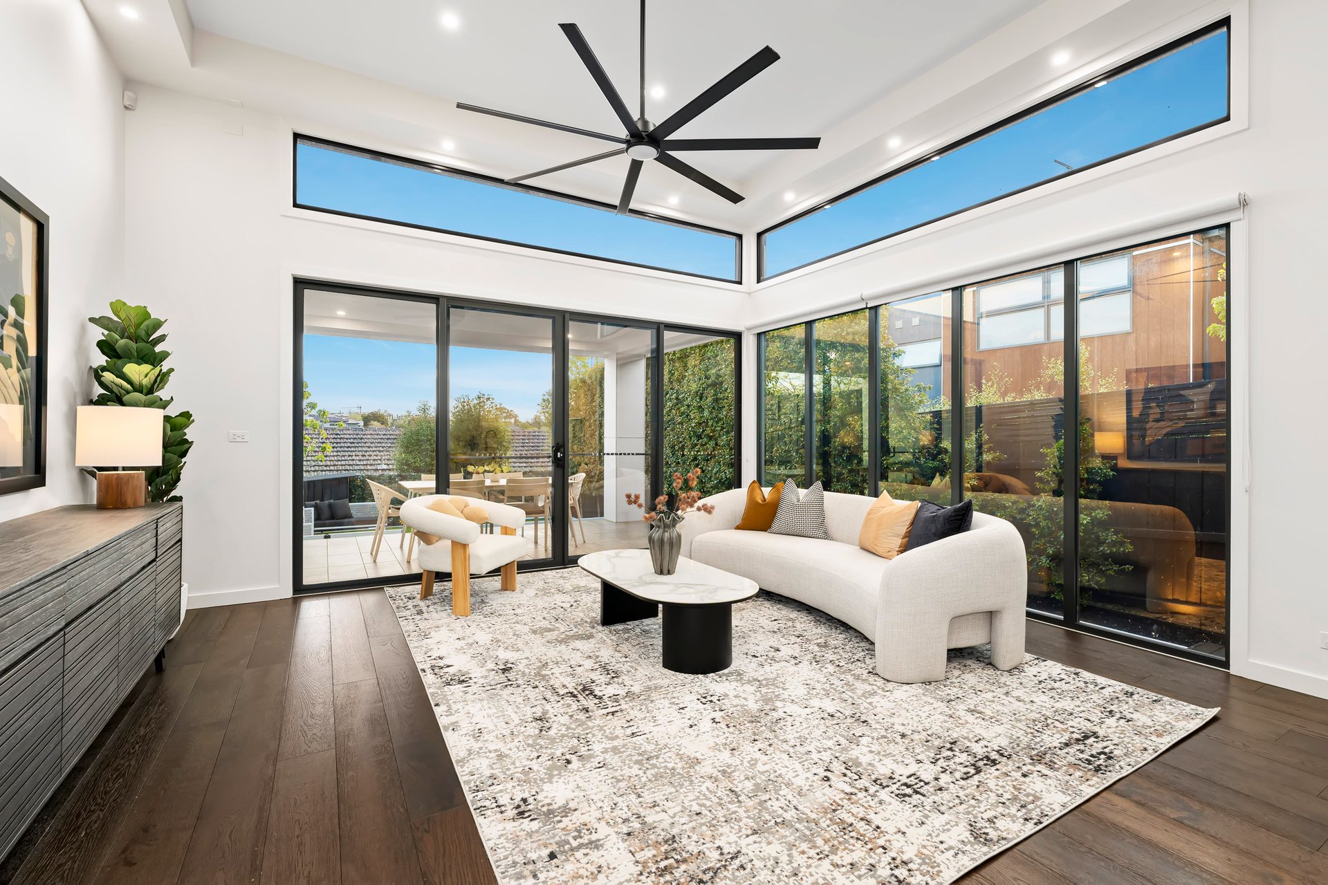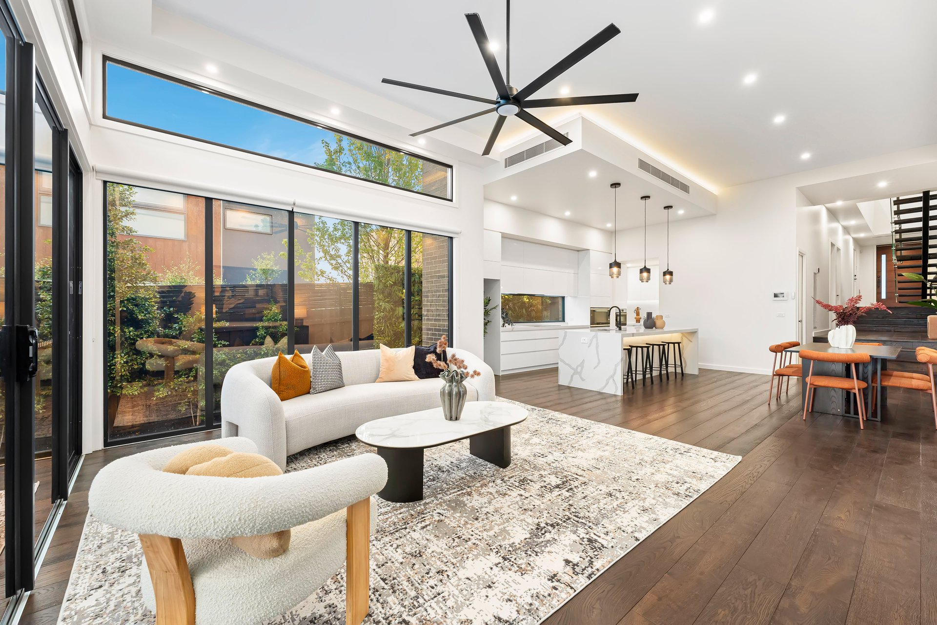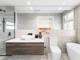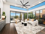Upon entry, a striking fishbone staircase takes centre stage, complemented by soaring four metre ceilings and rich wide-plank timber floors that create a truly spectacular visual statement. The hero of this level is a substantial open plan living and dining zone, designed for effortless everyday enjoyment with family and friends. At its heart, an oversized island bench with waterfall-edge 60mm stone benchtops anchors the large contemporary kitchen and adjoining butler’s pantry. An abundance of sleek cabinetry and quality Bosch appliances - integrated dishwasher, full-size and combination ovens, and induction cooktop - combine with statement pendant lighting to deliver refined functionality and style. Seamlessly extending the indoors, the expansive alfresco terrace rests beneath the home’s roofline for effortless year-round use. Beyond, a beautifully landscaped, low-maintenance garden offers a serene setting to bask in the sunshine and enjoy the established greenery that surrounds you. Completing this level is the first of the home’s four robed bedrooms and three luxurious bathrooms. With direct access to the downstairs bathroom, it’s the perfect option for accommodating multigenerational living or overnight guests. Upstairs, a versatile retreat offers flexibility as a second living area or open-plan study, accompanied by the remaining bedrooms and bathrooms, including the impressive master suite with city views. This private space features a lavish ensuite with a deep freestanding bath, oversized shower and twin vanities, along with a spacious walk-in robe.