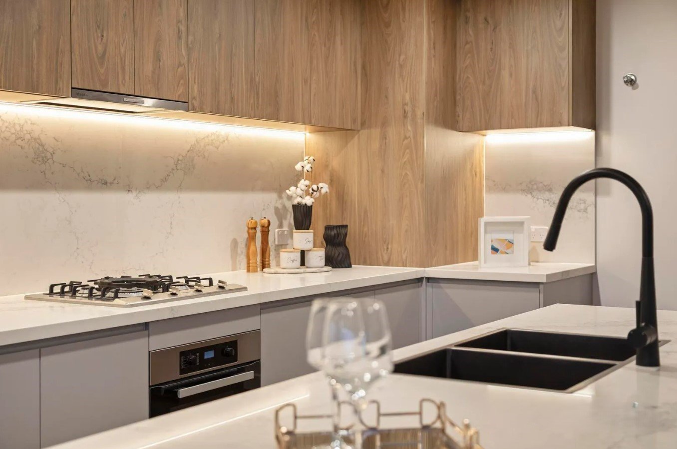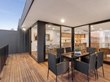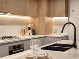 Engineered timber floors flow throughout the ground level, revealing a private guest or master suite complete with a walk through robe and a stylish semi-ensuite. The heart of the home unfolds in the open-plan living and dining area, where a designer island kitchen takes centre stage. Showcasing two-tone cabinetry, stone surfaces, and high-end Miele appliances — including a gas cooktop — it’s a space that inspires both entertaining and everyday ease.