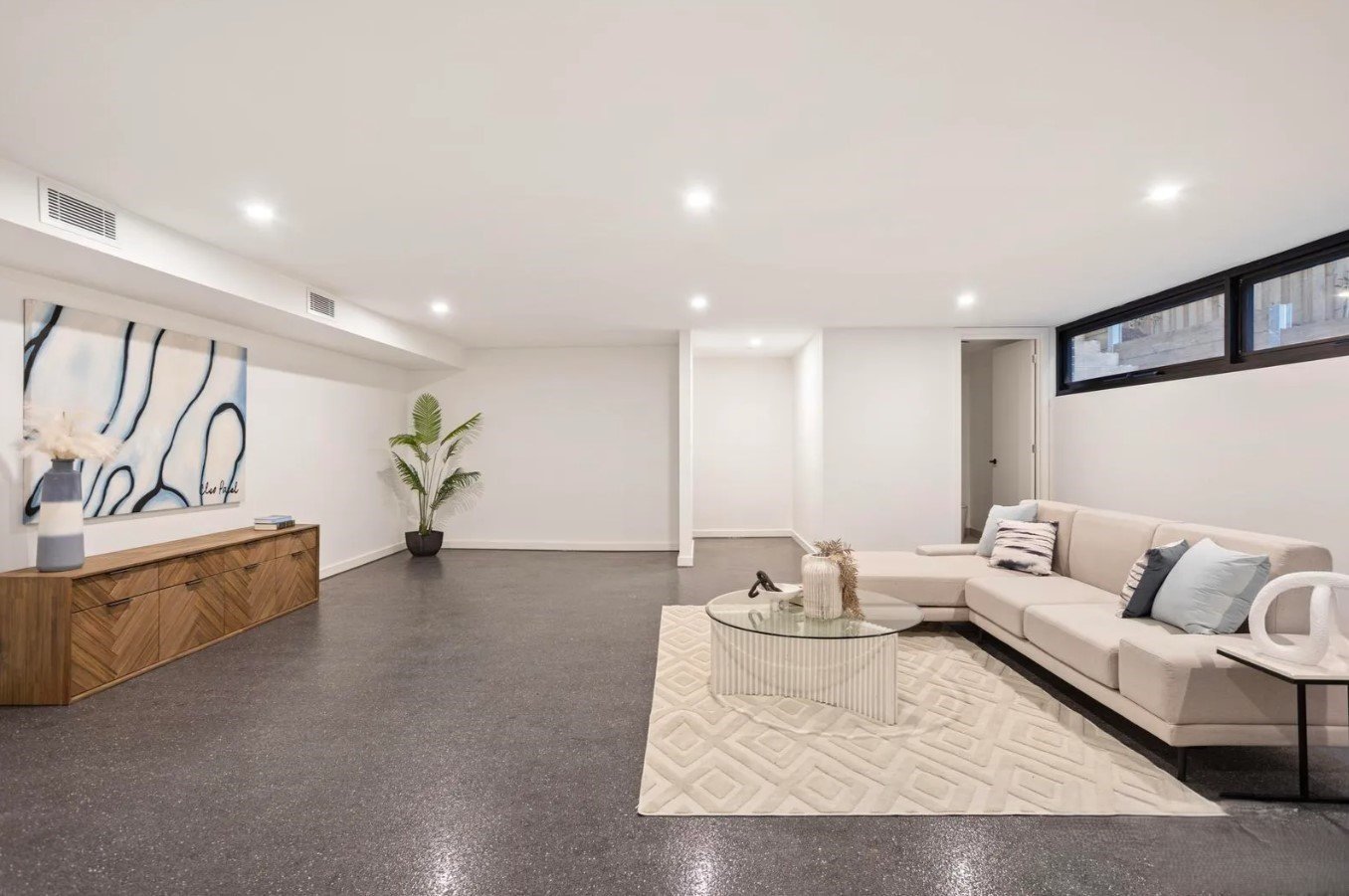 Stacker doors seamlessly extend the living space to a covered timber deck, perfectly positioned for relaxed gatherings and framed by a low-maintenance garden. Downstairs, the lower-ground level adds versatility with a peaceful theatre or rumpus room or huge home office and a convenient powder room — the ideal retreat for teenagers, guests, or family movie nights.