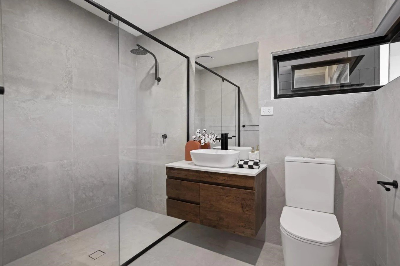 Upstairs, the top level is dedicated to family accommodation with three robed bedrooms, including a stunning master suite. Boasting soaring ceilings, striking feature windows, a walk-in robe, and a deluxe ensuite with a double shower, it offers a luxurious sanctuary. Completing the level is a central retreat, plus a beautifully appointed main bathroom with floor-to-ceiling tiles, a freestanding bath, and a stone-topped vanity.