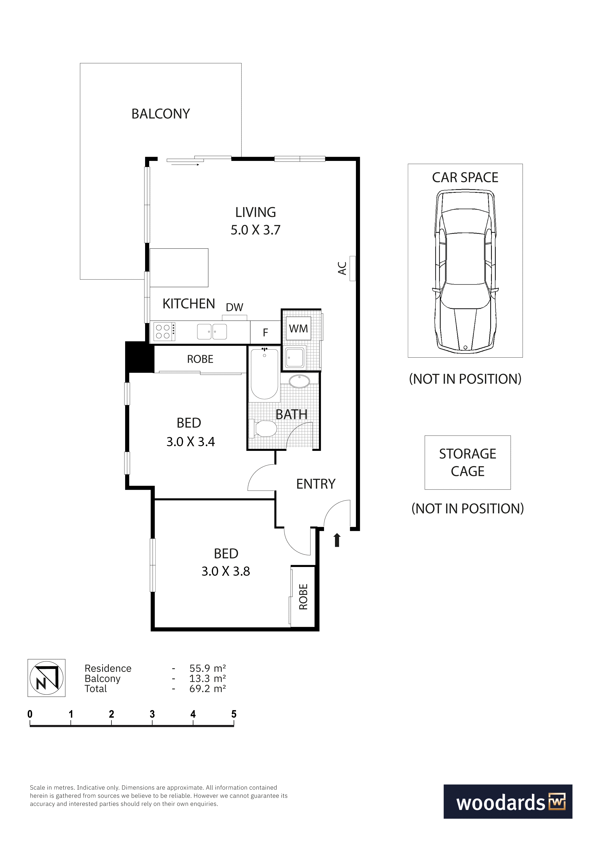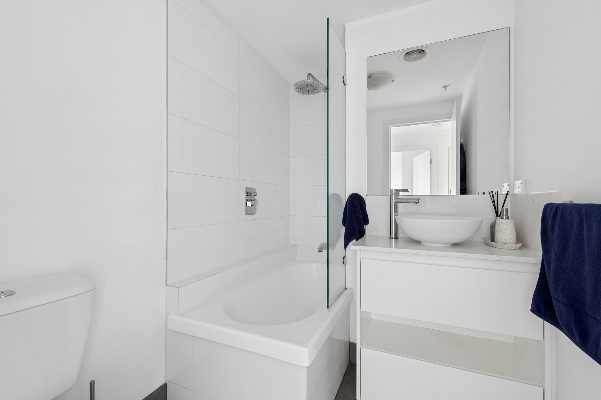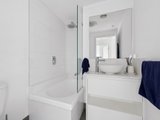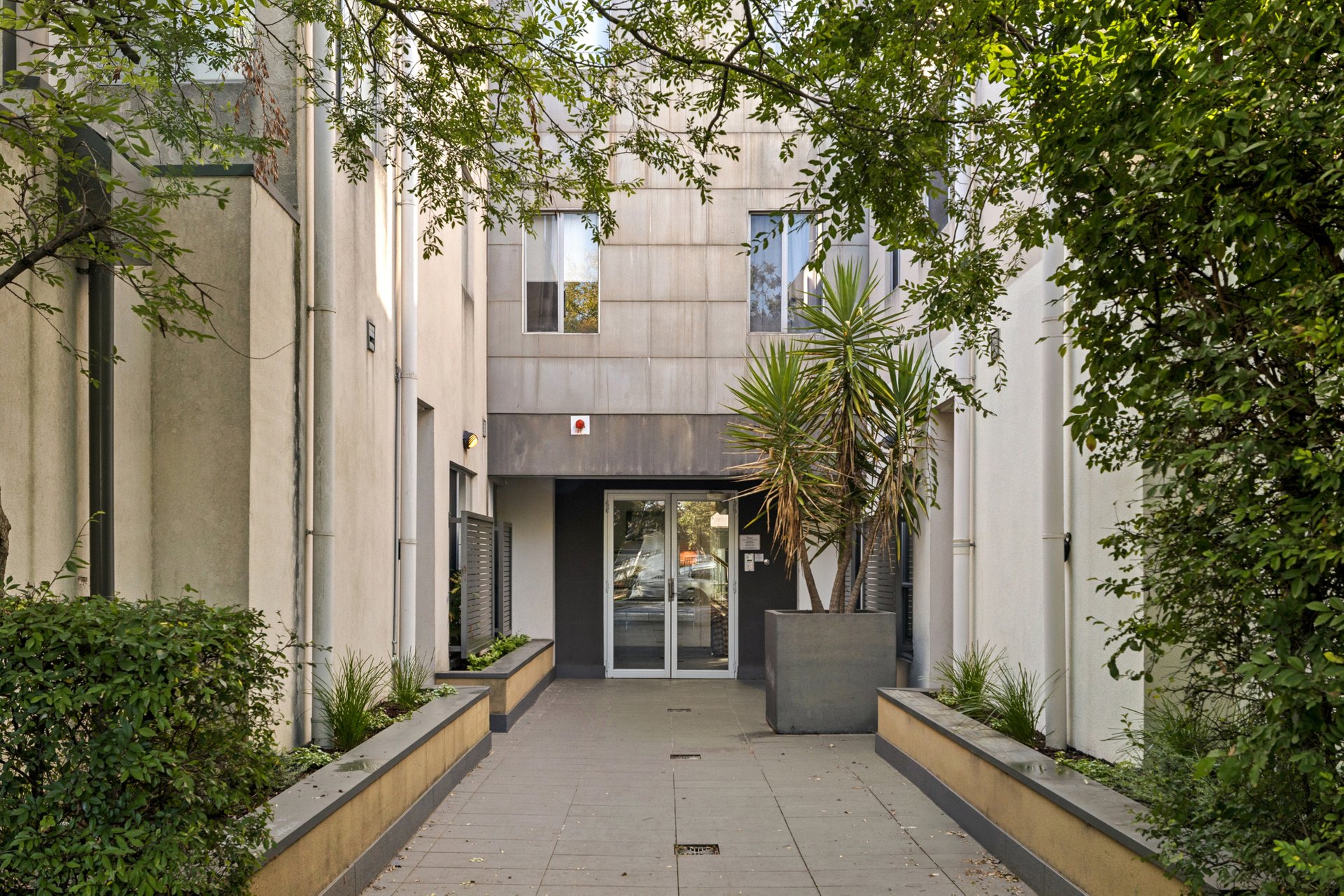 Inside, windows on two sides keep the living and dining bright through the day. The kitchen is equipped with stone benchtops, electric cooking, dishwasher and a breakfast bar for two. Both bedrooms have built-in robes and sit close to a central bathroom with shower-over-bath and a vessel basin. A European laundry is neatly tucked away and a intercom entry, car space and a storage cage are all included. The building is designed around a landscaped central atrium, giving it a greener outlook and a calming aura as you come and go.