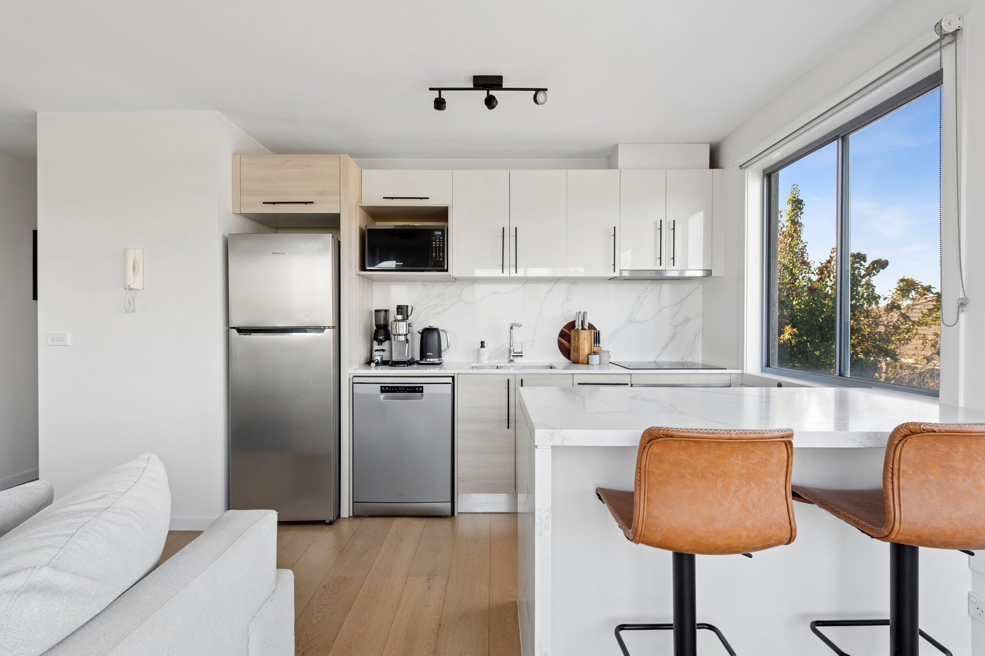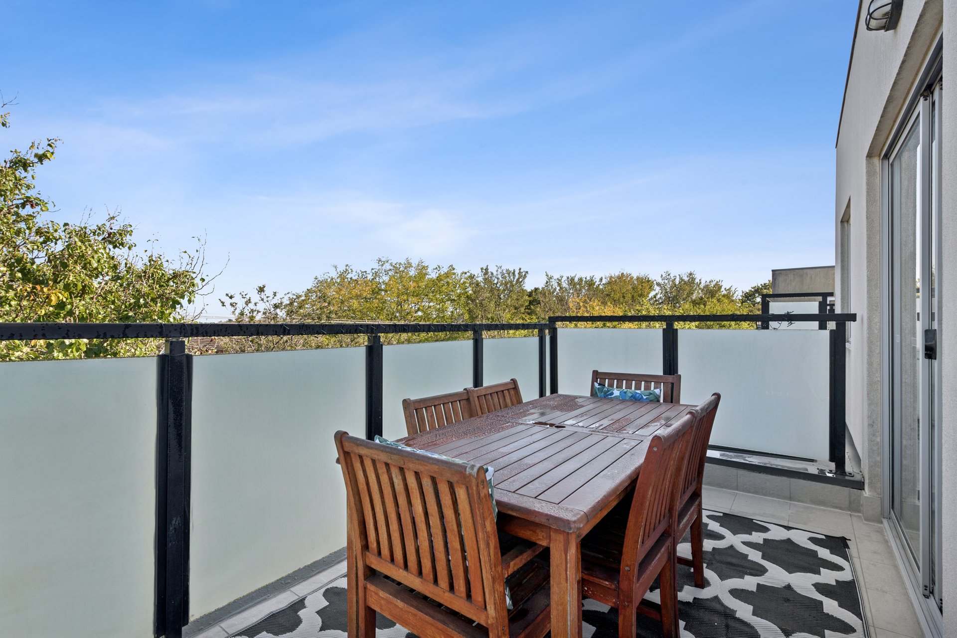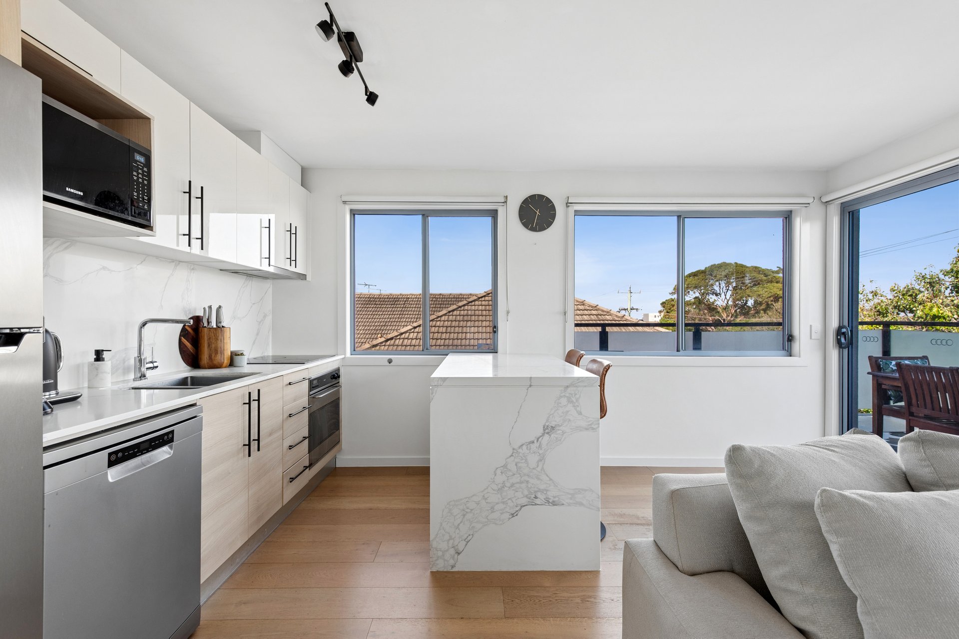 On the corner of the top floor, this modern apartment is opened up by a generous wraparound balcony that brings in the light and stretches the views beyond the rooftops to treetops and the sky, and with its westerly aspect, the sunsets are worth staying home for. There’s space here for a full outdoor setting, a barbecue, and even a couple of loungers without feeling crowded.