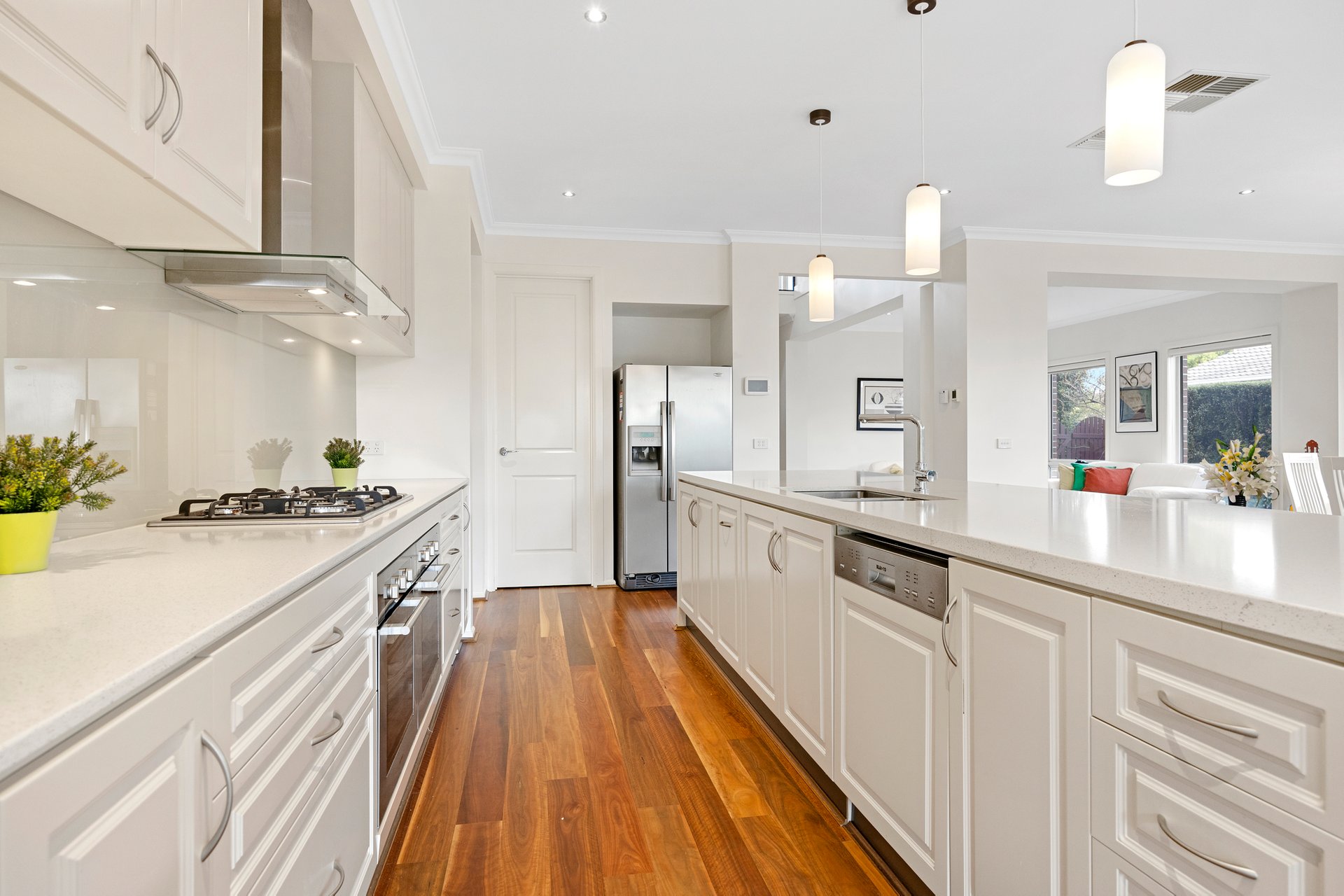 Boasting streamlined cabinetry, stainless steel appliances, double ovens and gas cooktop, stone benches with waterfall edge, soft close cabinetry, island bench and breakfast bar, a perfect space for entertaining or relaxing with family, providing easy connectivity outside to the undercover alfresco deck with easy connectivity from dual doors from the living and dining areas, allowing the outdoors to flow into the home.