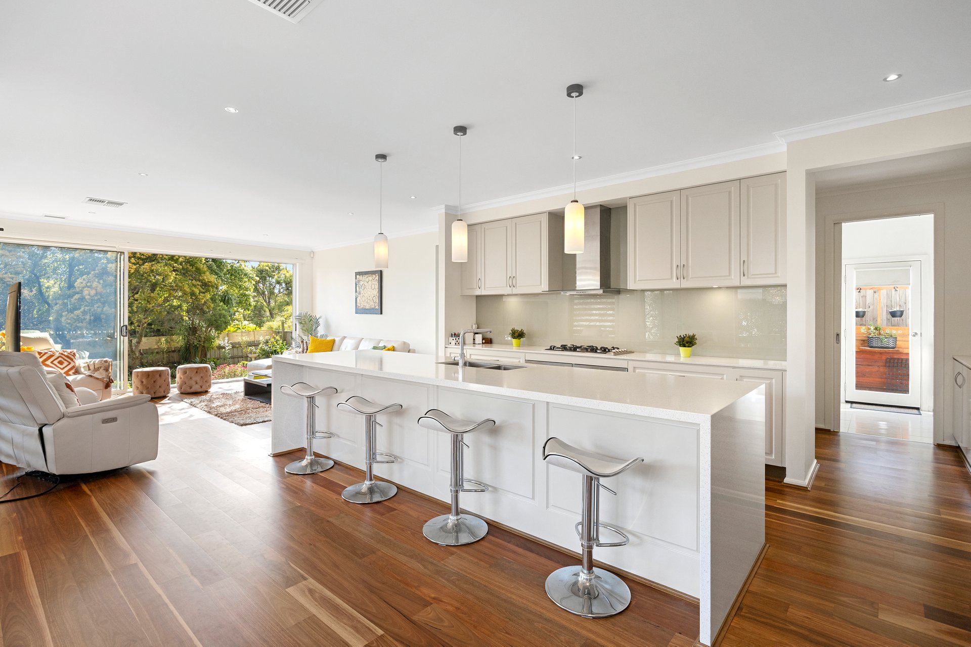 Open-plan living is at the heart of the home and effortlessly blends the family living area, featuring sleek lines, with the meals area made ambient with pendant lighting and the gourmet kitchen as the backdrop.