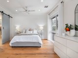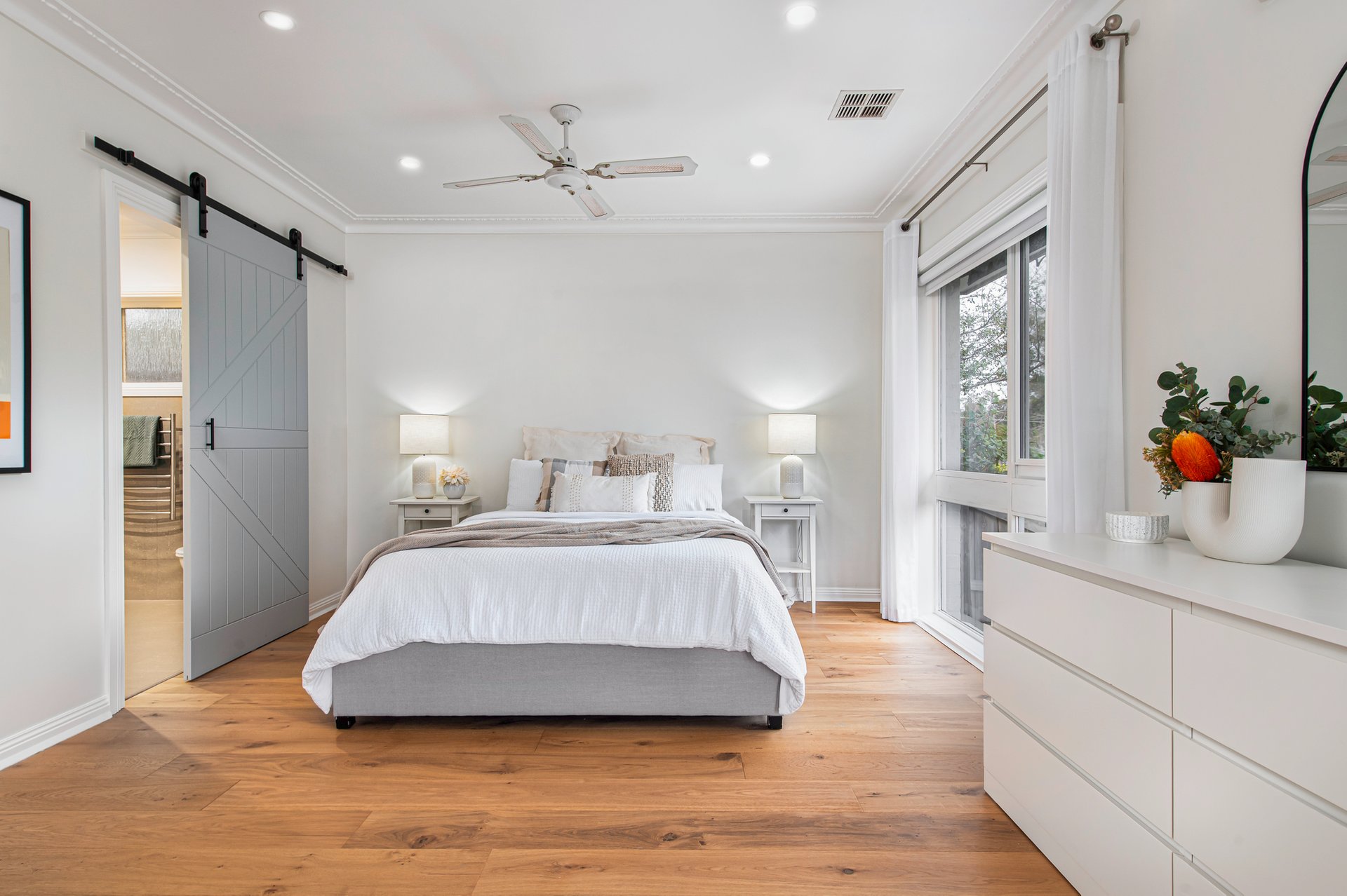 The luxurious master retreat enjoys a peaceful front position with corner windows, walk-in robe, dedicated study nook, and a stunning ensuite featuring a statement barn door, enormous walk-in shower, and elegant designer fixtures.