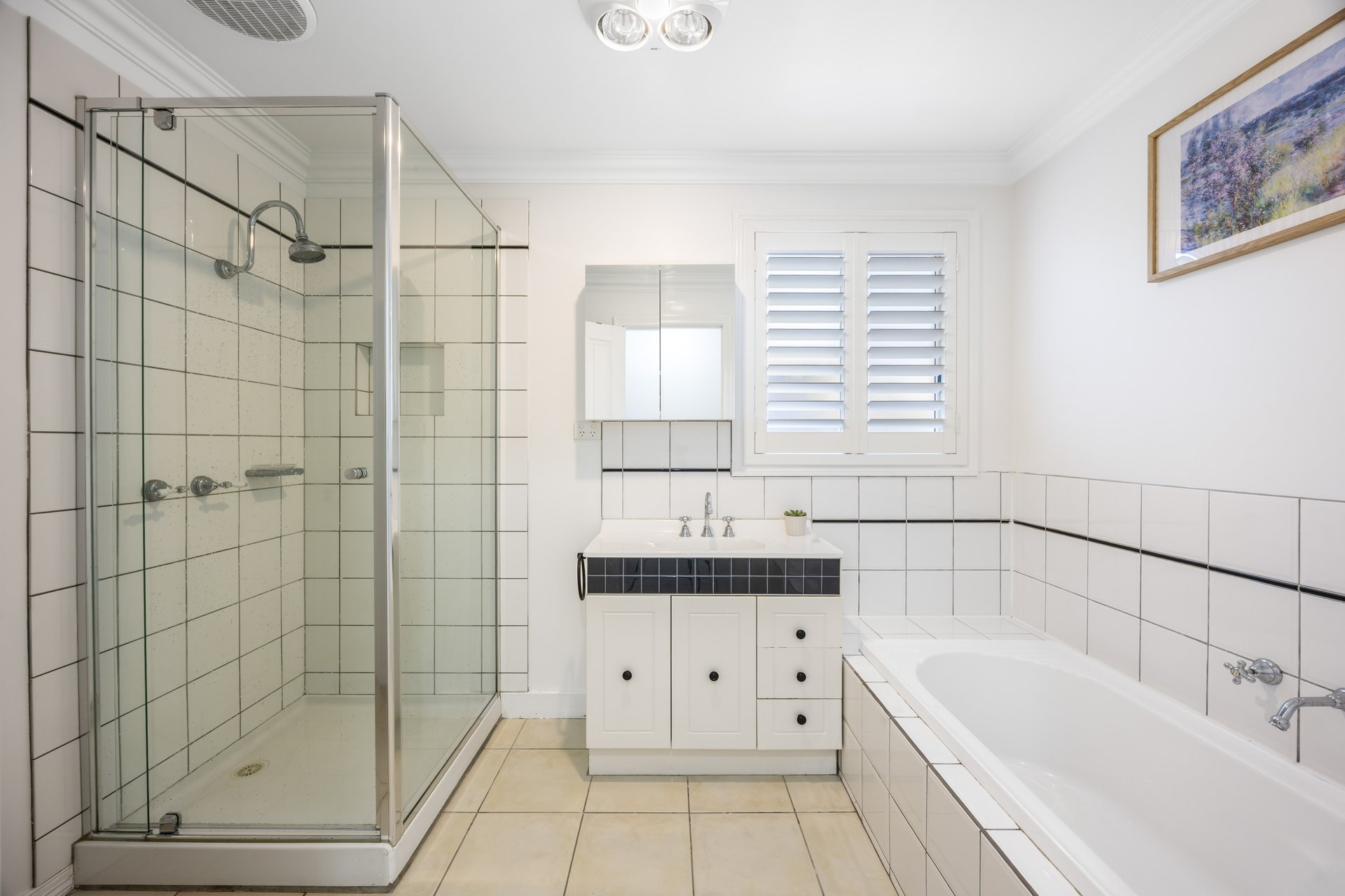 - Two-way bathroom with shower, bath, vanity and separate toilet