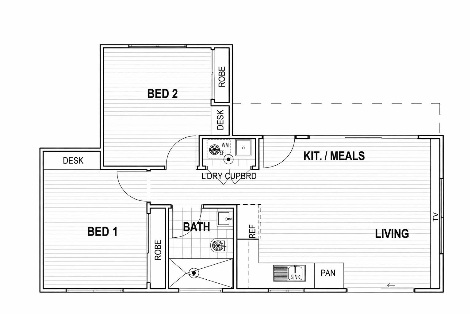 Both bedrooms are generously proportioned and include built in robes, dedicated desk spaces ideal for working or studying from home, and individual split system units to ensure personalised climate control. A stylish central bathroom is paired with a cleverly integrated laundry cupboard, while TV antenna points in each room and NBN connectivity provide excellent modern convenience.