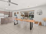 The expansive open-plan living area at the rear of the property is a highlight, seamlessly flowing into a functional kitchen that is as beautiful as it is practical. Featuring stainless steel appliances, including an electric oven, gas cooktop, dishwasher, and sleek stone benchtops. The kitchen is thoughtfully designed for both practicality and style. The central island provides seating for up to five, and ample cabinetry ensures there is no shortage of storage space. The adjoining tiled dining area is generously proportioned, comfortably accommodating a table for 8-10 guests, while glass doors open to a covered alfresco area, creating the perfect setting for year-round entertaining.