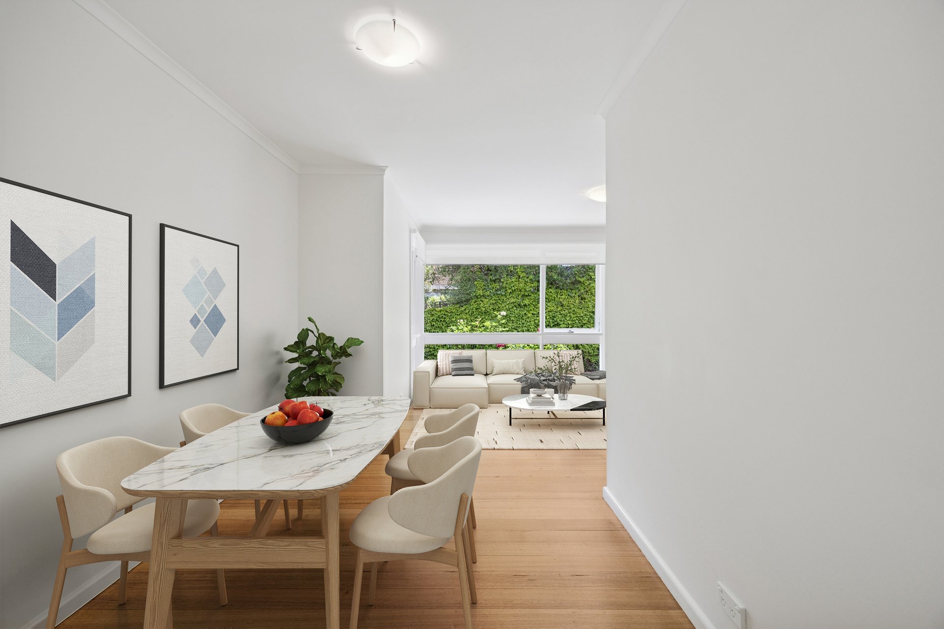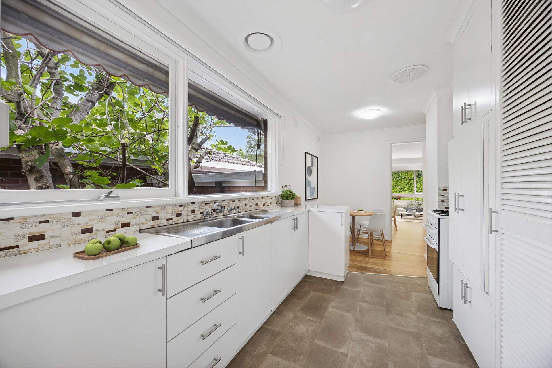 The entrance leads to a north-facing living room where a corner window fills the space with daylight. The solid timber floors stretch through to the dining room before meeting the casual meals zone and the adjoining tiled galley kitchen, which has been renovated with easy everyday use in mind.