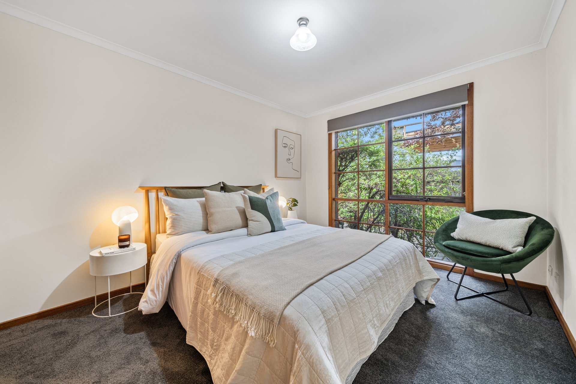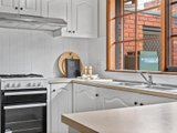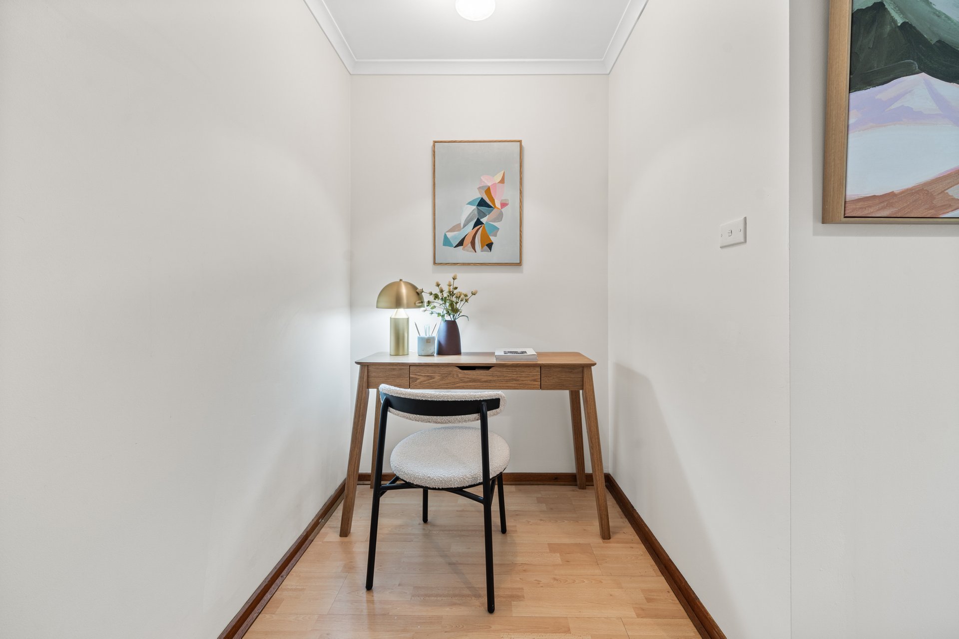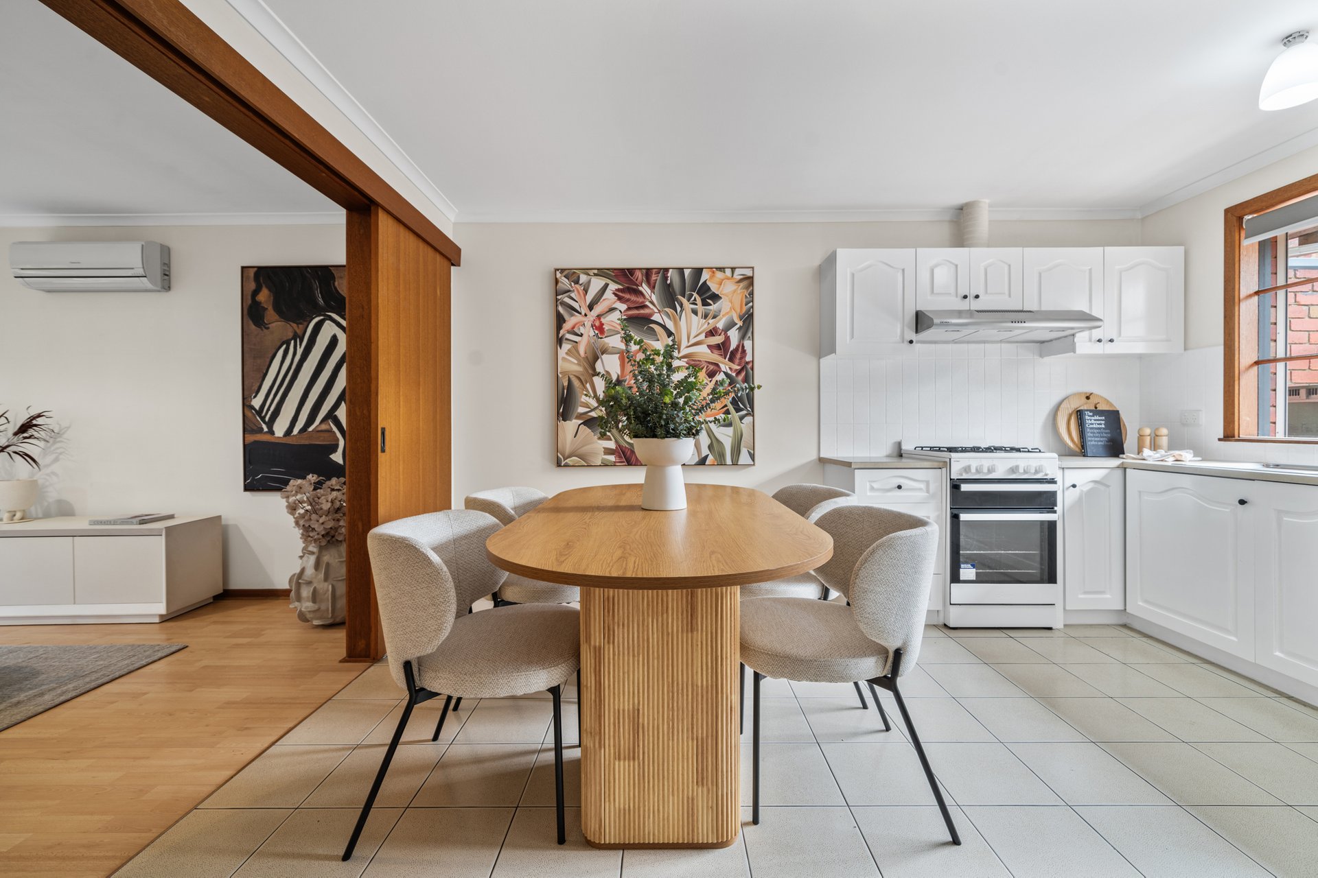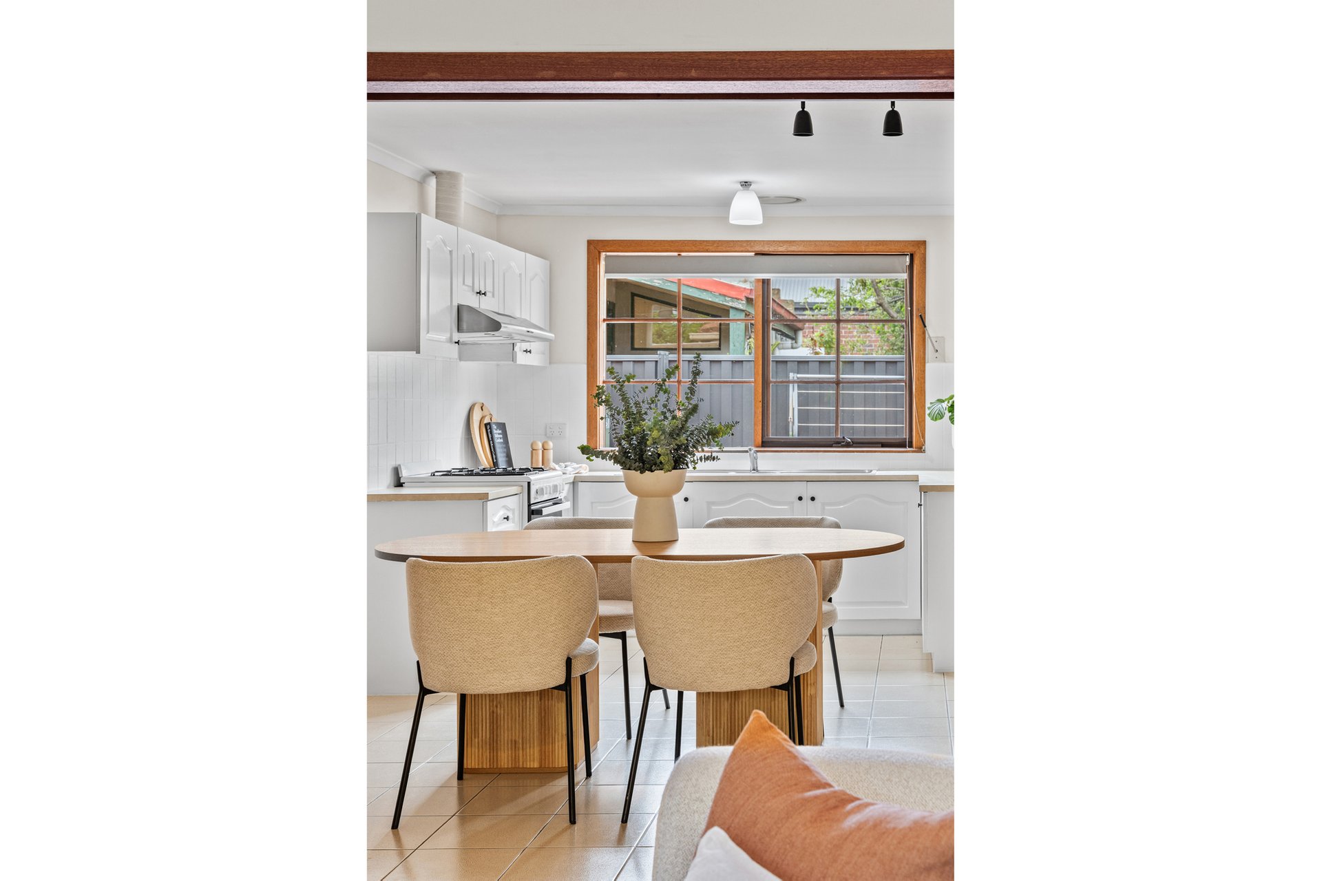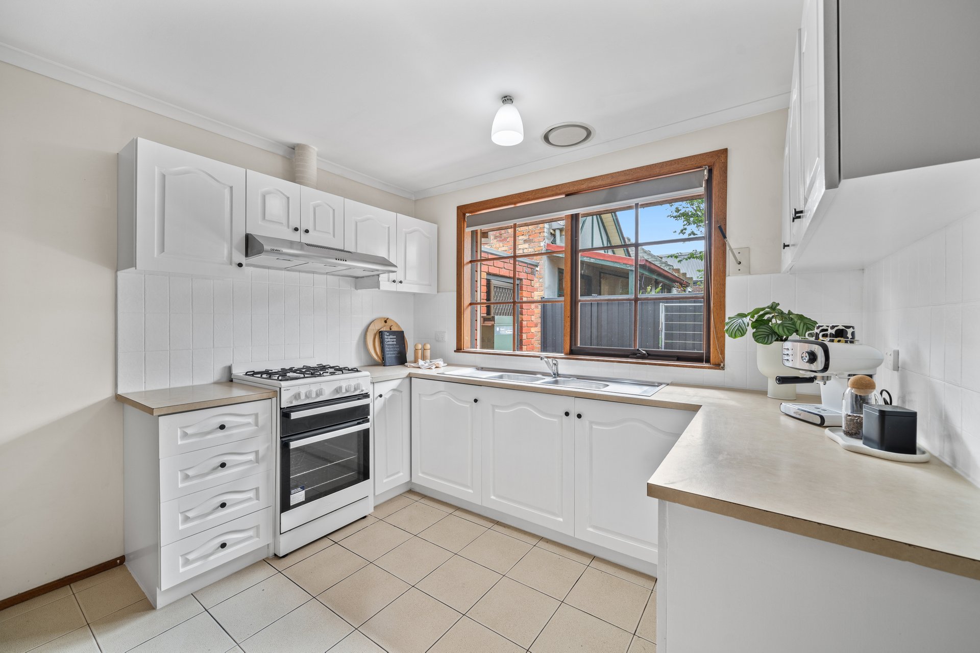 The spacious living and dining area features large windows, study nook and split system heating and cooling for year round comfort. Flowing easily into the modern kitchen, the space is perfect for relaxed everyday living. The kitchen includes stainless steel appliances, a gas cooktop, electric oven, stone look benchtops, tiled splashback and generous cabinetry with overhead storage.