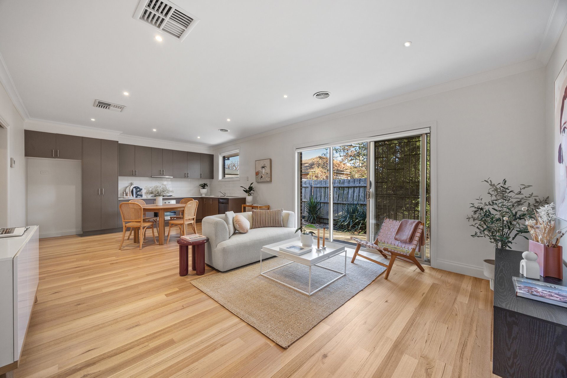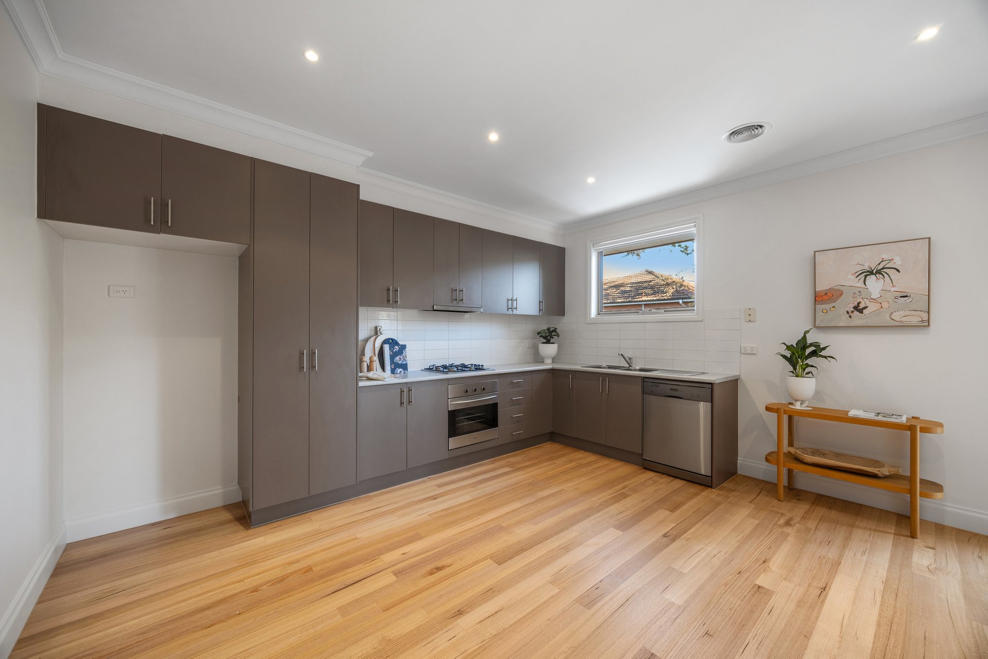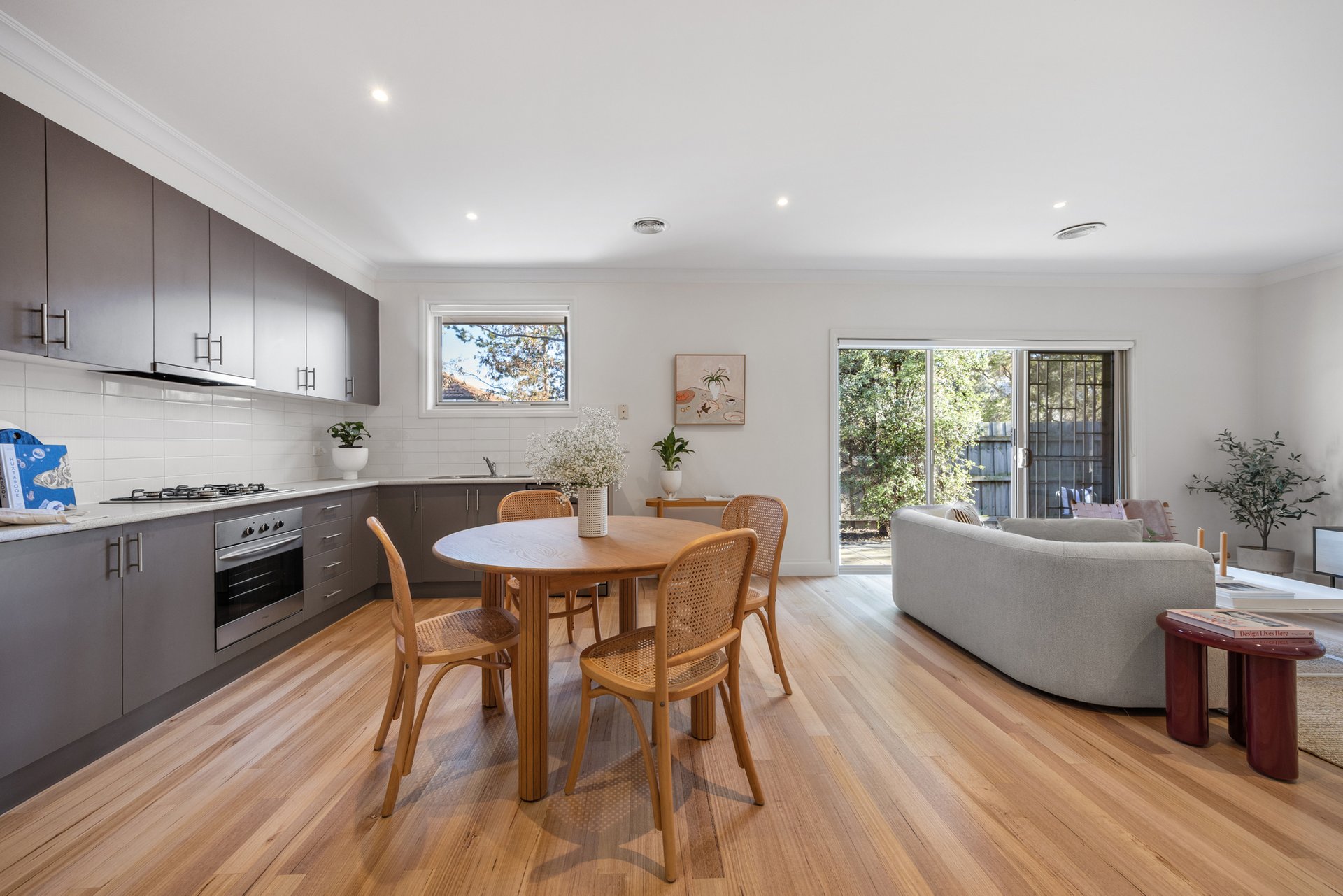 Step inside to discover an open-plan living and dining zone enhanced by hardwood flooring and filled with natural light. Sliding doors connect seamlessly to a private paved courtyard, creating an inviting space for relaxed entertaining or quiet moments outdoors. The adjoining kitchen is both practical and stylish, featuring laminate benchtops, stainless steel appliances, a gas stove, electric oven, and excellent storage with overhead and under-bench cabinetry.