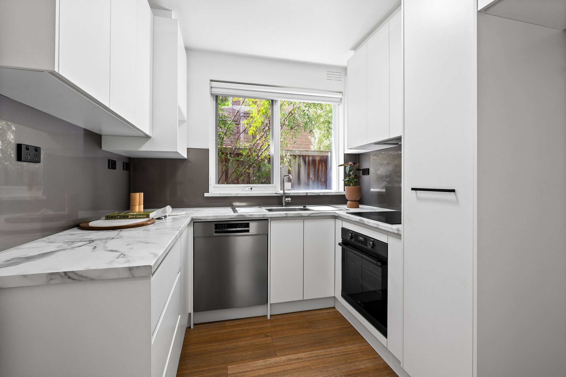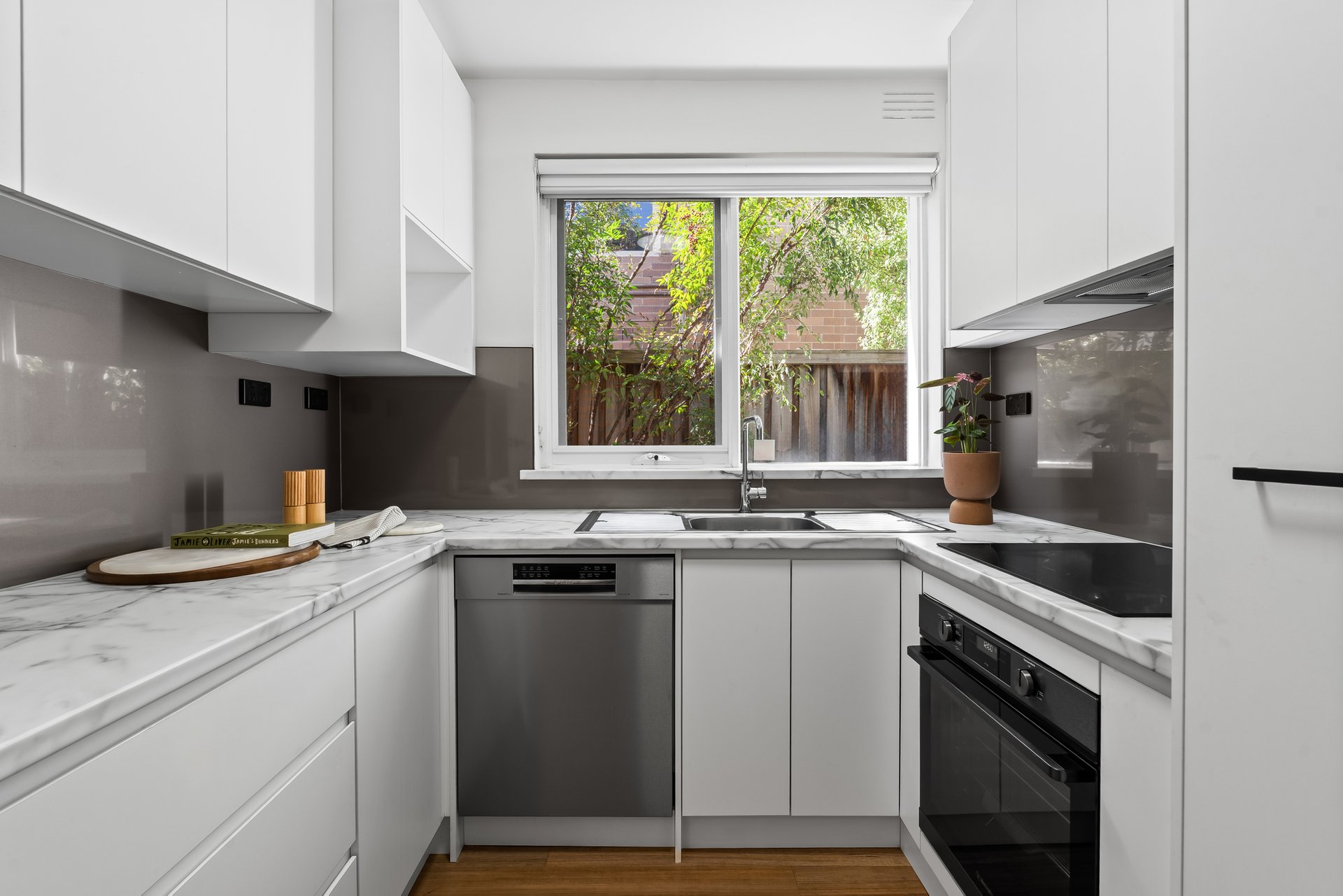The modern kitchen is both functional and stylish, featuring marble look laminate benchtops complemented by crisp white cabinetry and a grey glass splashback. Quality appliances include an induction cooktop, electric oven with air-fryer feature and dishwasher, while ample storage makes every day cooking easy and practical.