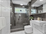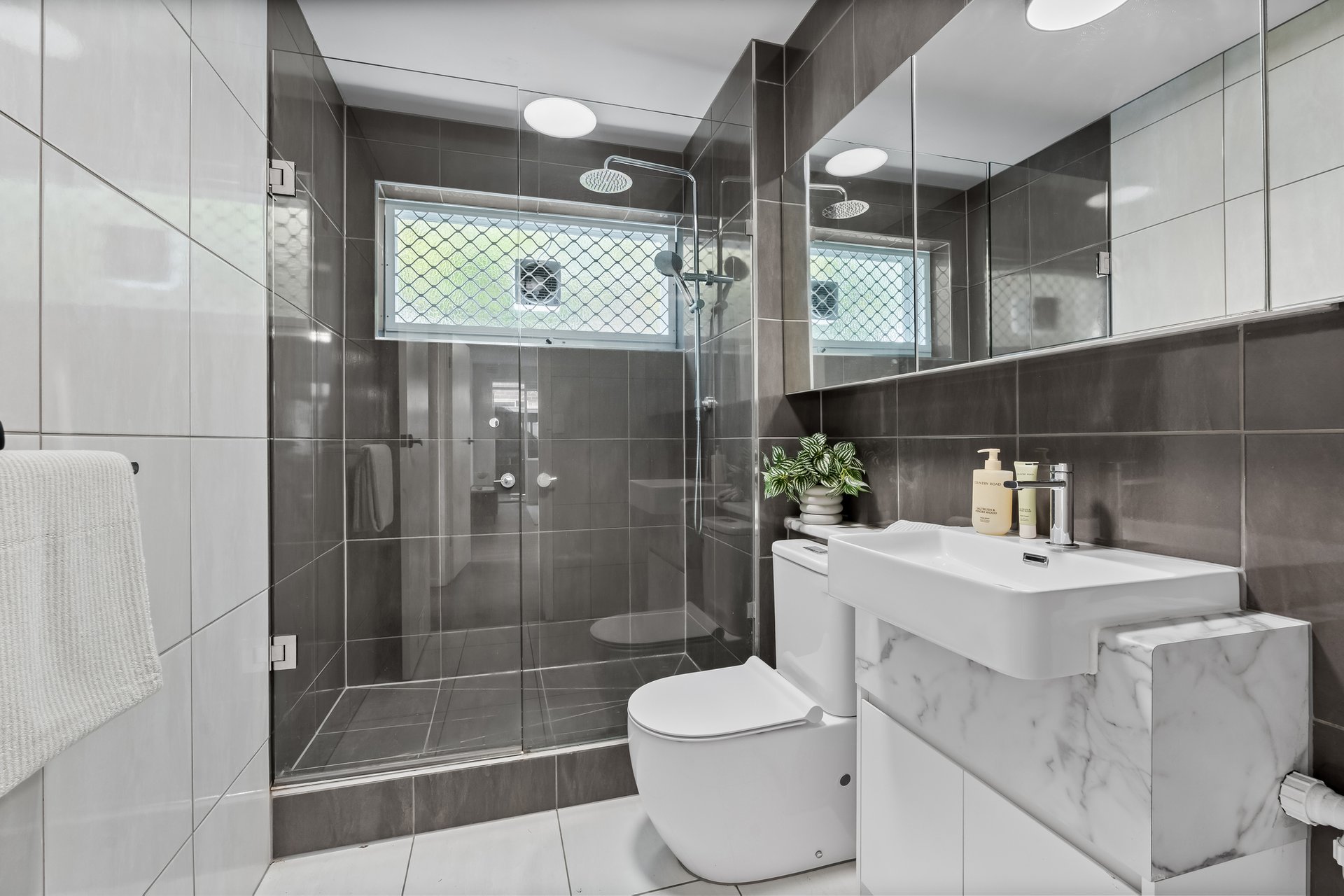 The central bathroom is beautifully finished with floor to ceiling tiles and includes a spacious glass screened shower with rainfall shower head and handheld attachment, toilet and a single vanity with cupboard storage and mirror cabinetry.