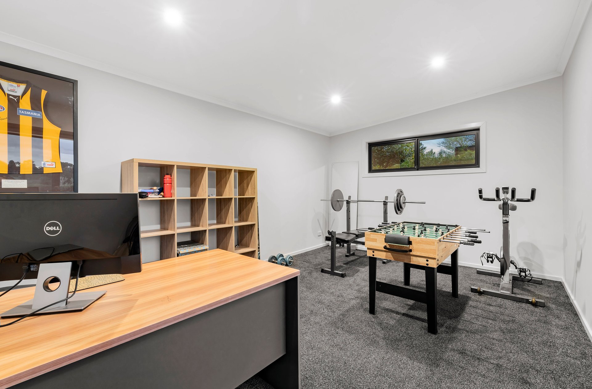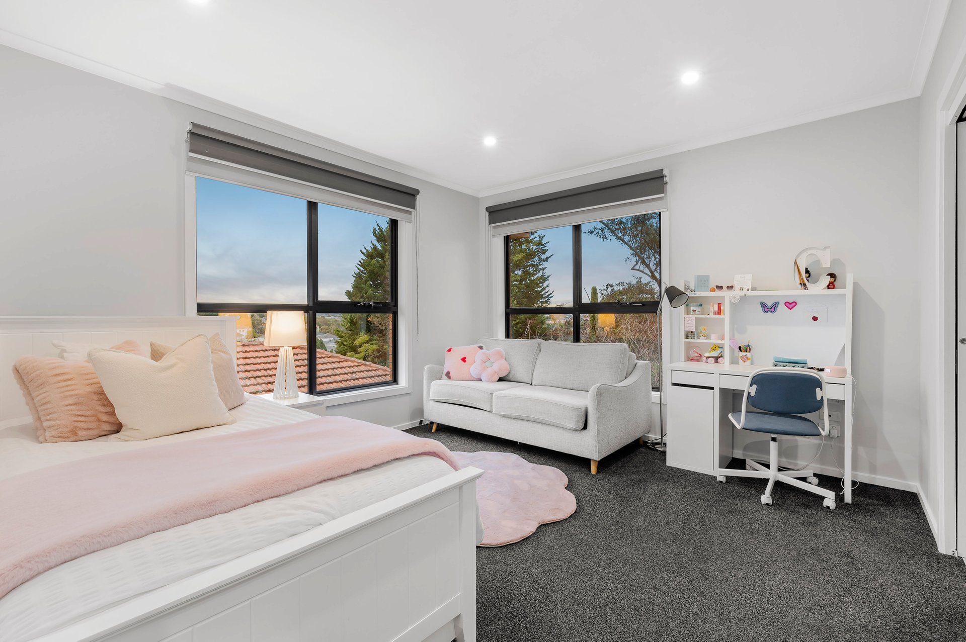 The ground floor master suite offers built-in robes, a stylish ensuite, and large windows capturing views of the welcoming front porch. A separate rumpus or study provides flexibility for a home office, media room, or children’s play space.