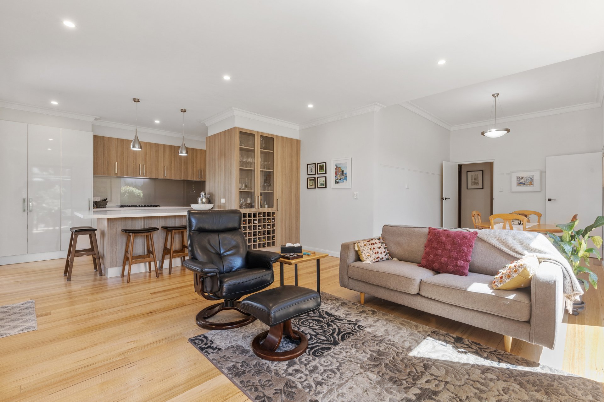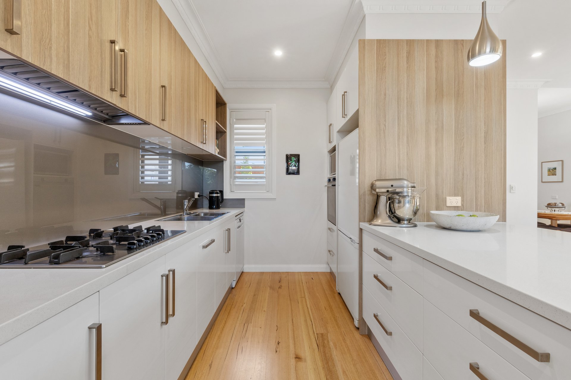 Behind its elegant façade, original double-brick rooms and soaring ceilings flow effortlessly into a light-filled open-plan living and dining domain, complemented by a gourmet kitchen. Appointed to impress, the kitchen features Ariston appliances including a pyrolytic oven, gas cooktop and dishwasher, paired with a Franke sink, stone benchtops and soft-close cabinetry. Extending to a shaded entertainer's deck, the home delivers superb indoor-outdoor integration, perfect for hosting family and friends.