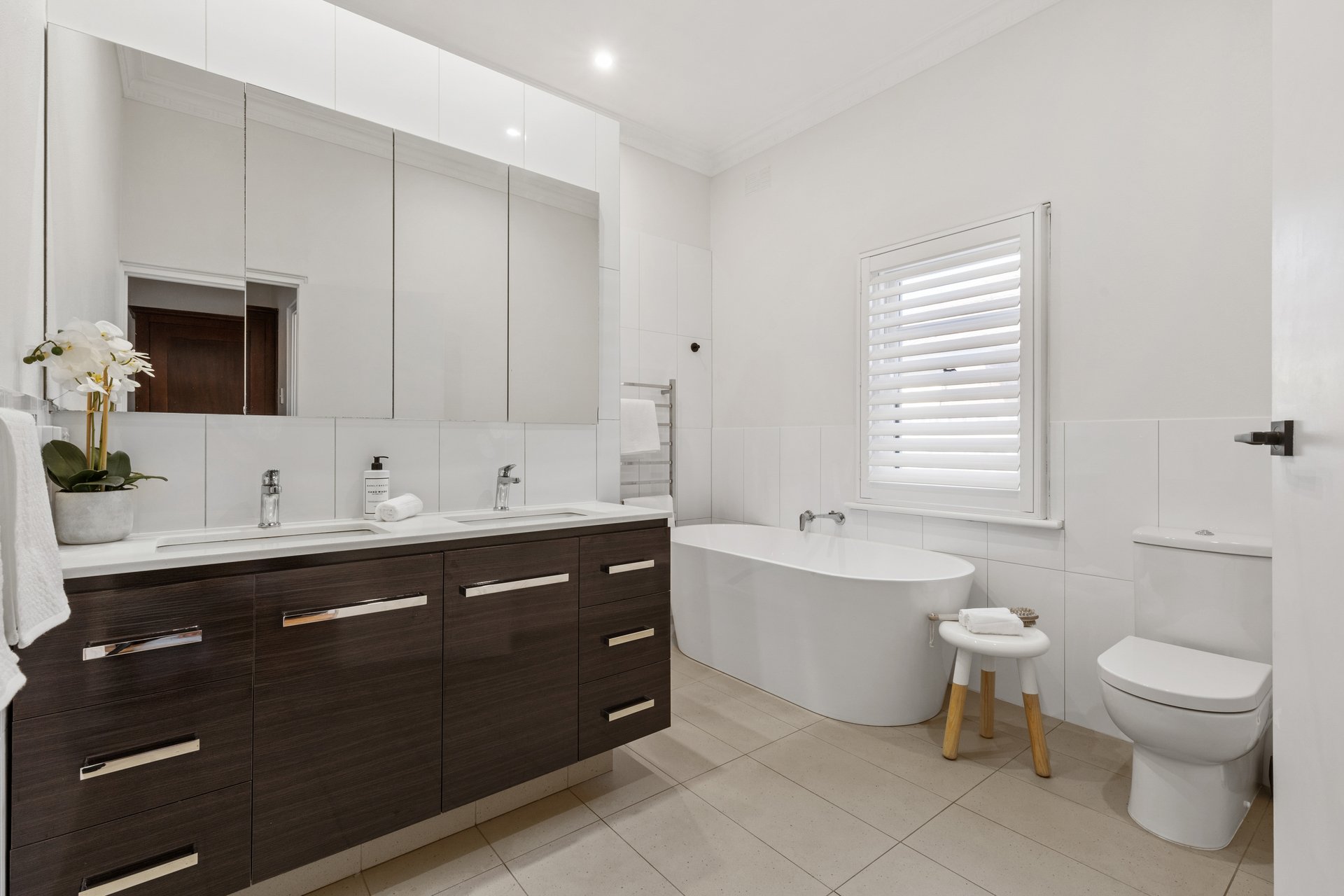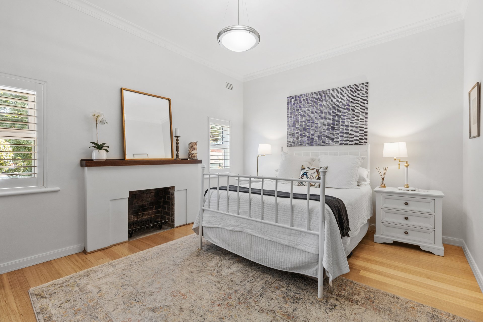 Accommodation includes two serene bedrooms, the main with a walk-in robe, while the luxurious bathroom showcases a deep freestanding bath, walk-in shower and dual stone-topped vanity. Further highlights comprise polished timber flooring, plantation shutters, heating and cooling, a picturesque front garden and off-street parking for two vehicles.