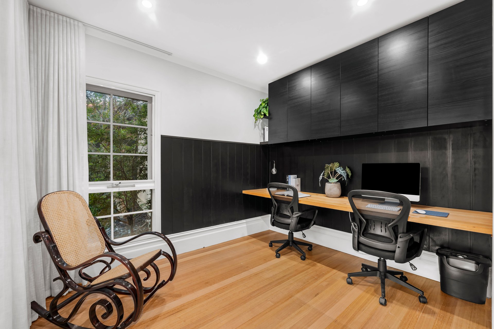 A designated office or study with a two-person desk and built-in cabinetry caters to home-based workers or students, with a powder room nearby for guest convenience.