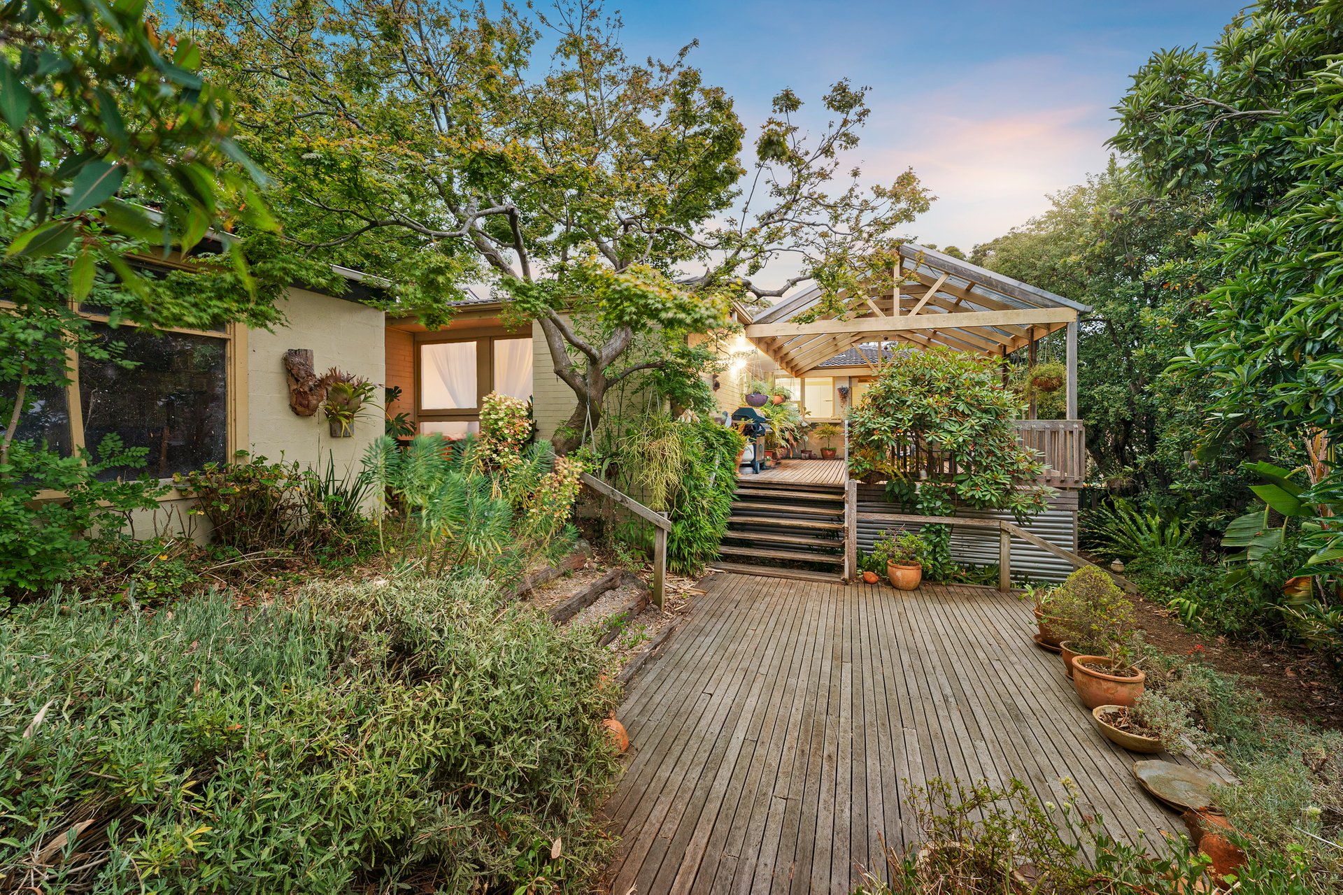 Out amongst the gardens, a lower deck, perfect for cooking a barbeque, has steps up to a workshop with power and a sink, opening the possibility of conversion into a studio or office.