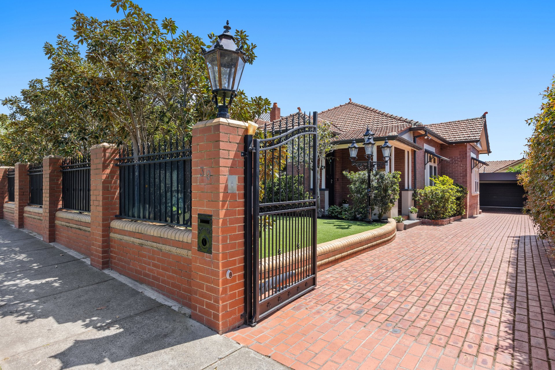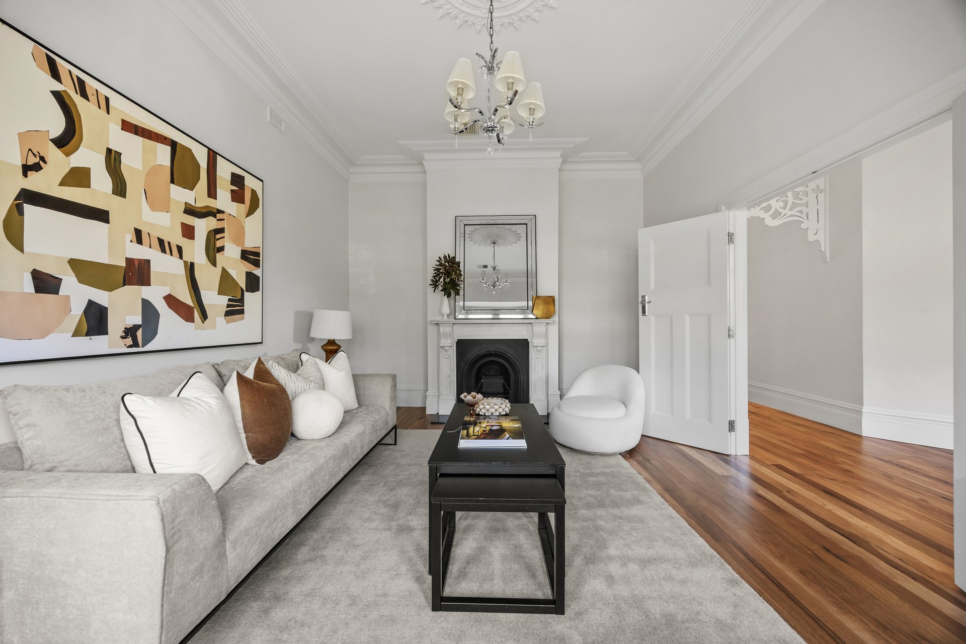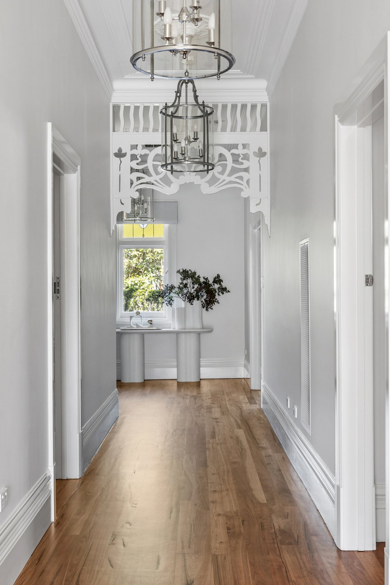 Beyond secure wrought-iron gates and manicured gardens, a grand hallway reveals polished timber floors, ornate fretwork and intricate ceiling roses.