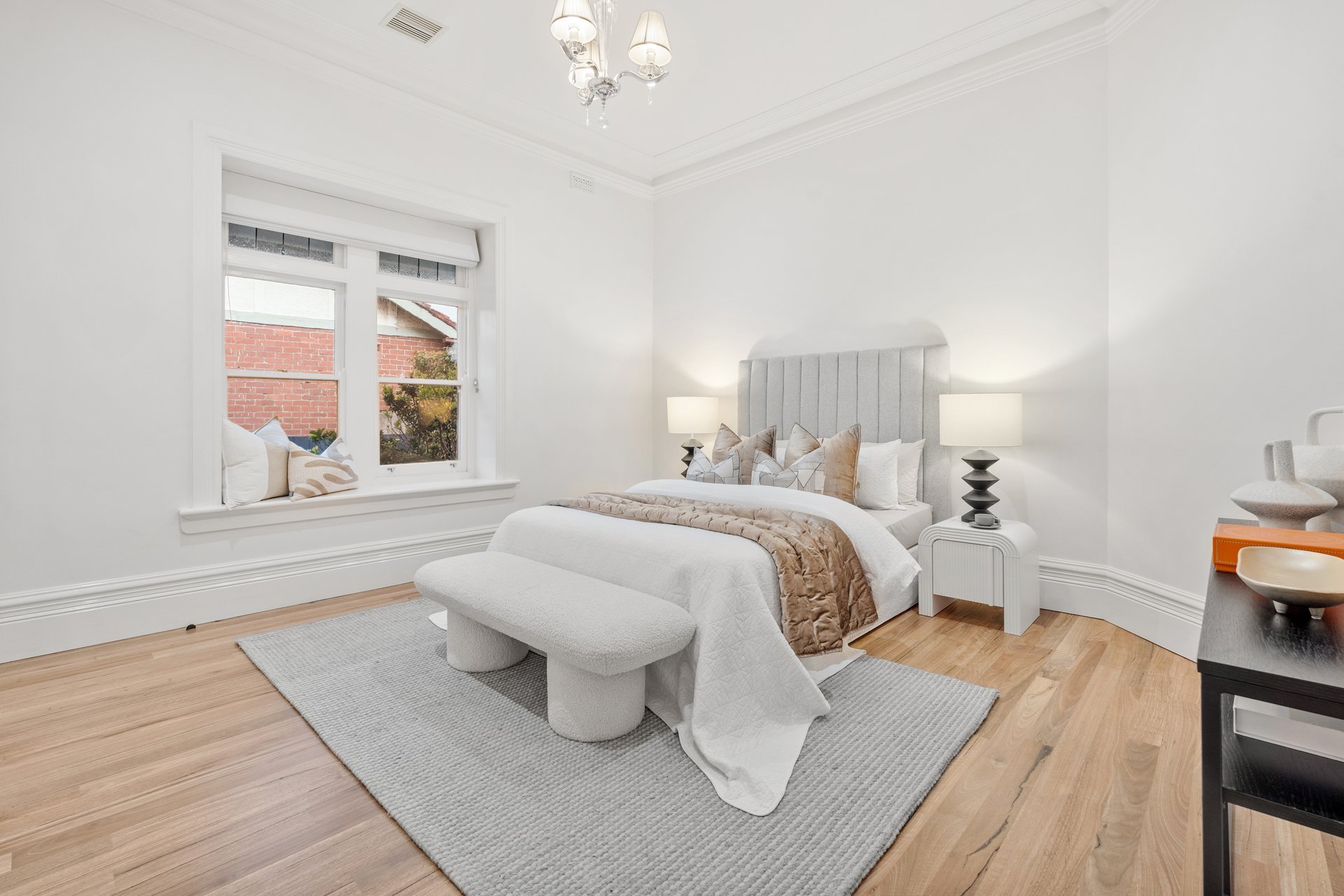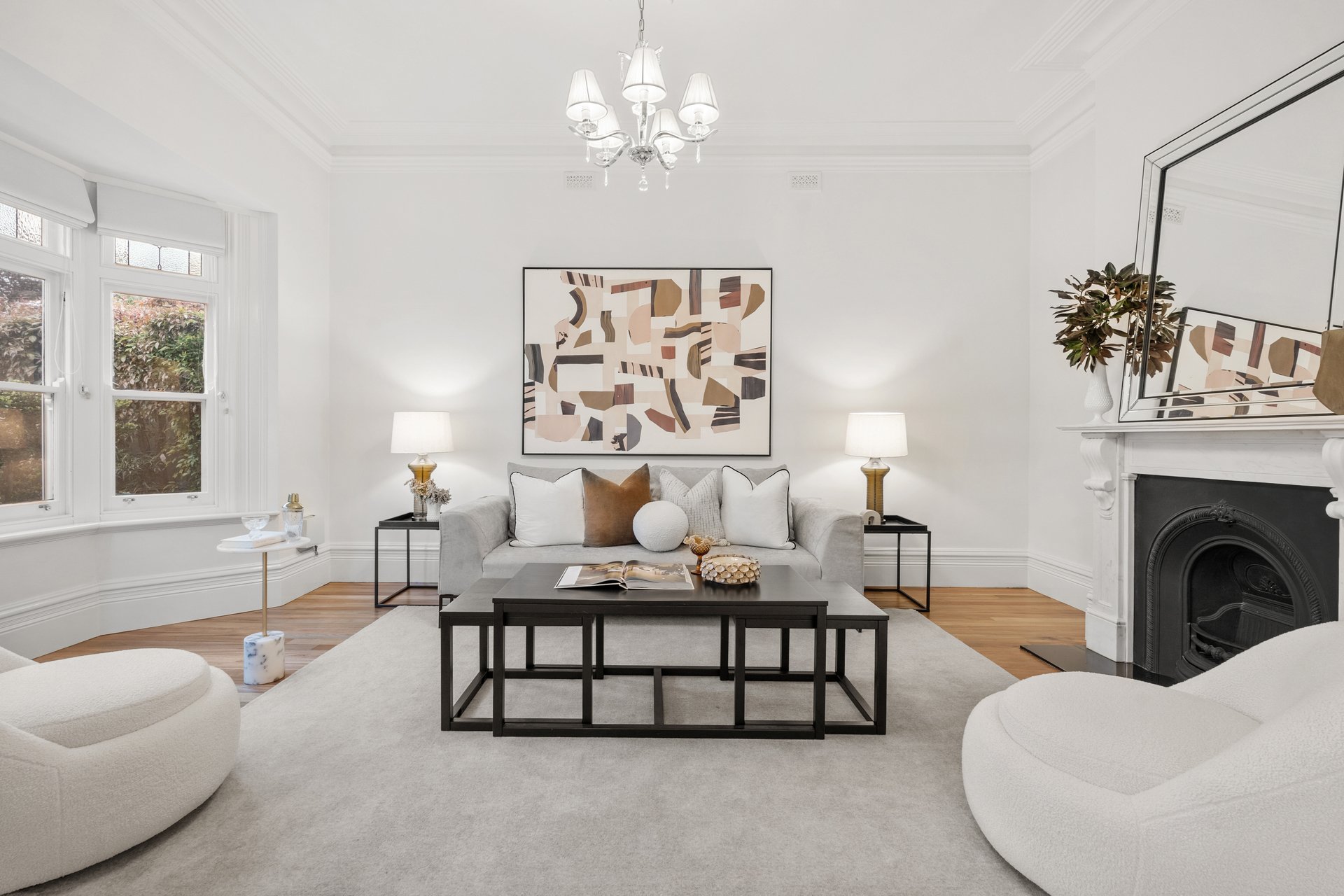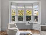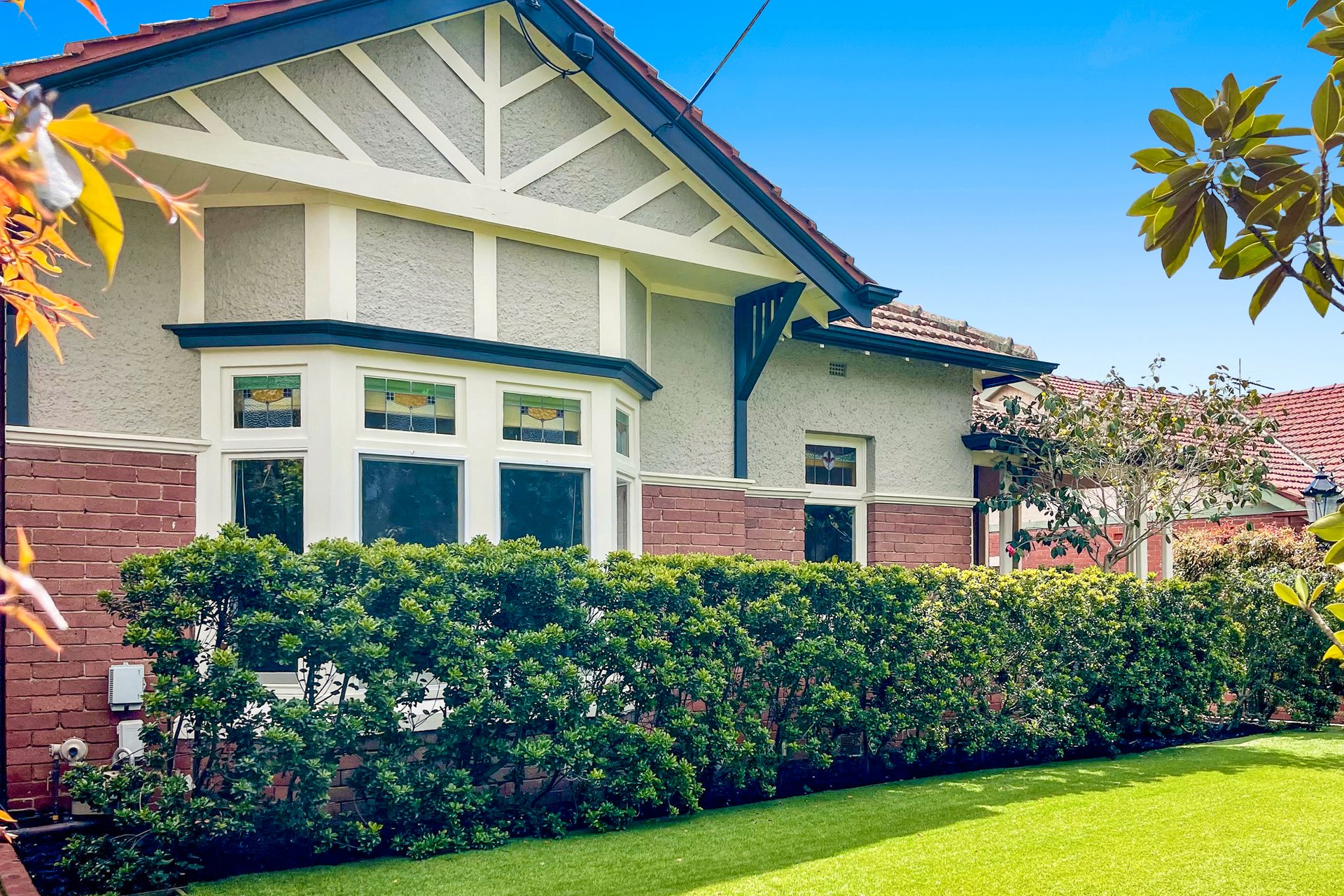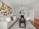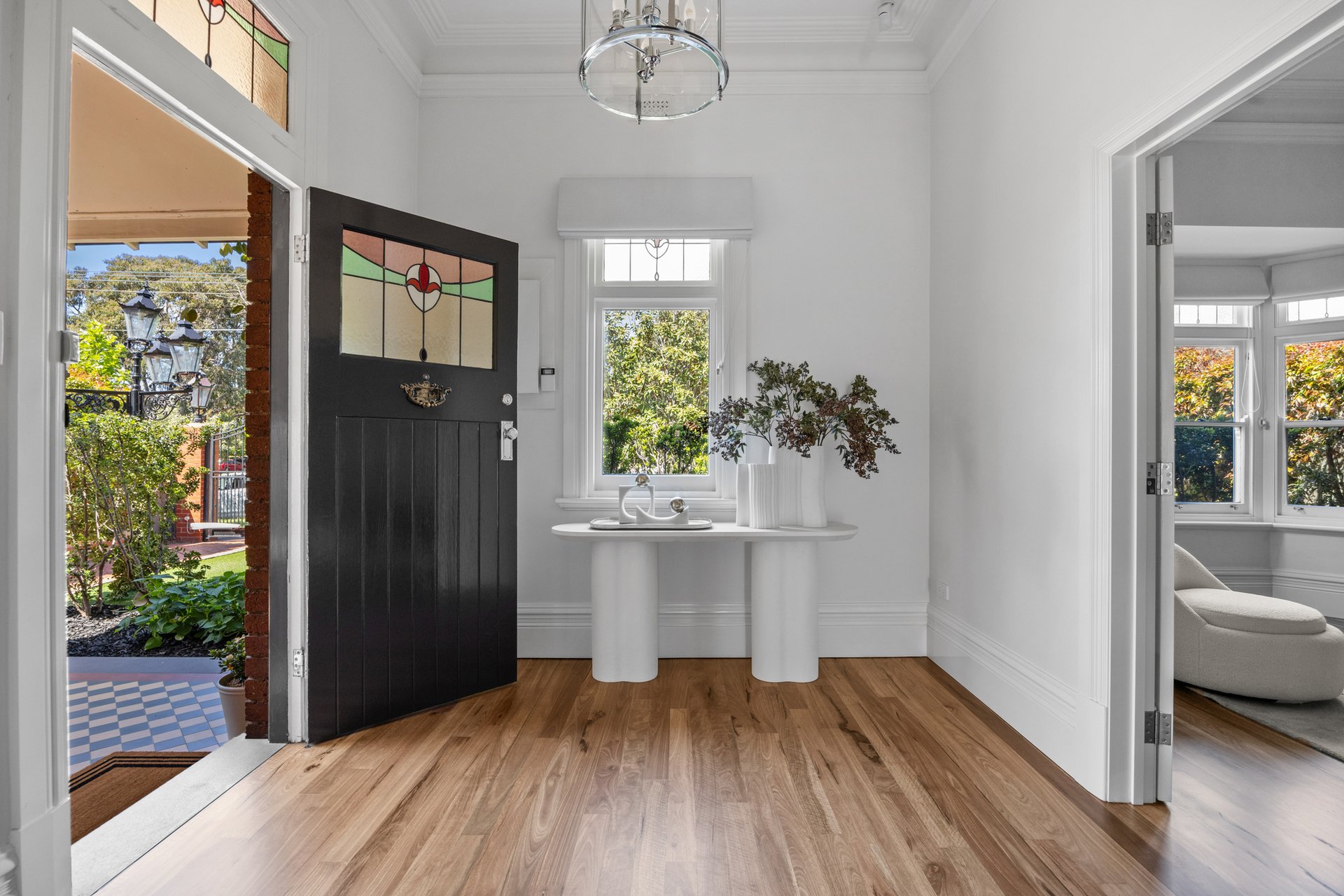The front room, featuring a marble fireplace and stained-glass bay window, makes an inviting formal lounge or optional fourth bedroom, while three additional bedrooms showcase bespoke timber joinery and built-in robes.