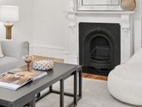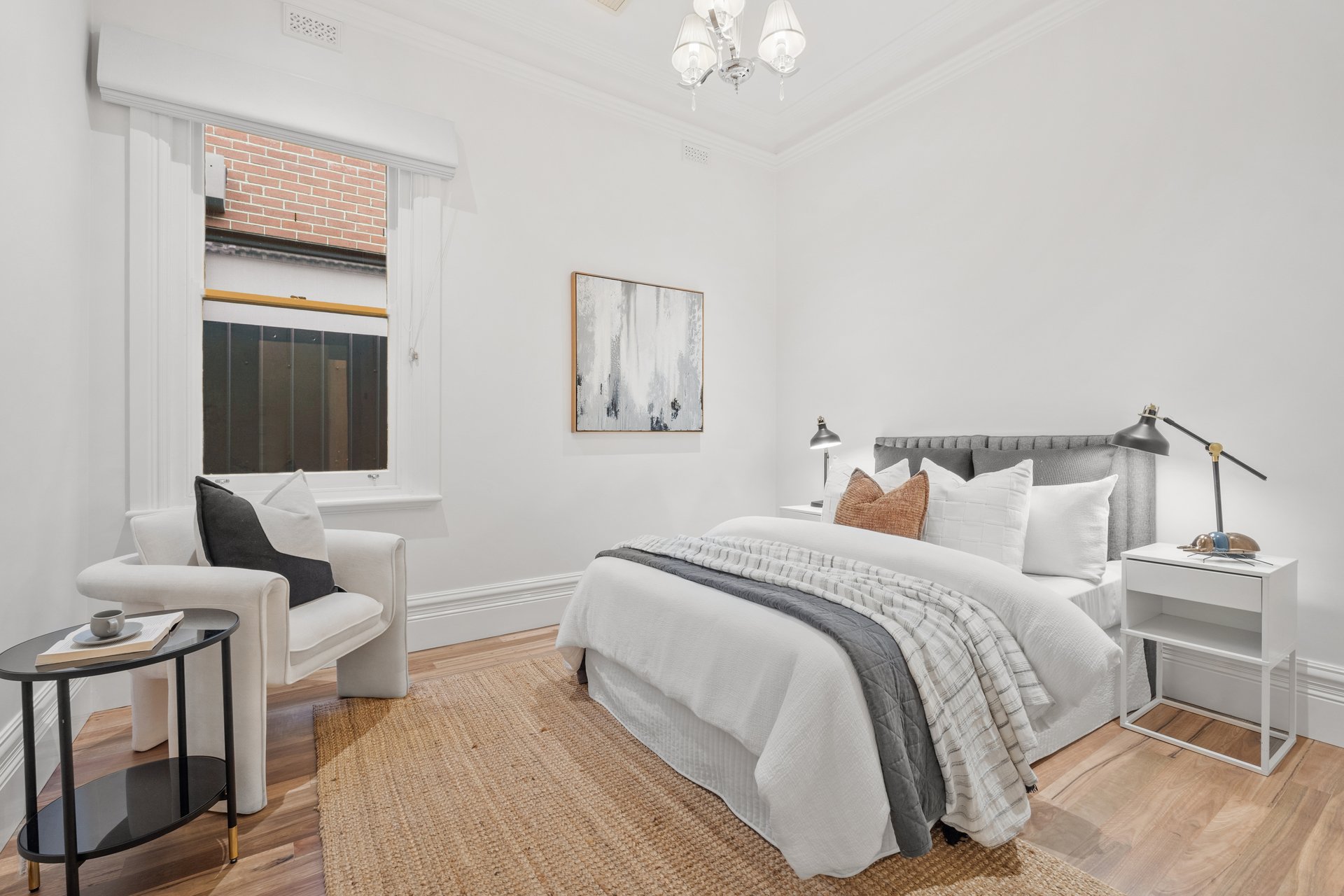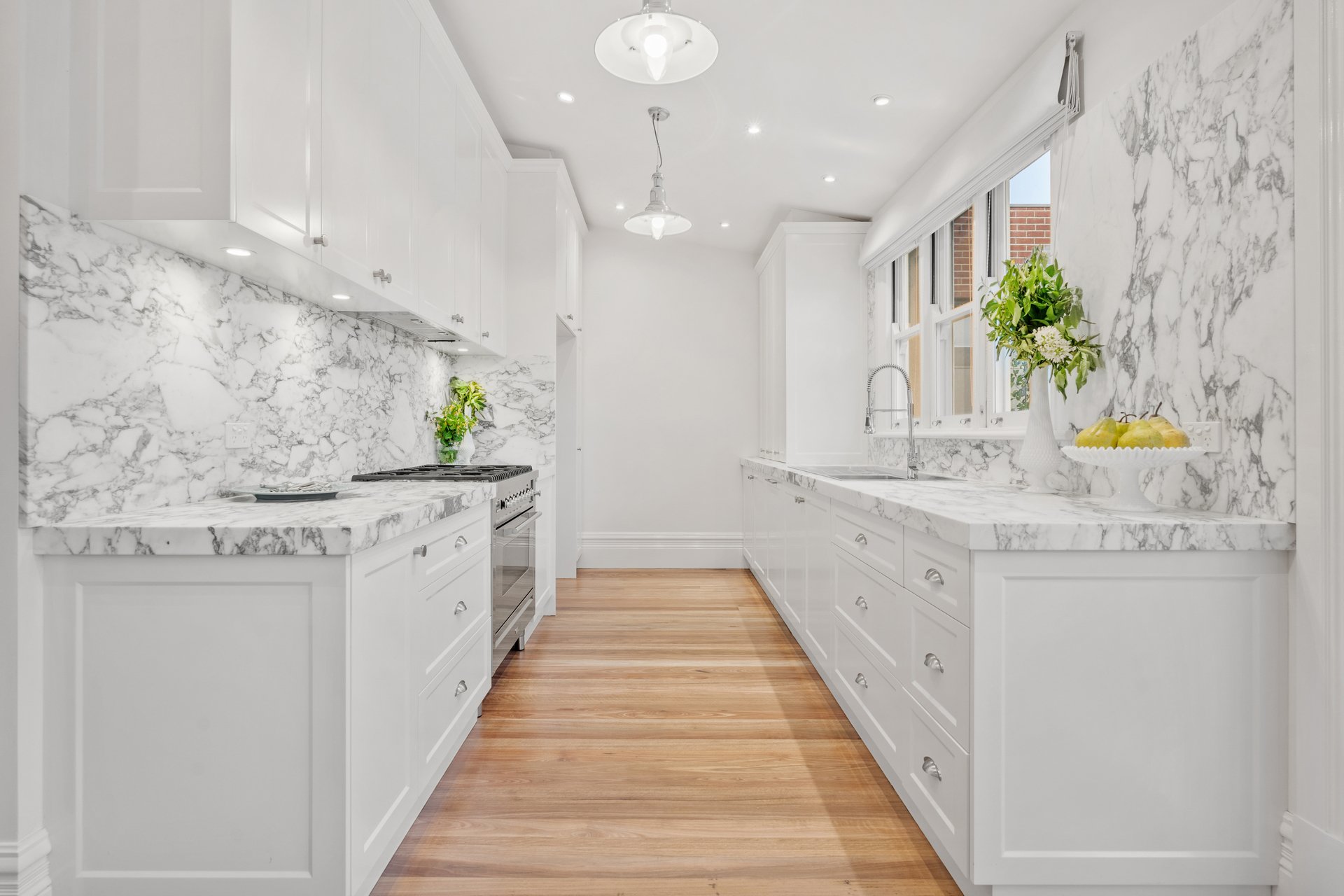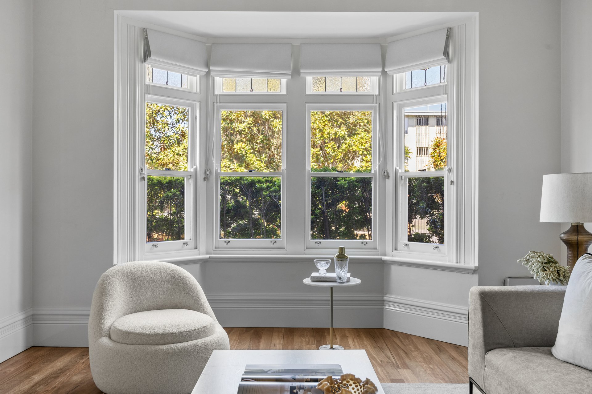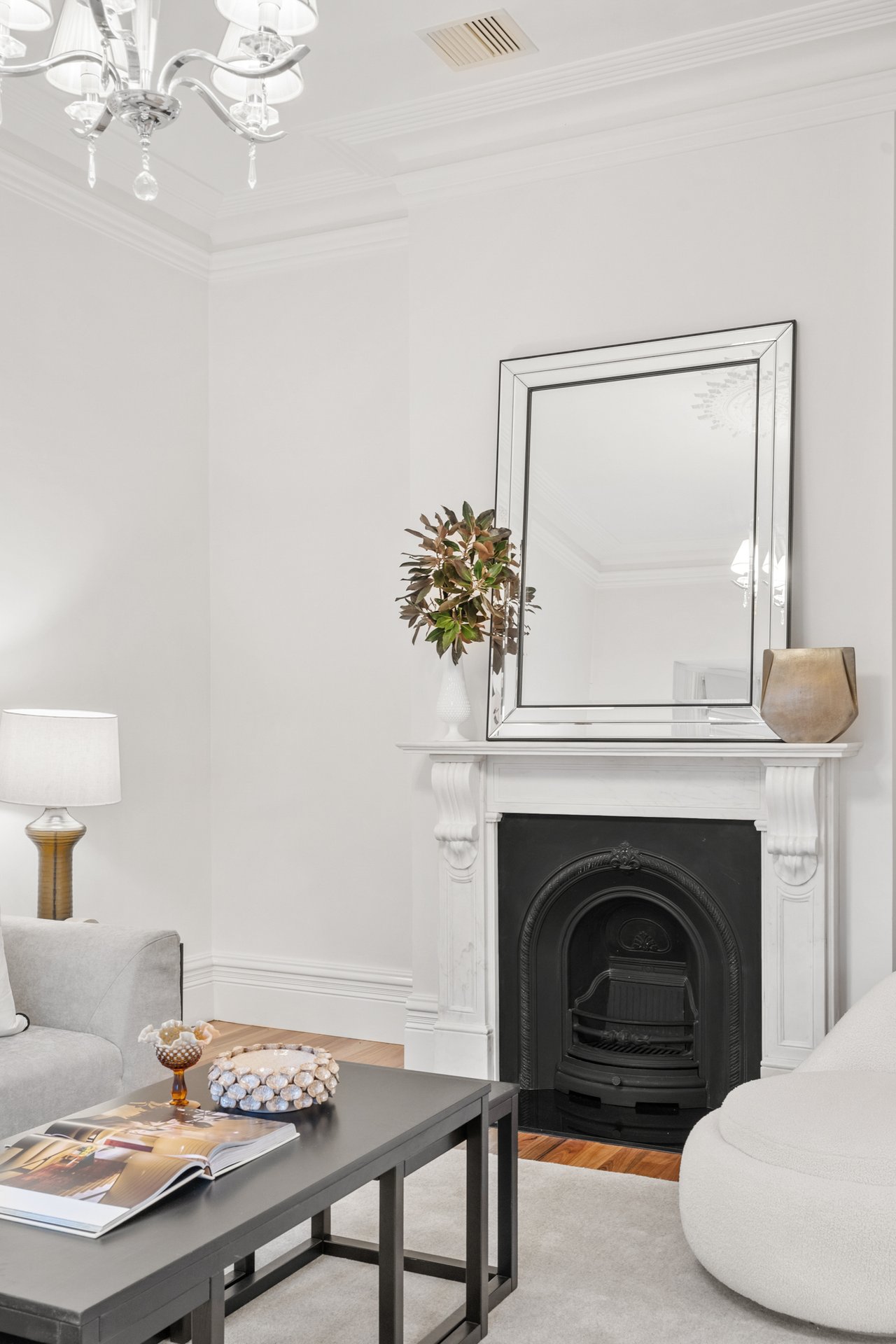 The front room, featuring a marble fireplace and stained-glass bay window, makes an inviting formal lounge or optional fourth bedroom, while three additional bedrooms showcase bespoke timber joinery and built-in robes.