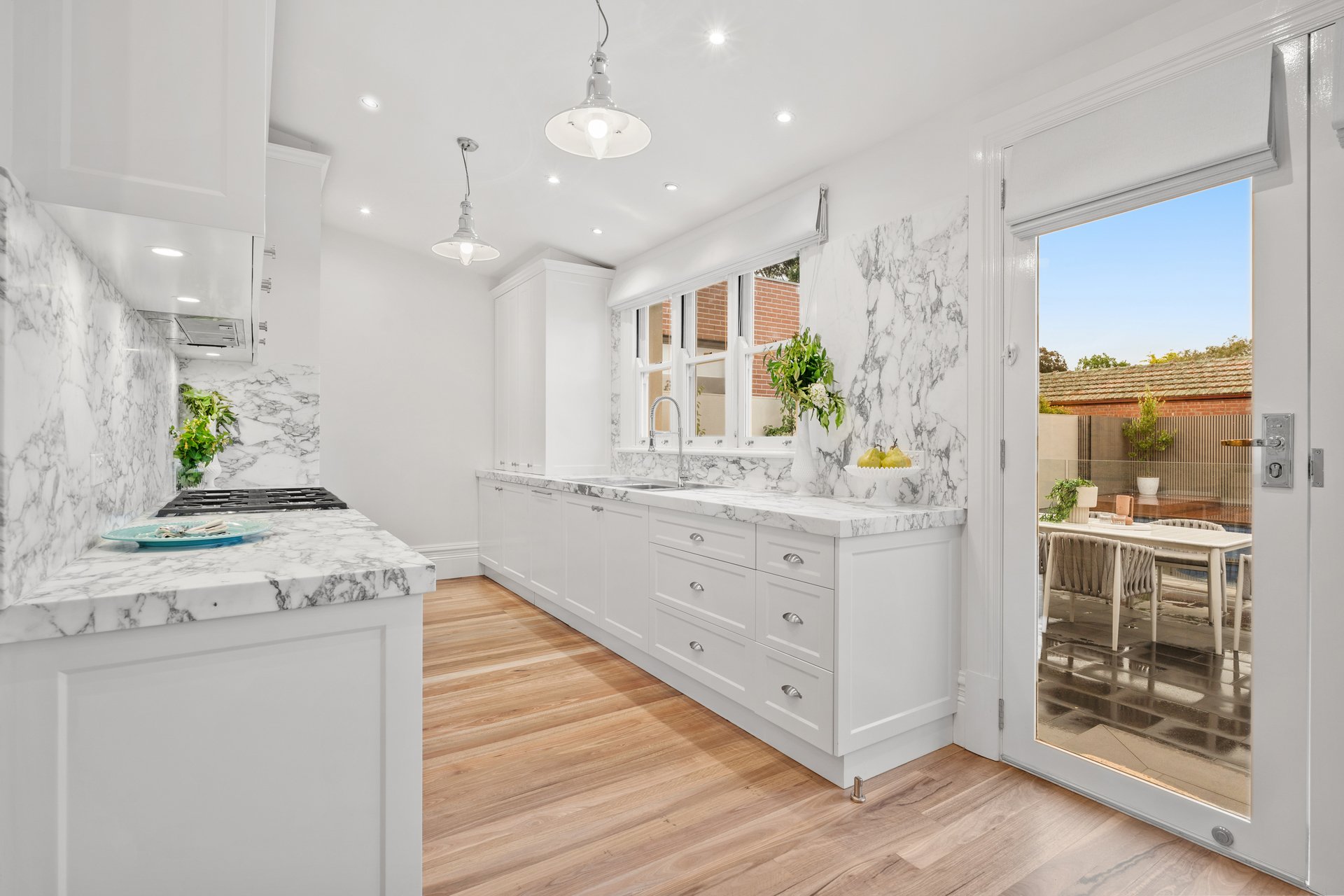 At the heart of the home, the gourmet kitchen and dining zone is a triumph of design - highlighted by a 90 cm Ilve freestanding cooker, integrated Miele dishwasher, Franke double sink, and Italian Arabescato Vagli marble benchtops and splashbacks.