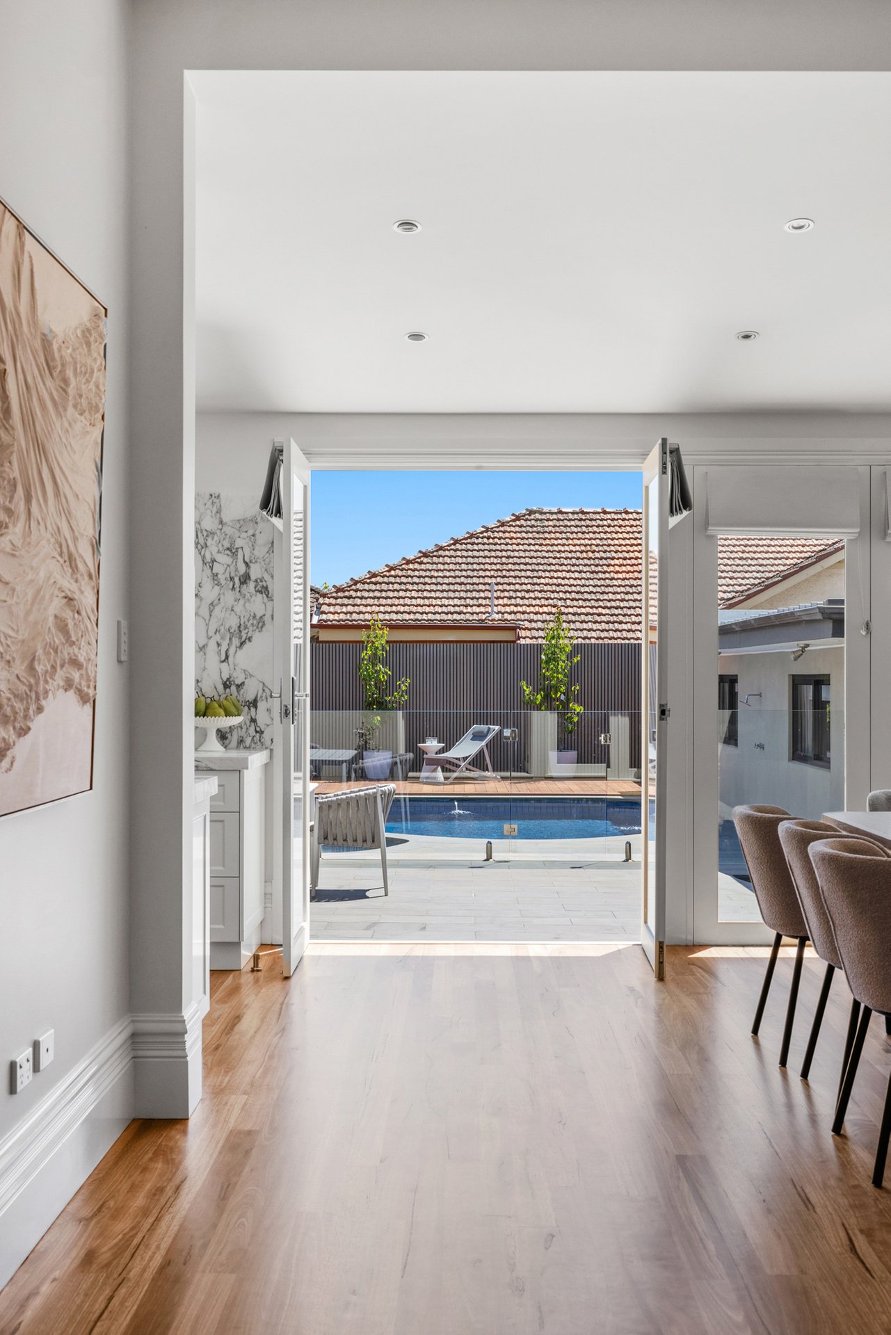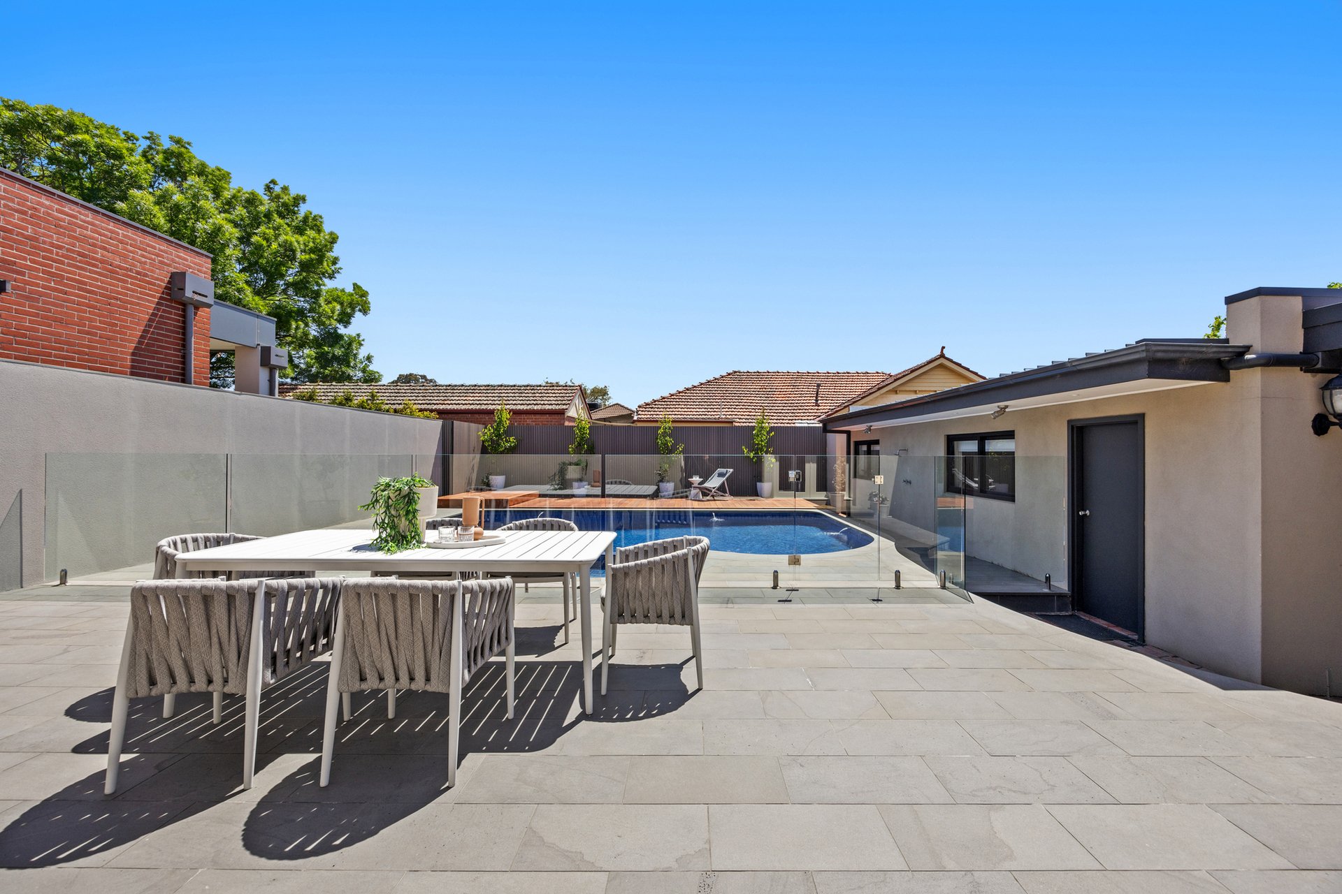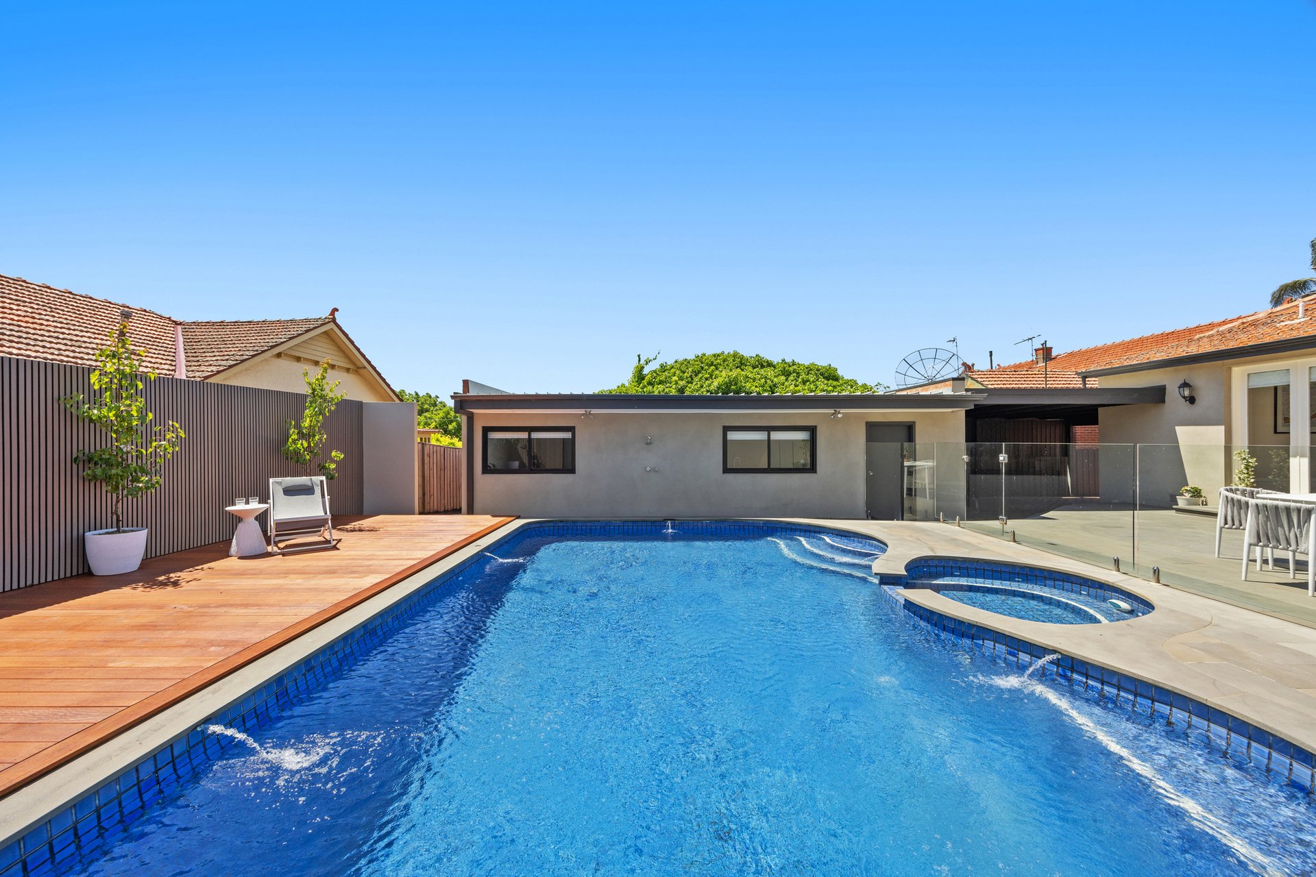 The spacious open-plan living area flows effortlessly to the north-facing rear yard where resort-style entertaining takes centre stage with a heated in-ground pool and spa, bluestone paving, timber decking and outdoor shower - the perfect setting for family relaxation and entertaining.