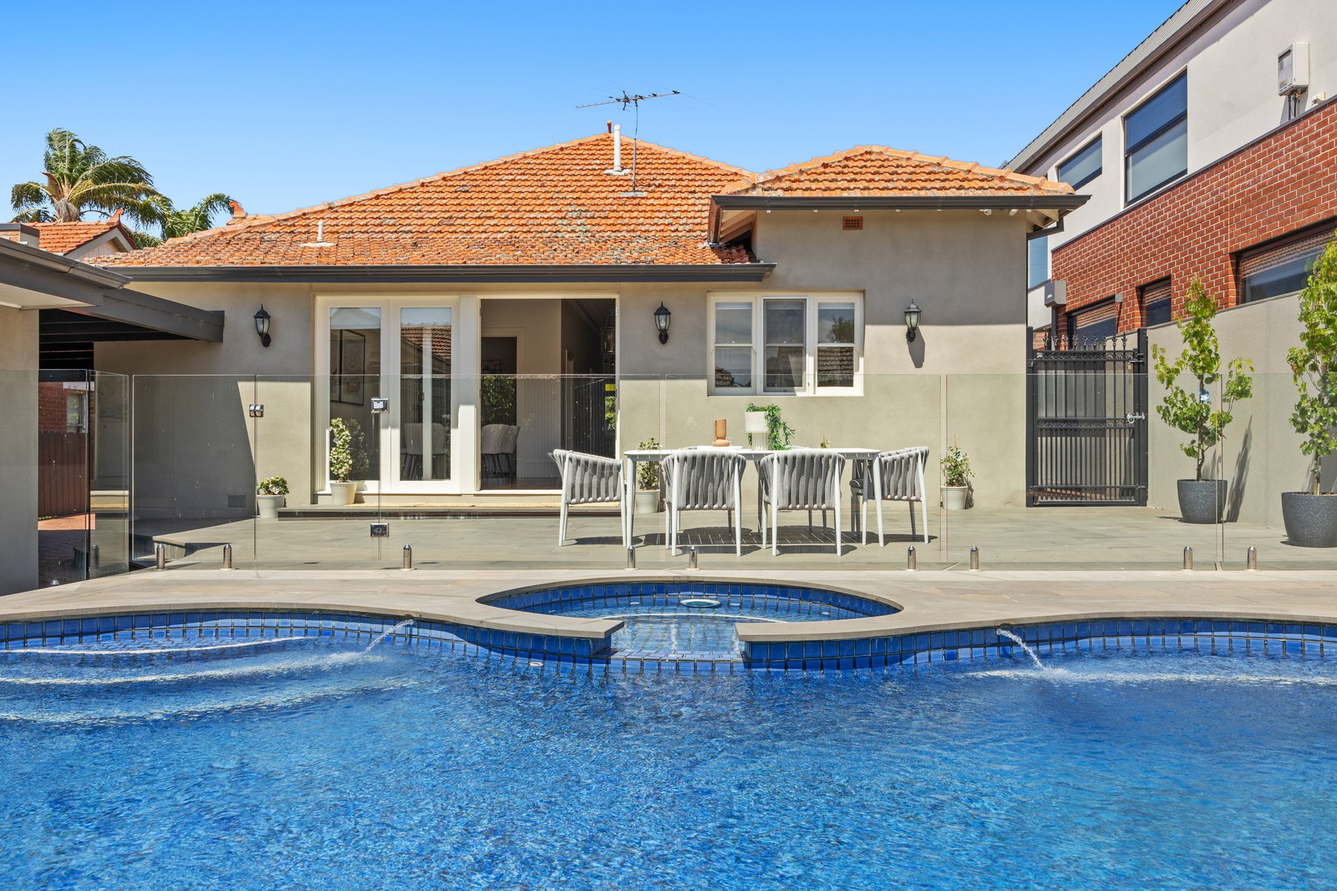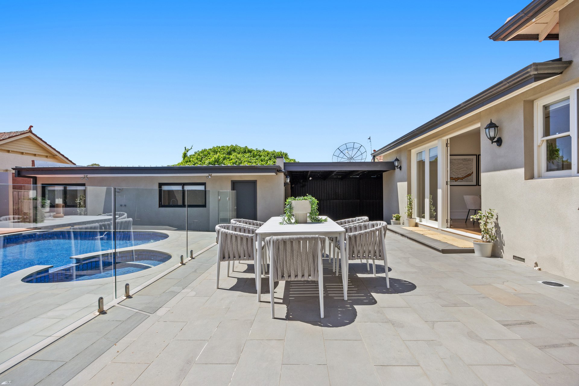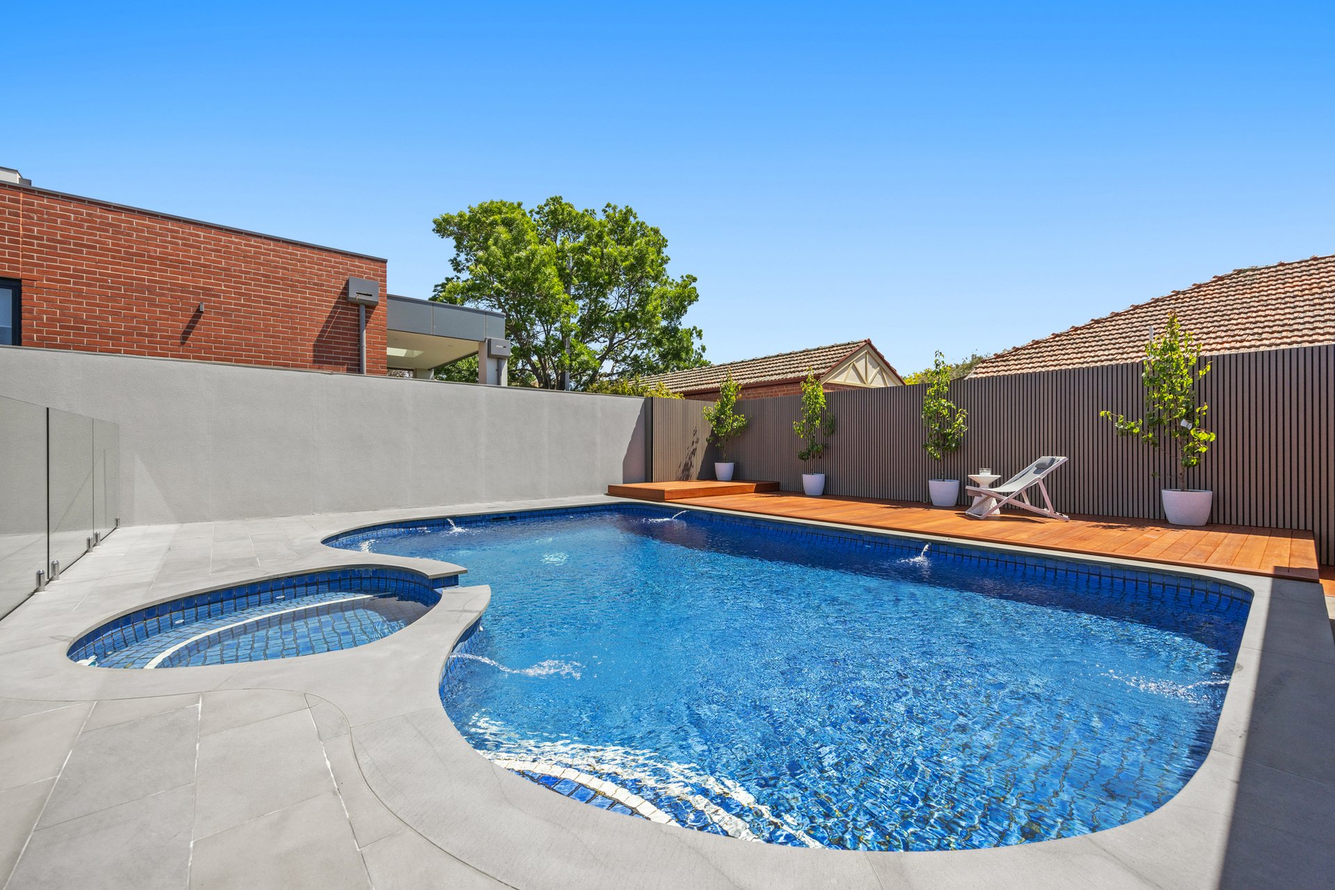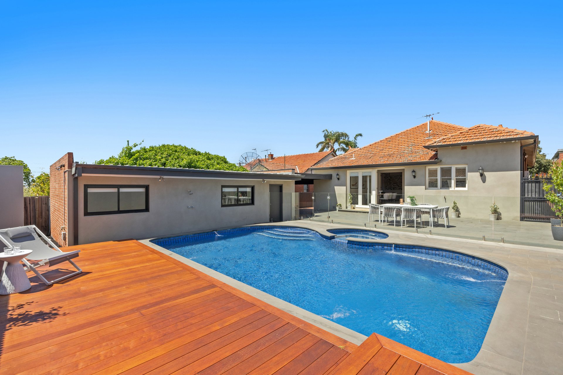 The spacious open-plan living area flows effortlessly to the north-facing rear yard where resort-style entertaining takes centre stage with a heated in-ground pool and spa, bluestone paving, timber decking and outdoor shower - the perfect setting for family relaxation and entertaining.