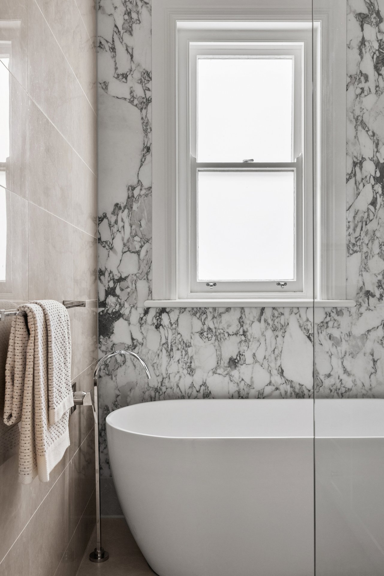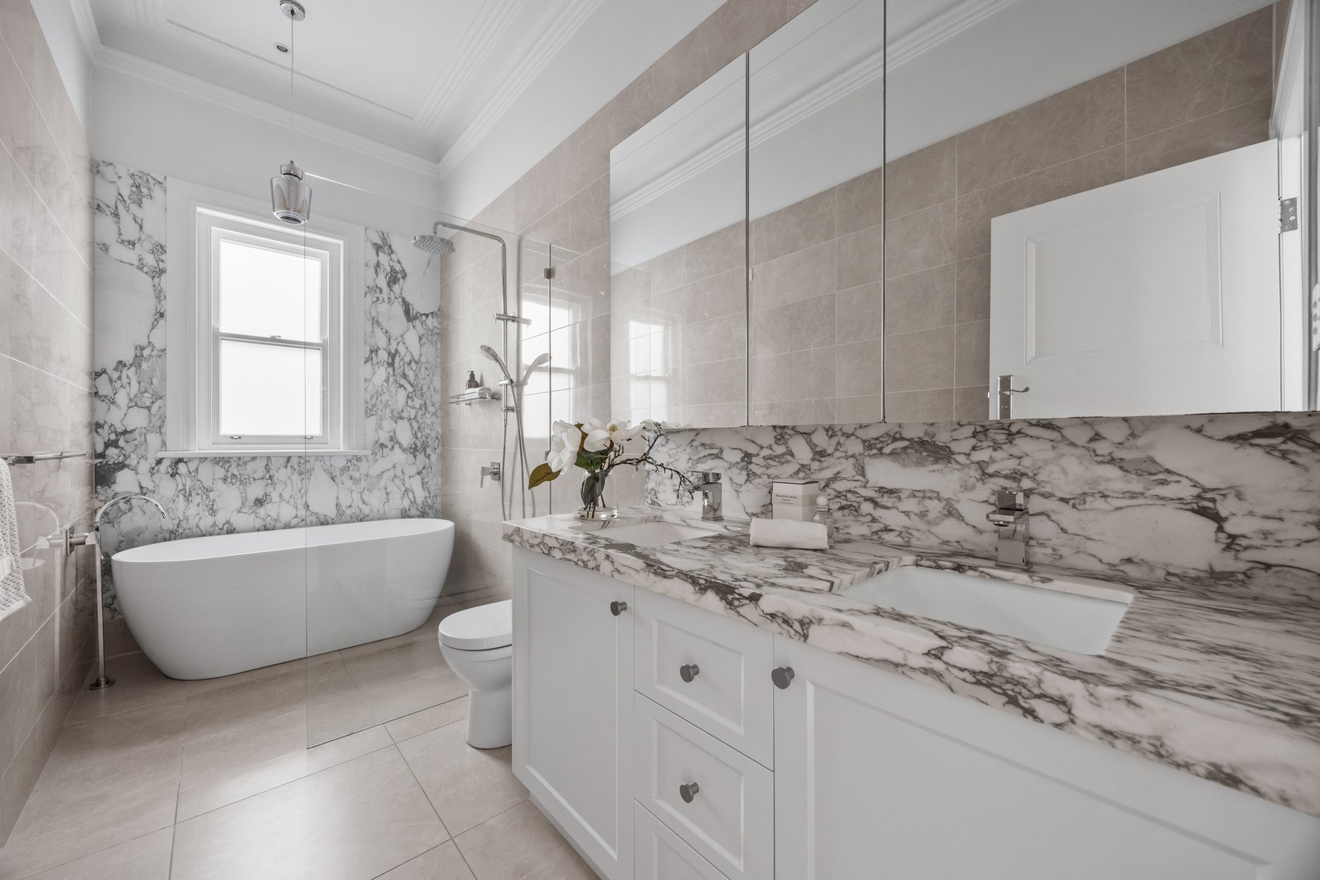 Bathrooms exude hotel-style indulgence with Italian marble, a freestanding bath, frameless showers, Grohe tapware and Villeroy & Boch fittings.