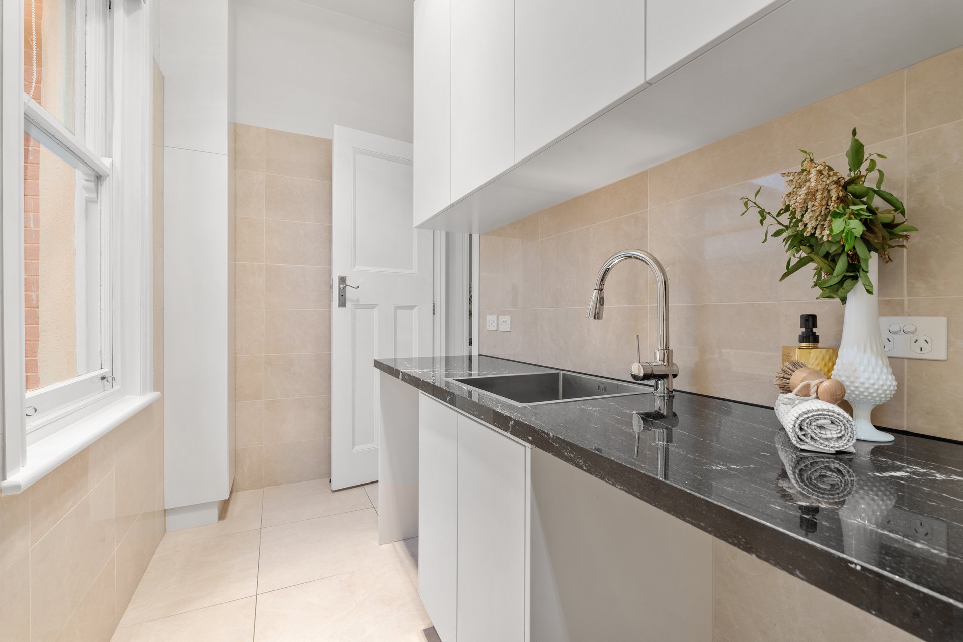 Additional features include a black granite laundry, refrigerated heating and cooling, handle-free cabinetry and polished spotted-gum floors throughout.