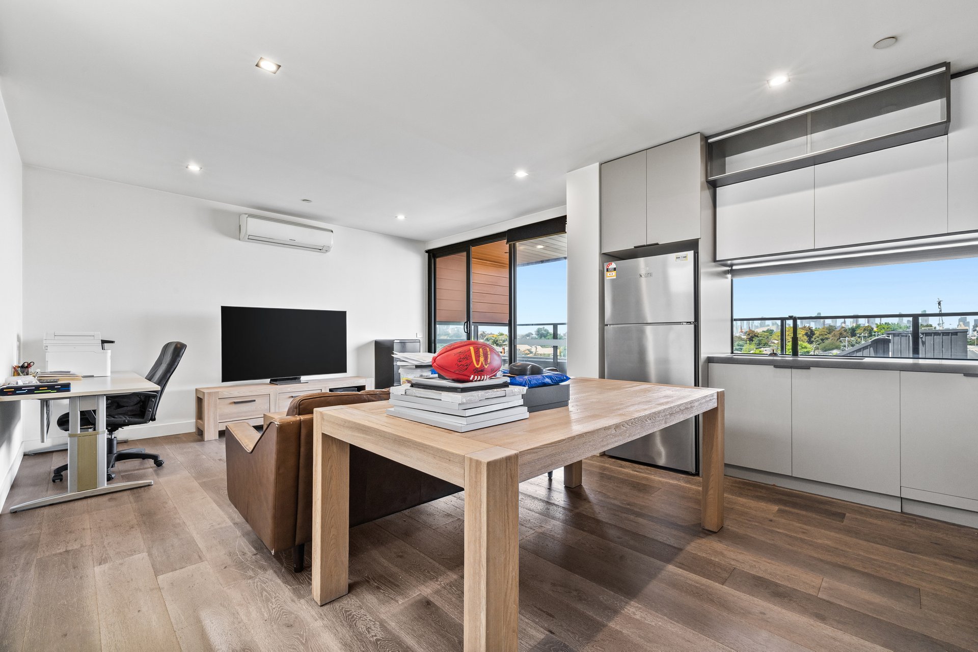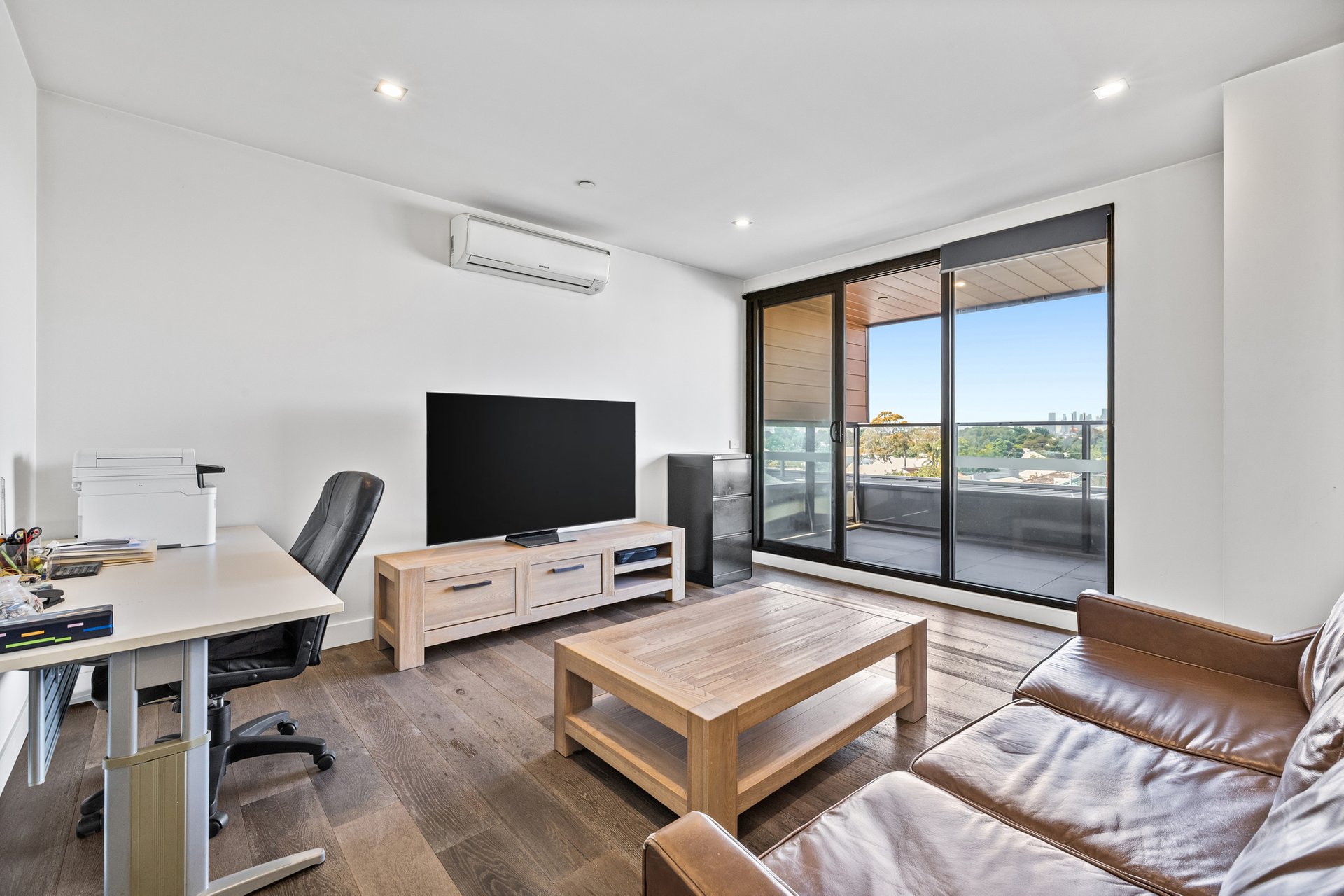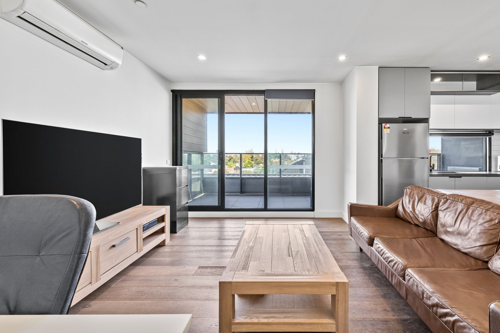 Inside, the home is defined by open-plan living and an abundance of natural light. A spacious living and dining zone features engineered timber flooring, downlights and large windows that draw in city-facing outlooks, extending seamlessly to a generous balcony that is partially undercover and perfect for year-round use. Climate comfort is assured with Samsung split-system air conditioning to both the living area and bedroom.
