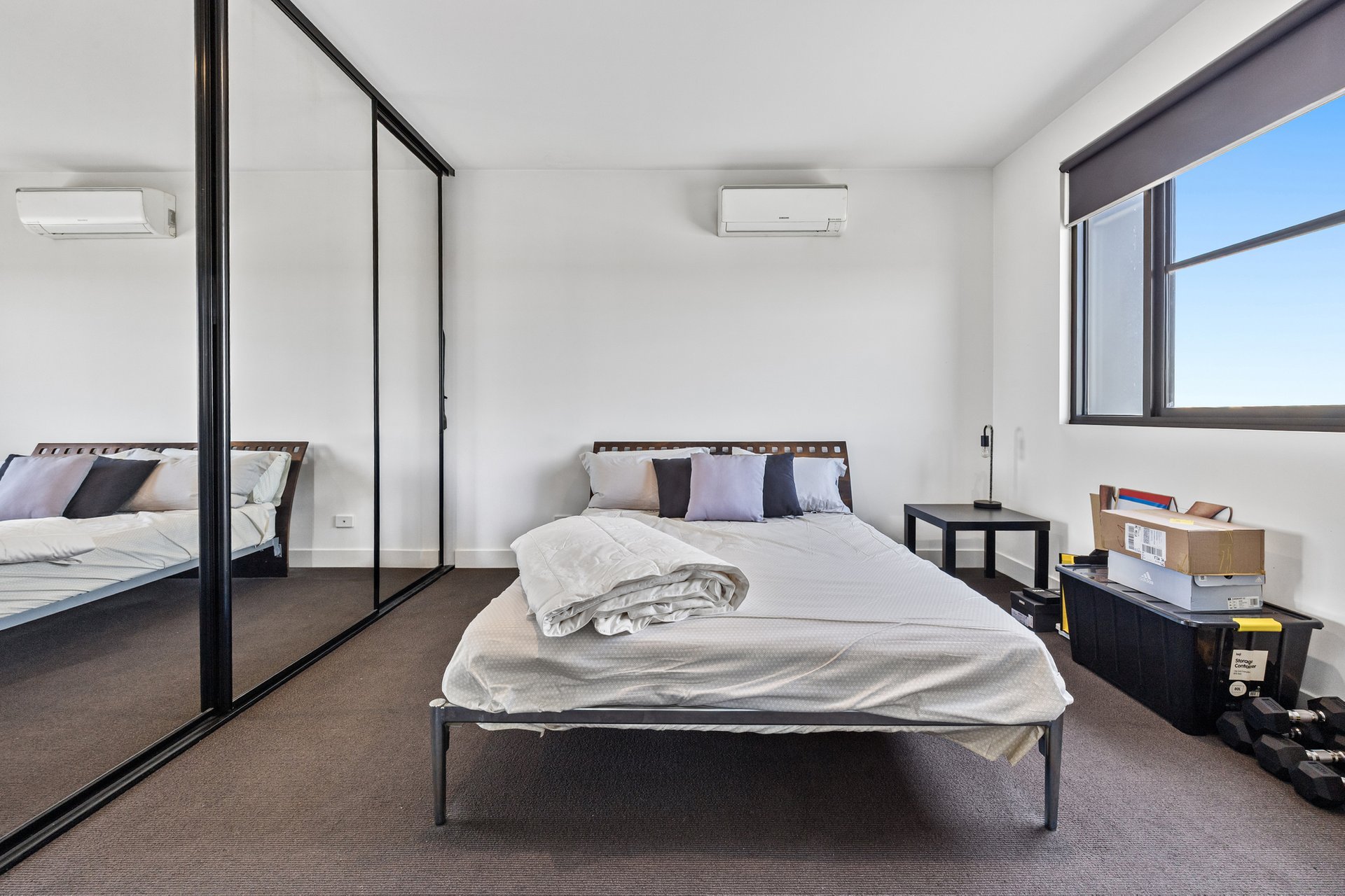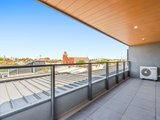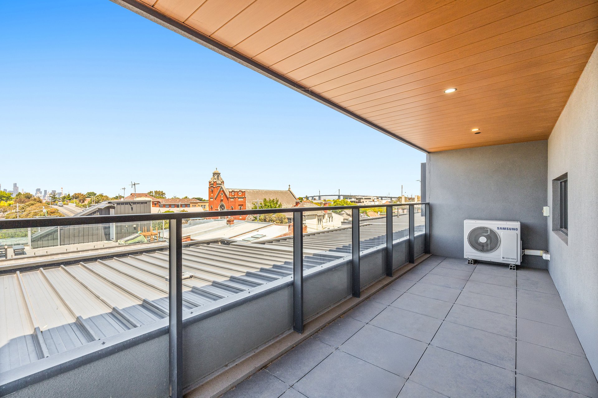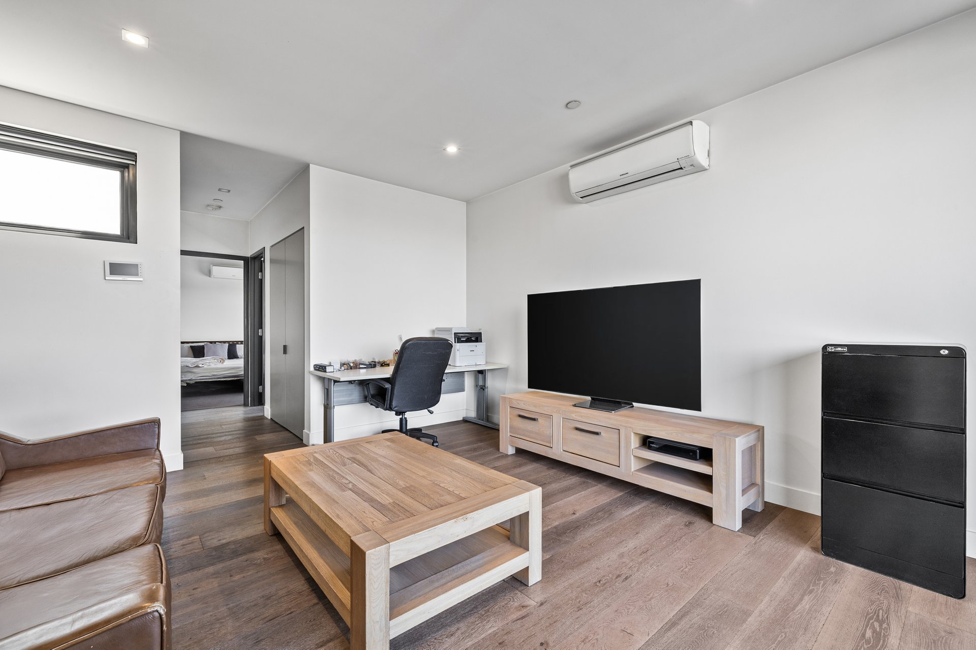 Inside, the home is defined by open-plan living and an abundance of natural light. A spacious living and dining zone features engineered timber flooring, downlights and large windows that draw in city-facing outlooks, extending seamlessly to a generous balcony that is partially undercover and perfect for year-round use. Climate comfort is assured with Samsung split-system air conditioning to both the living area and bedroom.