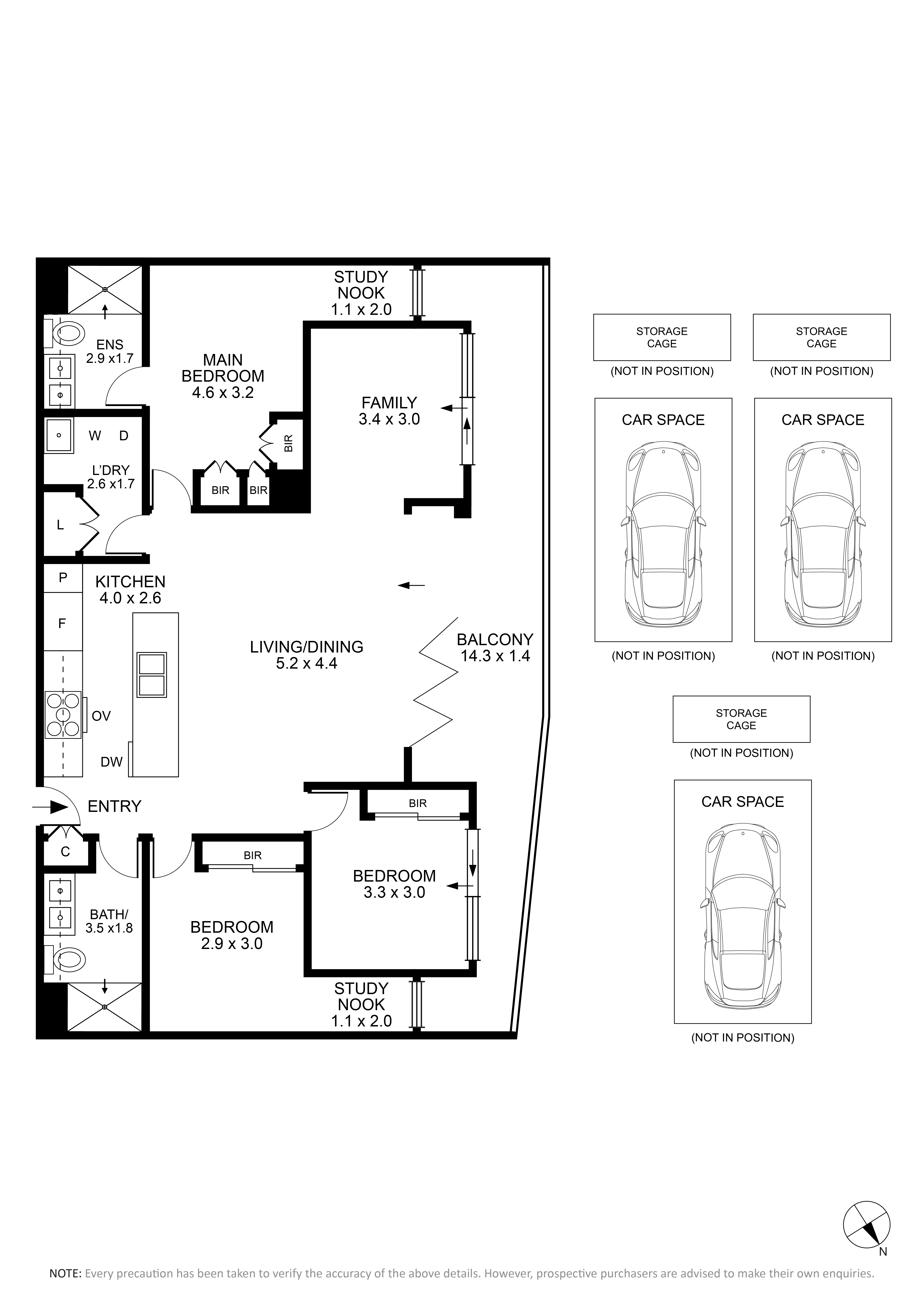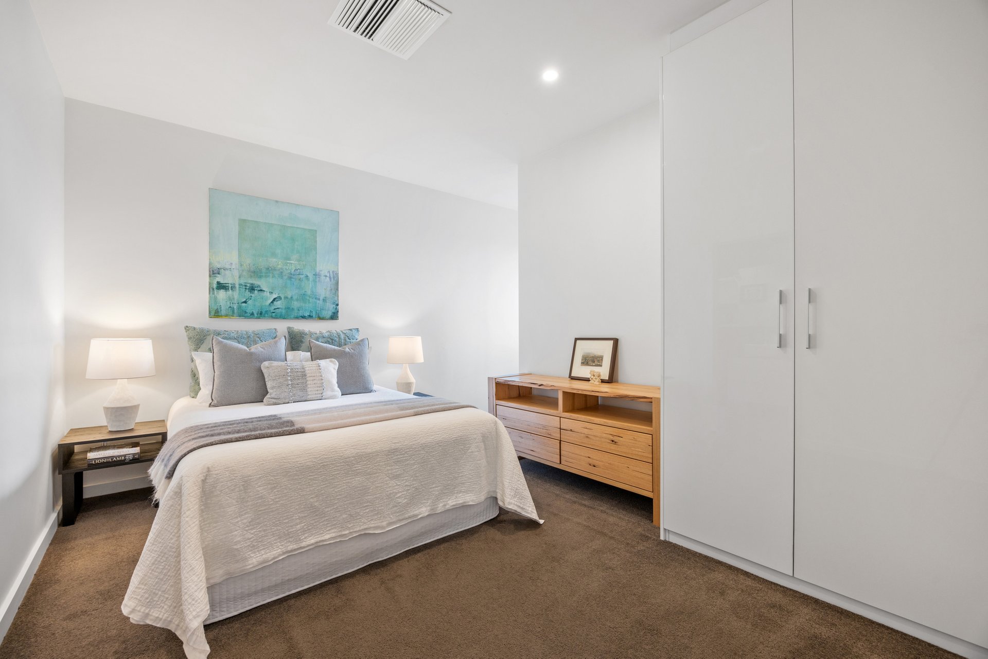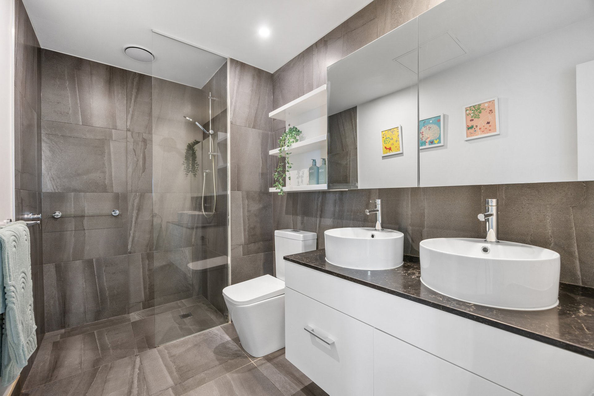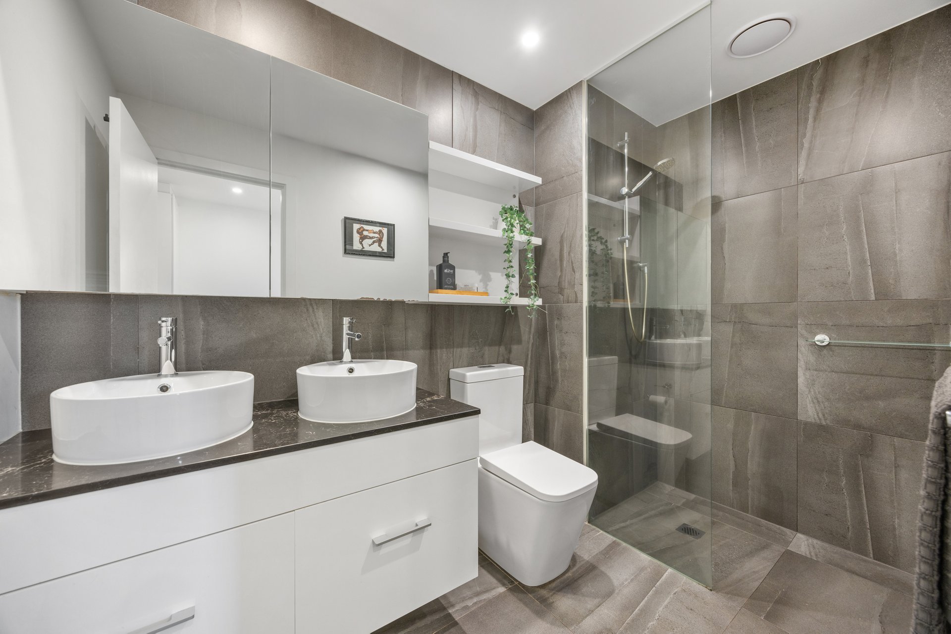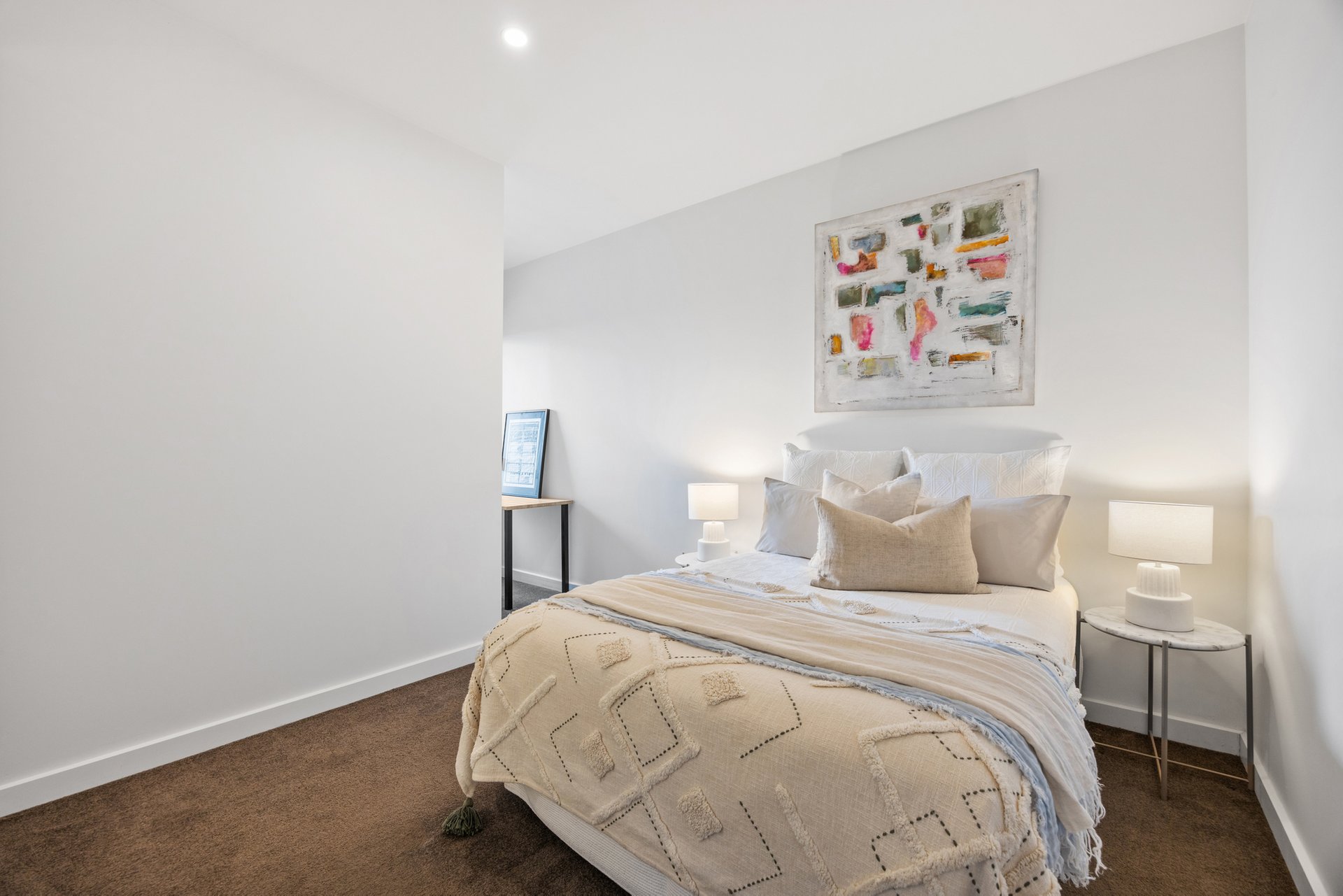 All three bedrooms come with built-in robes and plush carpet, while the main bedroom has its own ensuite. Two of the bedrooms also include study nooks. Both bathrooms are finished with floor-to-ceiling tiles, double vanities, and walk-in showers. A full sized laundry adds everyday ease, and the home also includes intercom entry, locked bicycle storage, three storage cages, and three secure car spaces.