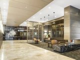 The light-filled living and dining area flows seamlessly to a private balcony, showcasing sweeping bay and marina views in a peaceful alfresco setting.