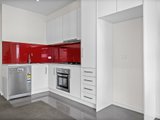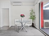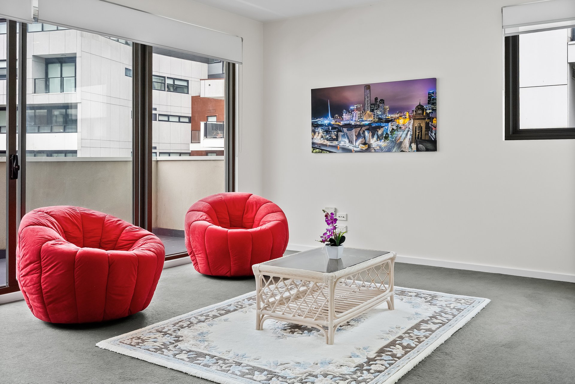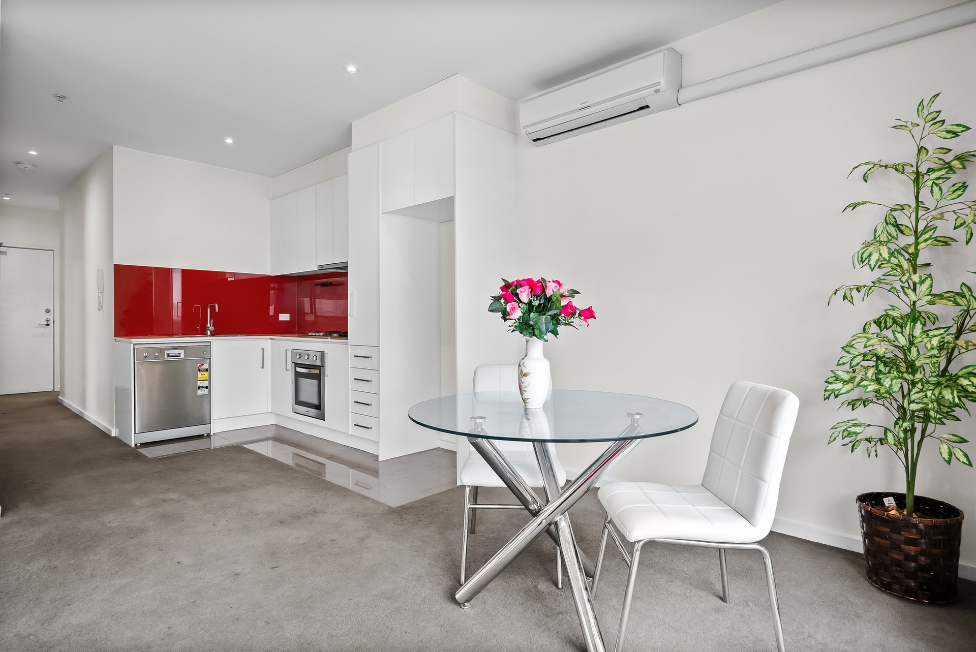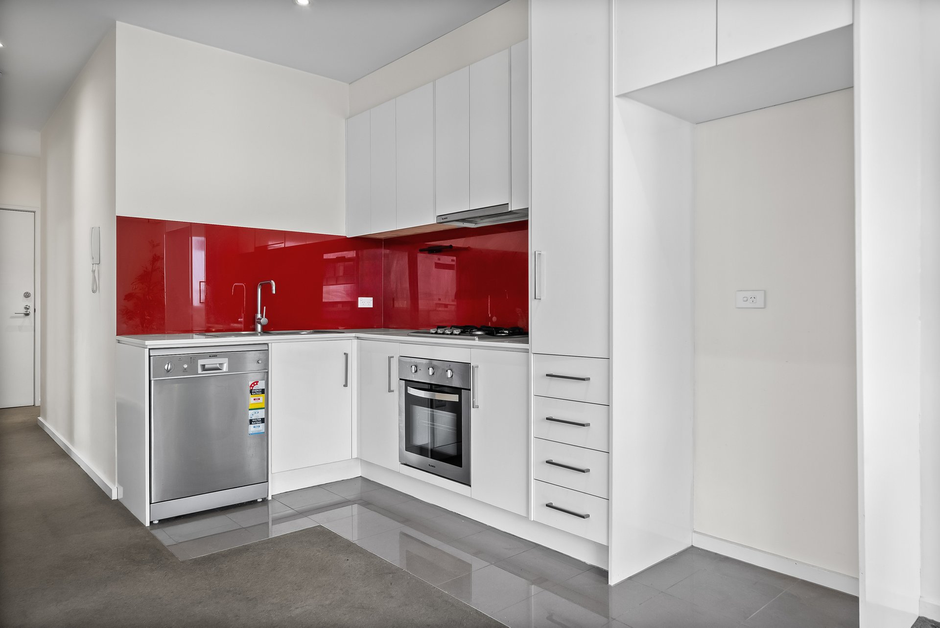 The L-shaped kitchen introduces a playful touch with its red glass splashback and Blanco oven, inviting social cooking and conversation that extends easily to the dining and living areas. Both bedrooms feature soft carpeting, mirrored built-in robes, and large windows for a sense of calm and retreat. A modern bathroom ties the home together with granite-toned tiles and elegant fittings that feel both stylish and functional.