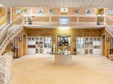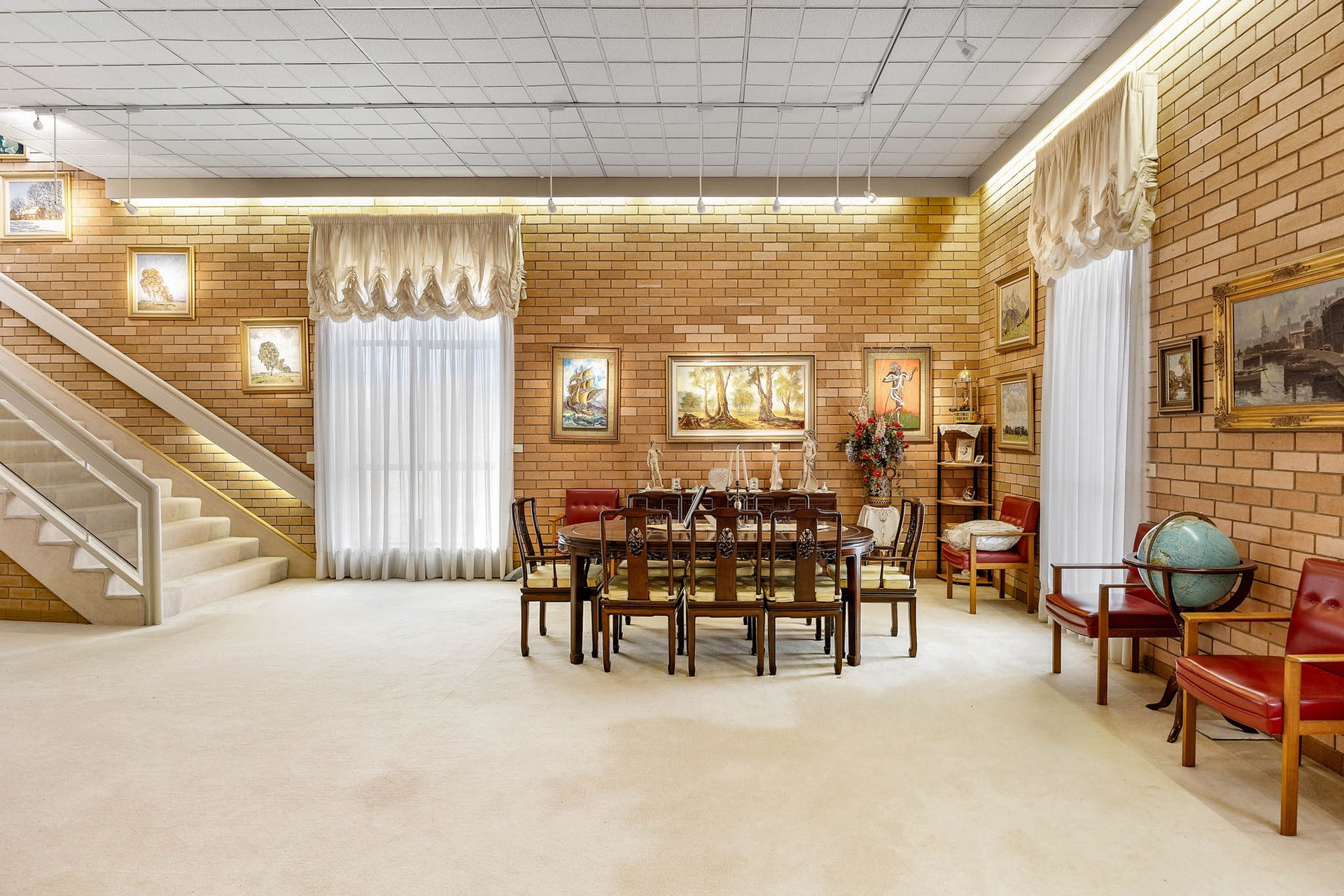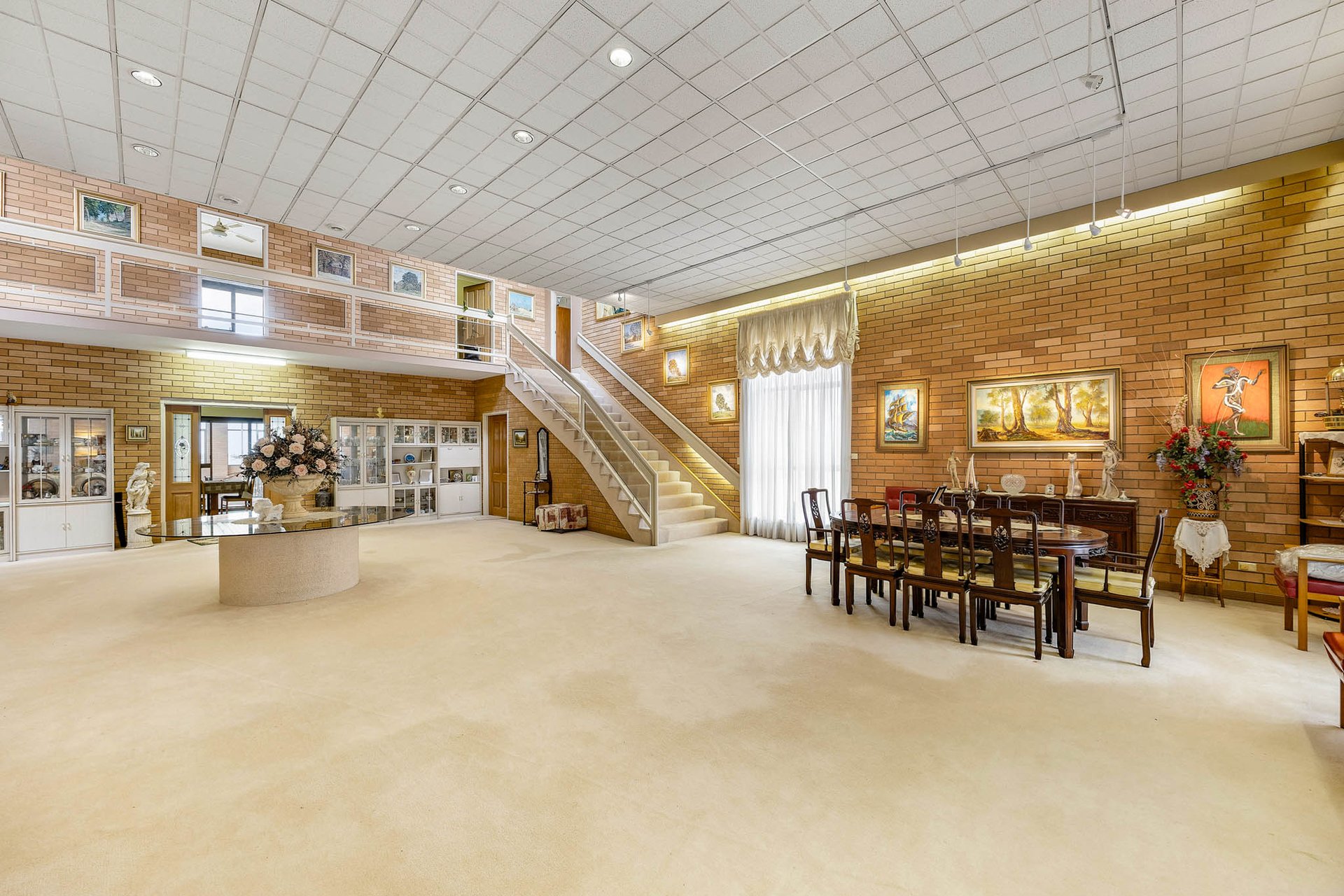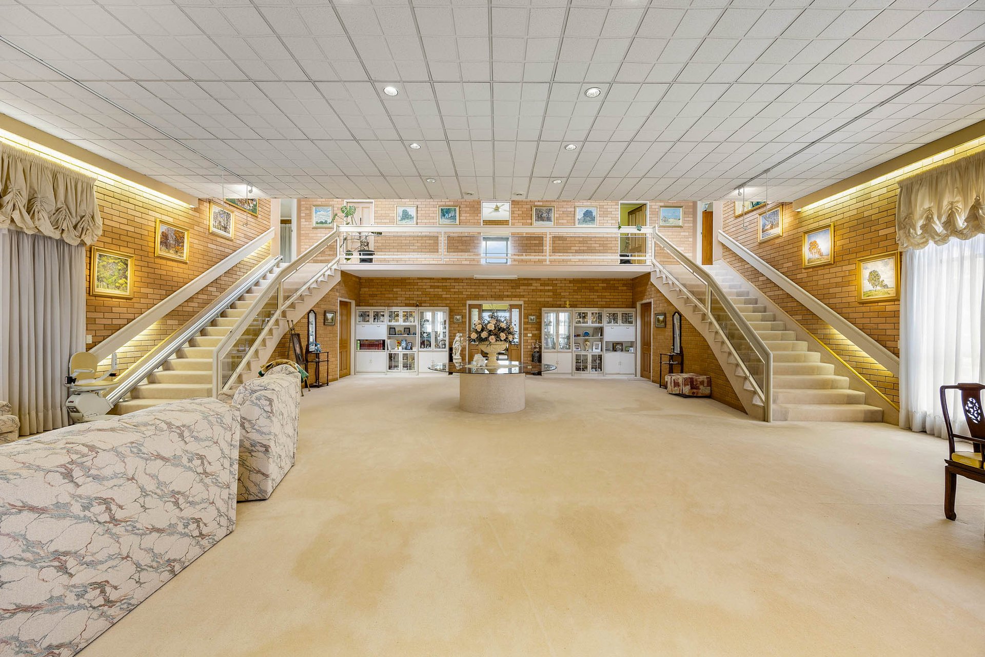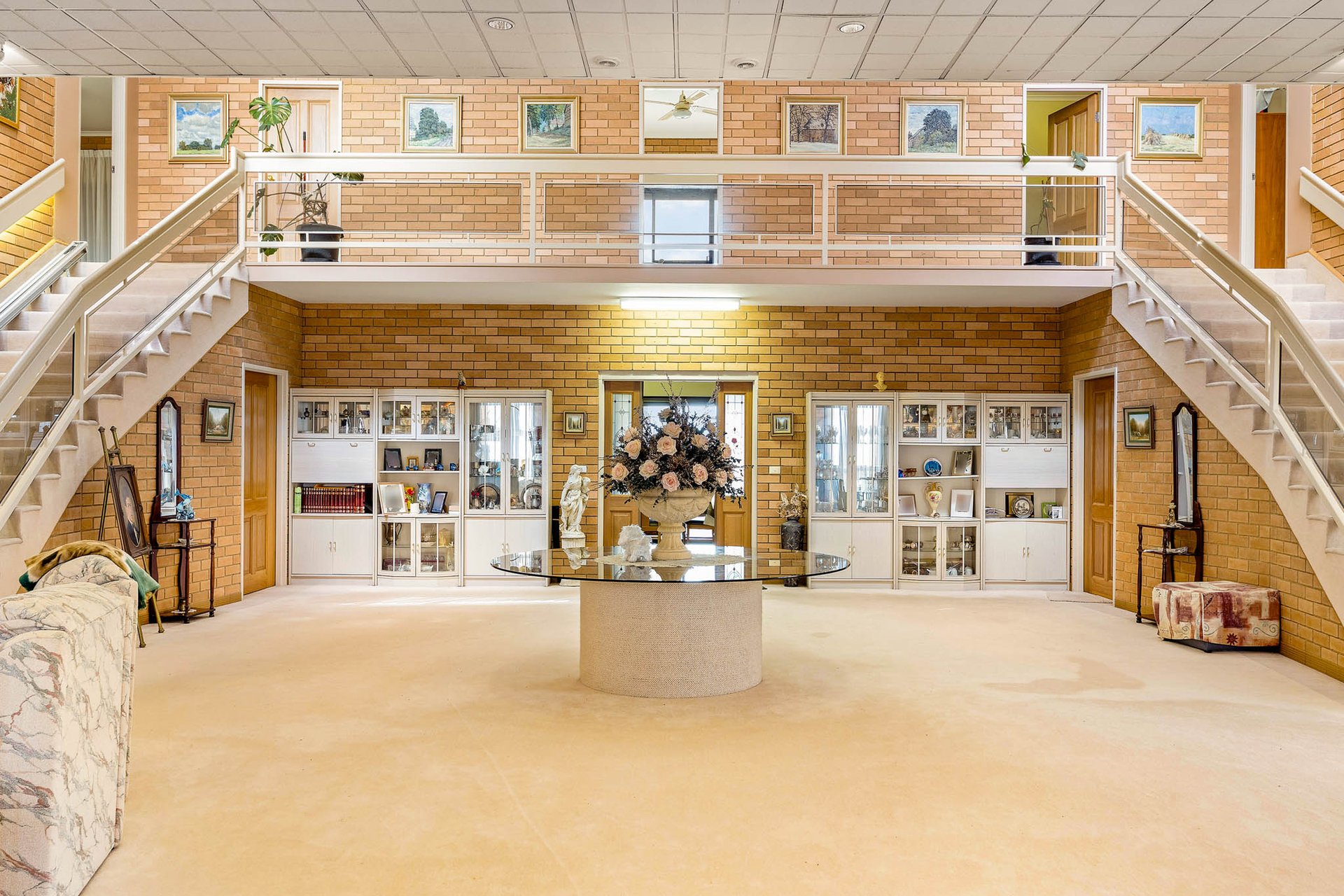 Approached via a long private driveway, the distinctive double-brick residence opens to a vast lounge with soaring ceilings, picture lights and dual staircases, with the sheer scale of the room inviting multiple interpretations for a lavish update.