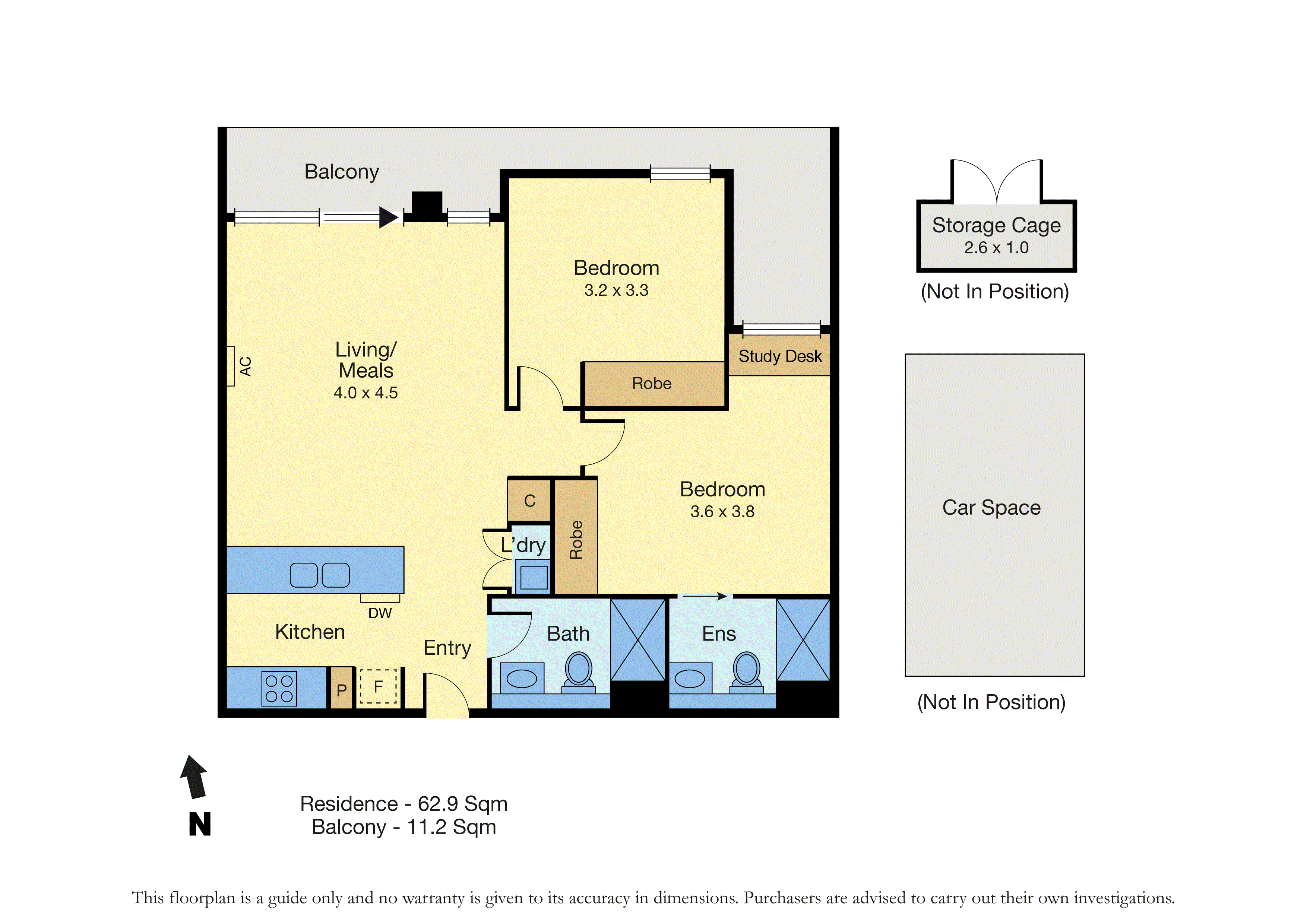 Filled with natural light, the living and dining room opens to a full-width, north-facing balcony that spans the entire rear façade, offering a seamless indoor-outdoor flow. The modern kitchen is appointed with stone benchtops, a breakfast bar, induction cooktop and integrated dishwasher. Both bedrooms feature built-in robes, with the main bedroom offering a fitted study desk and an ensuite, while a second well-appointed bathroom and European laundry complete the layout.