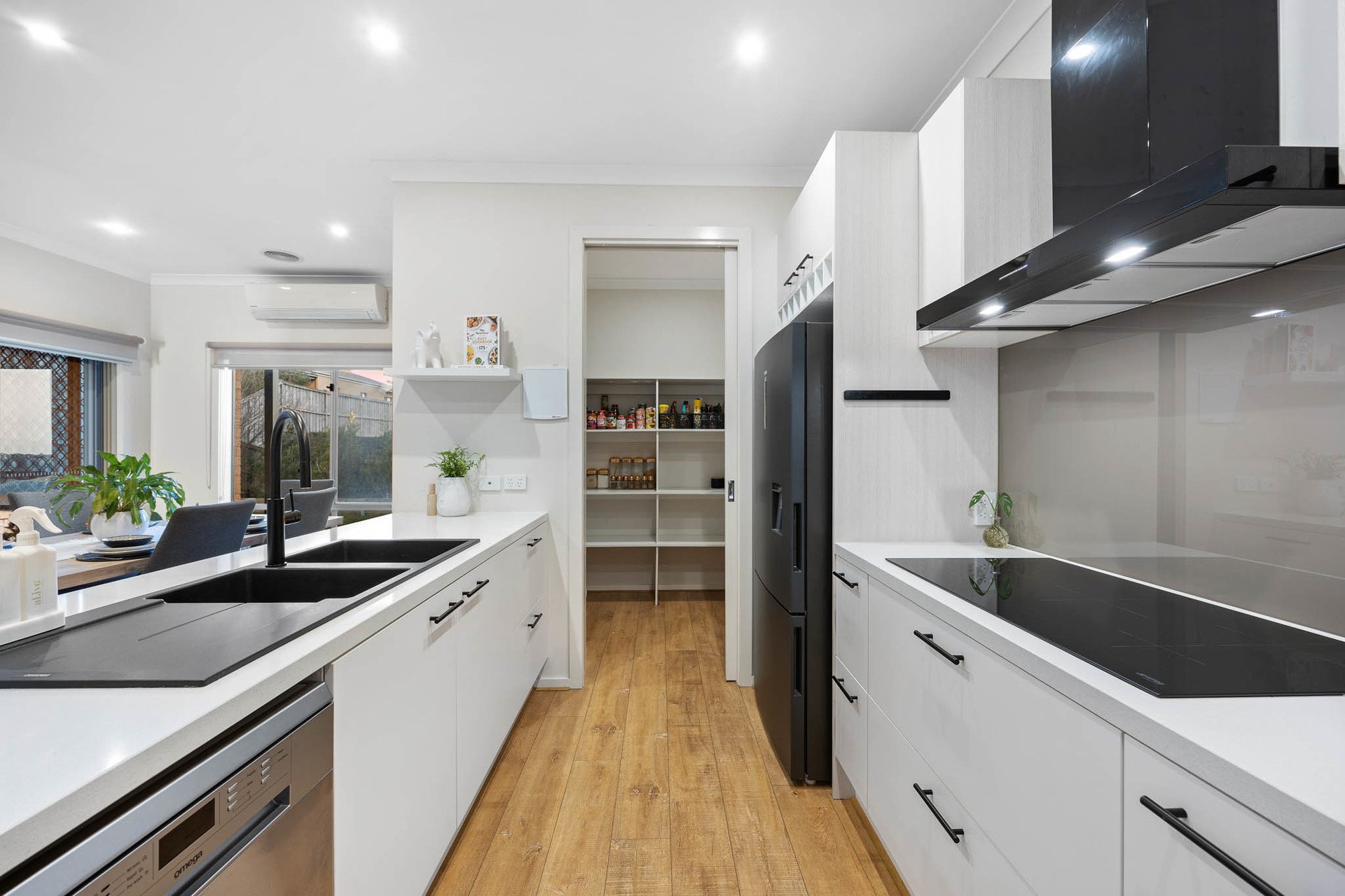 The heart of the home is the open plan living and dining zone, seamlessly connected to a back deck and serviced by a gourmet kitchen with stone benchtops, granite double sink, brand new 90cm Smeg induction cooktop and range hood, twin Smeg 60cm ovens, Omega dishwasher, and a huge walk-in pantry with sliding door. Additional features include a downstairs powder room, understairs storage, and a large laundry with bench space and outdoor access.