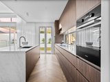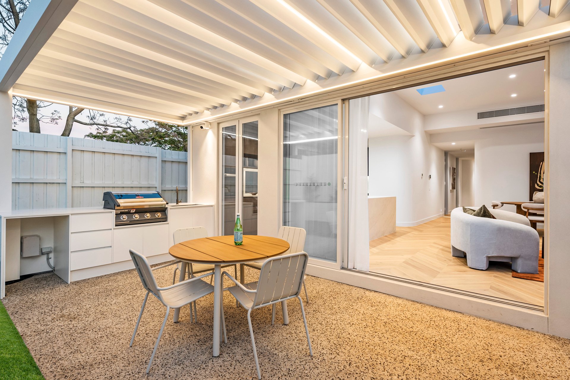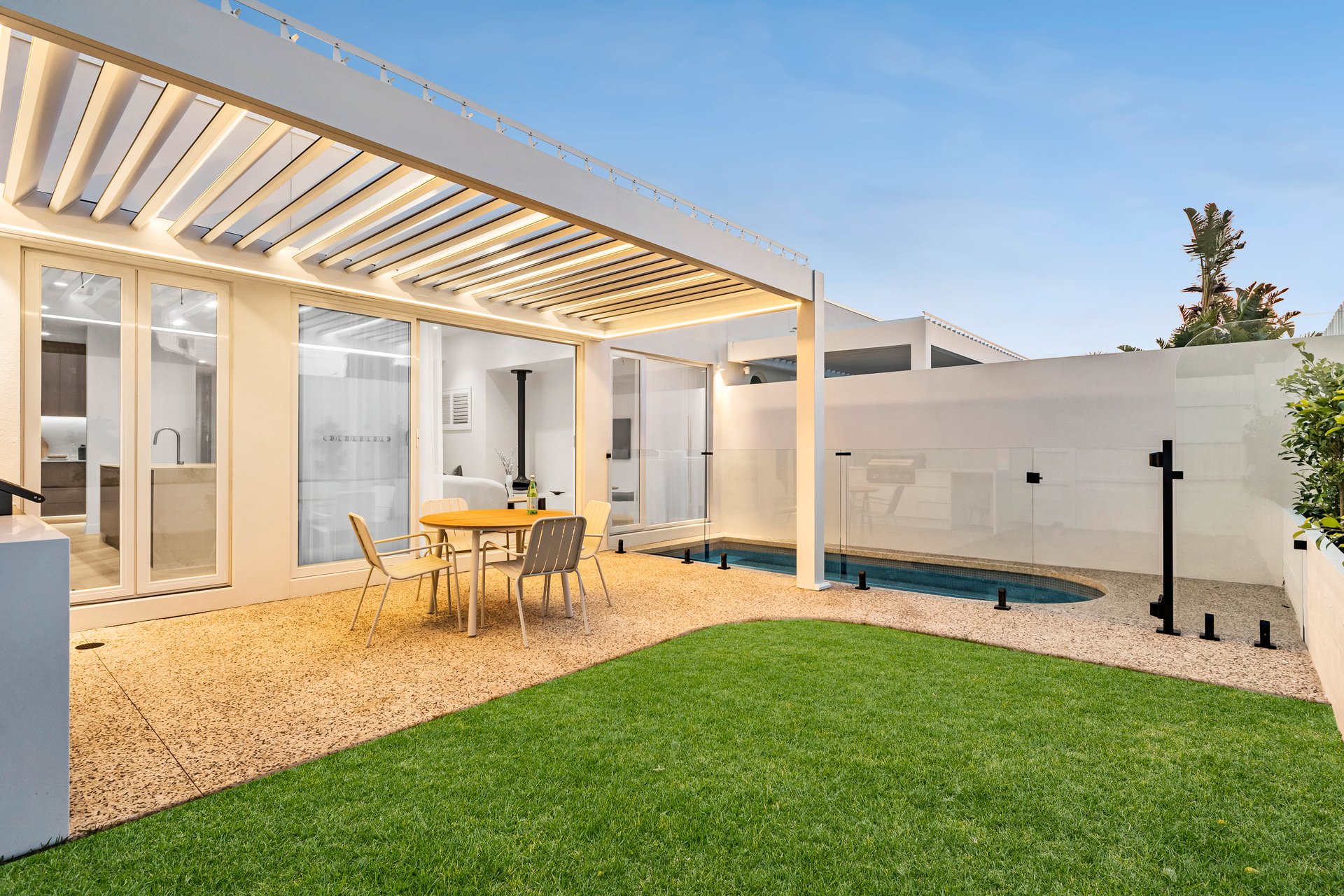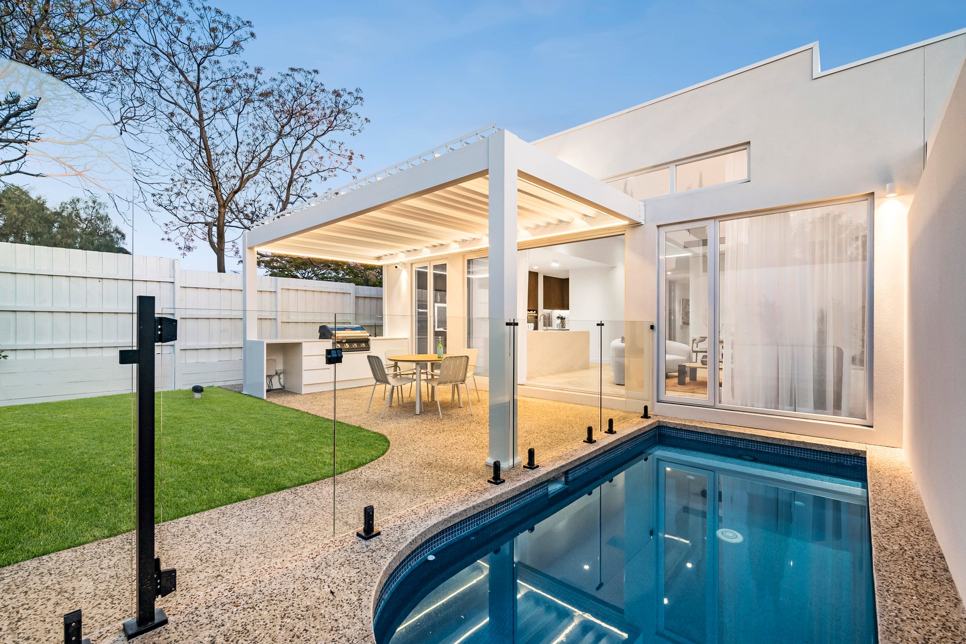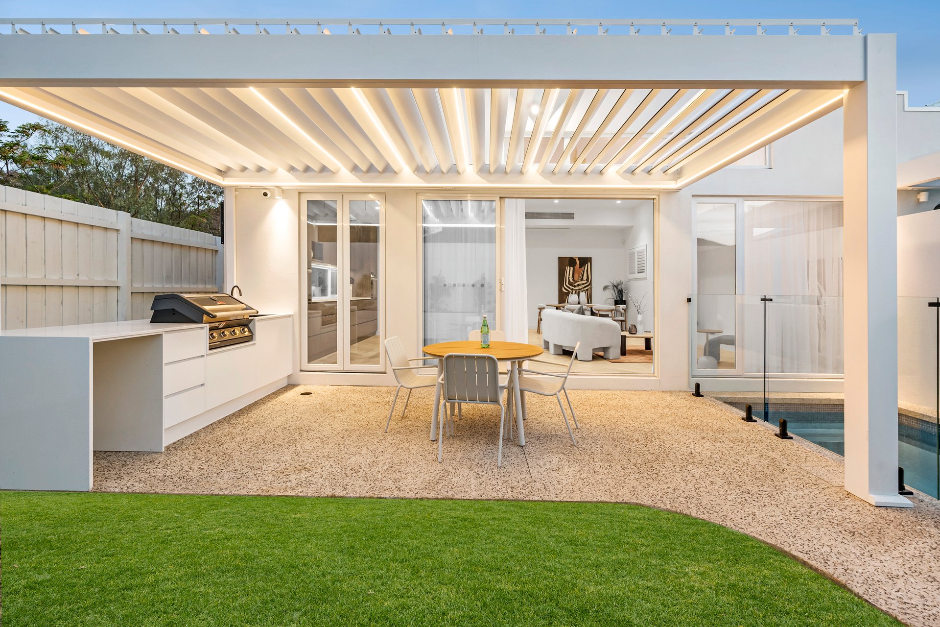 At the heart of the home, expansive open-plan living with 3.6 m ceilings integrates beautifully with the north-facing alfresco and fully tiled heated pool. The designer kitchen showcases Miele appliances, a full butler's pantry, herringbone timber flooring, and absolute-grain timber joinery throughout. Entertain with ease under the automatic louvred pergola featuring LED lighting and a built-in Beefeater barbecue, all framed by seamless indoor-outdoor connection and abundant natural light.