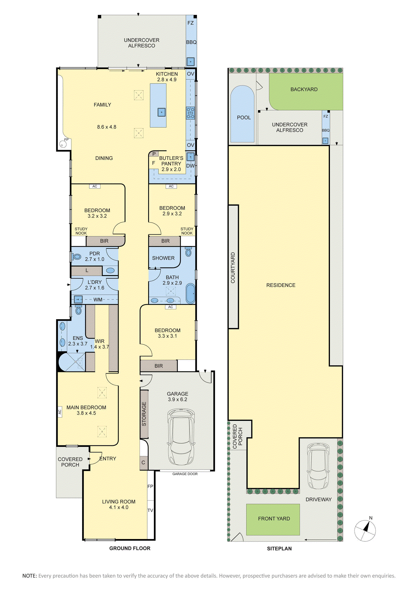 The home opens to a grand 5.9 m ceiling living area, setting the tone for a design that blends warmth and volume. A separate front lounge with suspended timber fireplace offers a relaxed retreat, while the main bedroom suite impresses with a fitted walk-in robe and a stunning ensuite finished with Italian tiles and gunmetal fixtures. Three additional bedrooms, each with built-in robes and study nooks, are complemented by a central bathroom, powder room, and a dedicated laundry with external access.