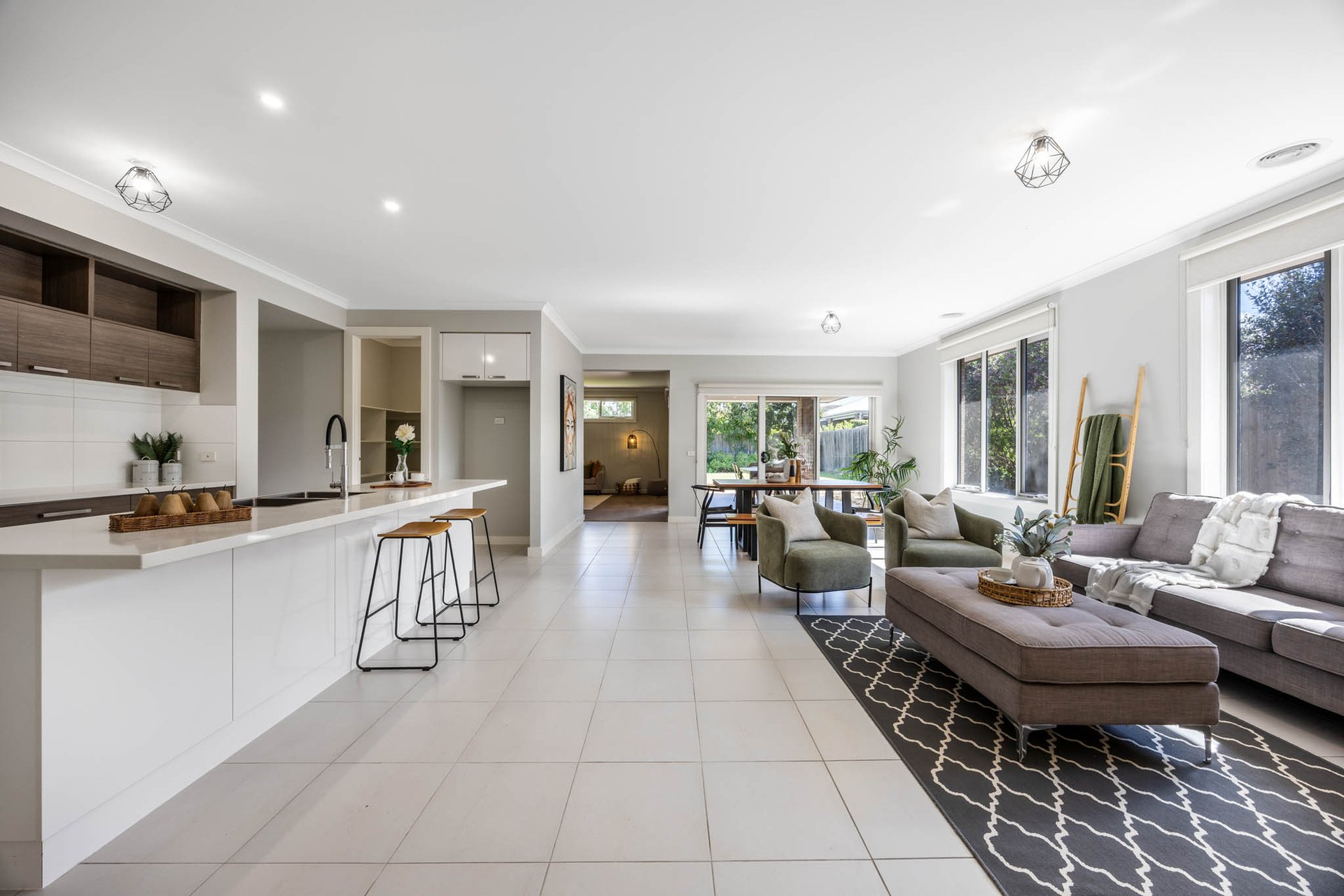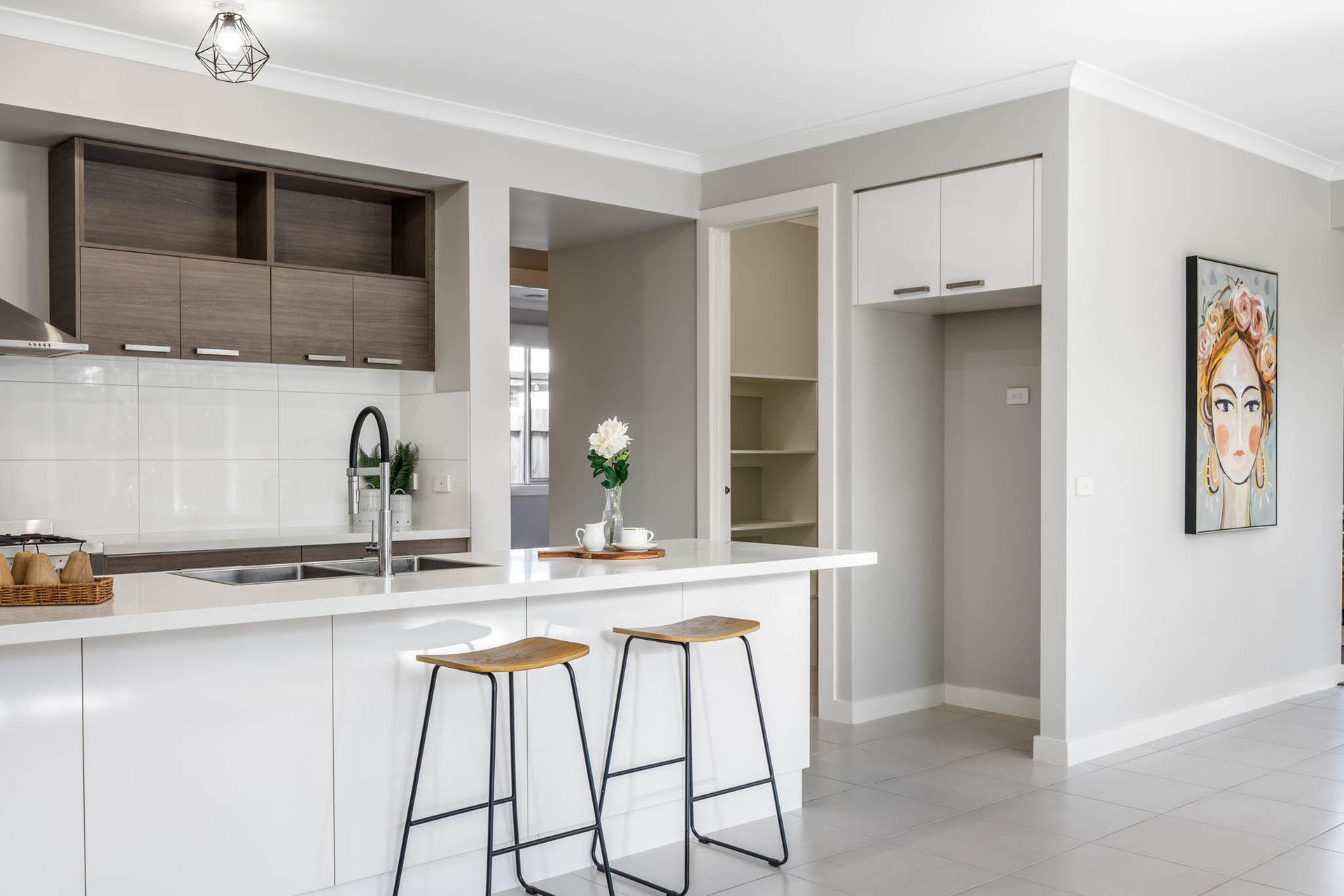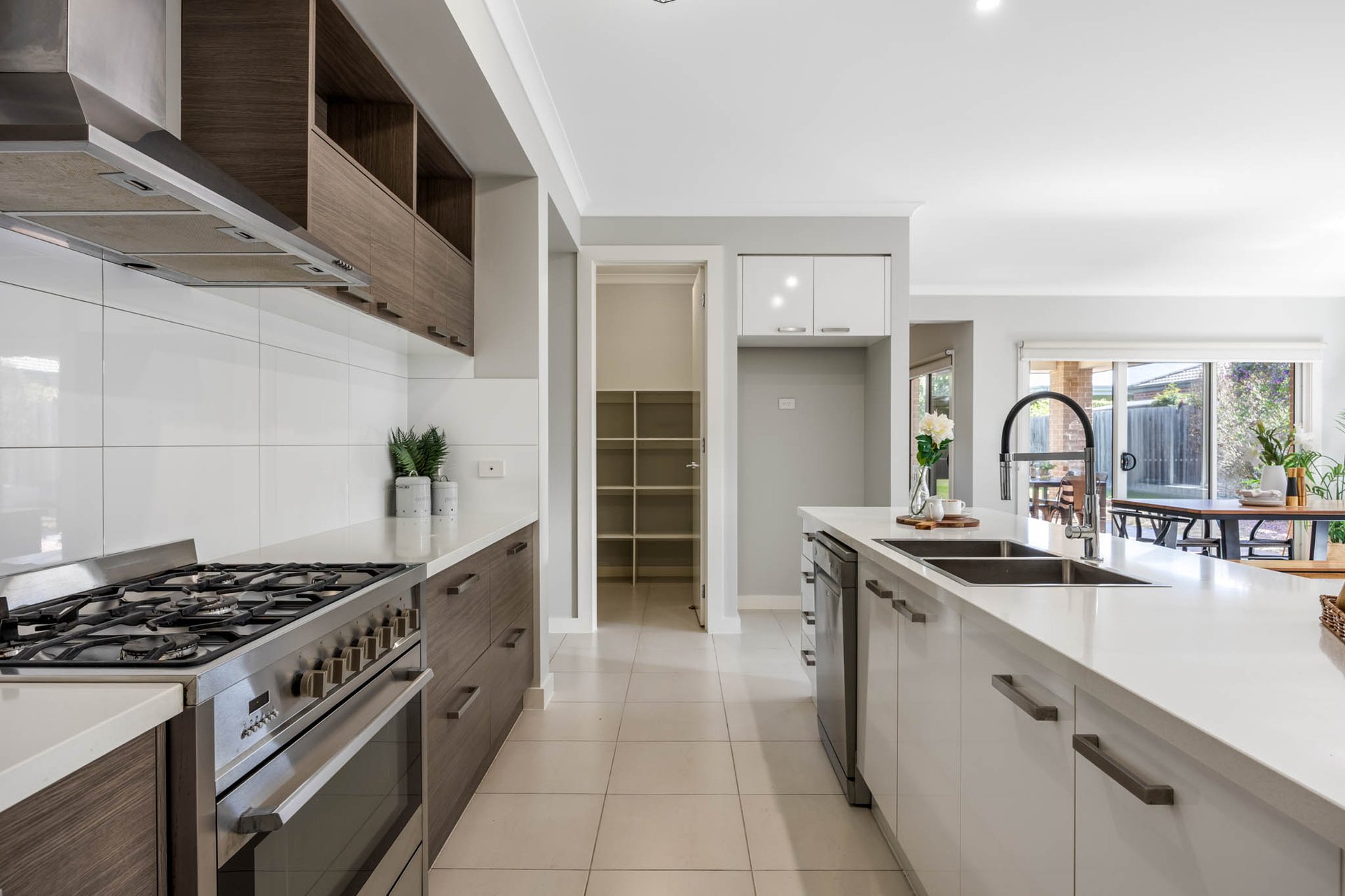 At its heart, a stunning kitchen projects modern polish with 40mm stone benchtops, a large-format tiled splashback, timber-tone cabinetry, a walk-in pantry, and excellent appliances including a 900mm-wide Technika upright oven and a Whirlpool dishwasher.