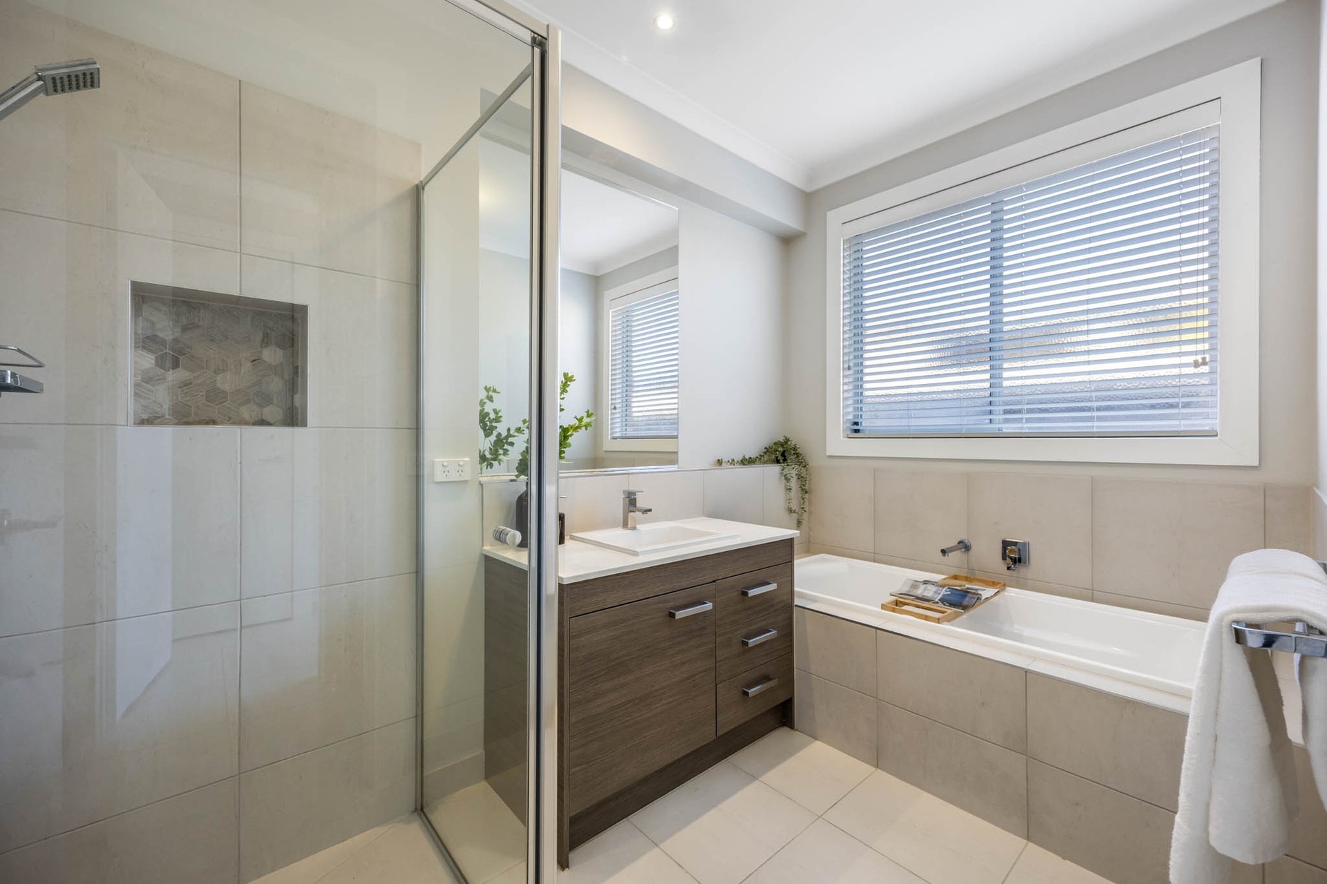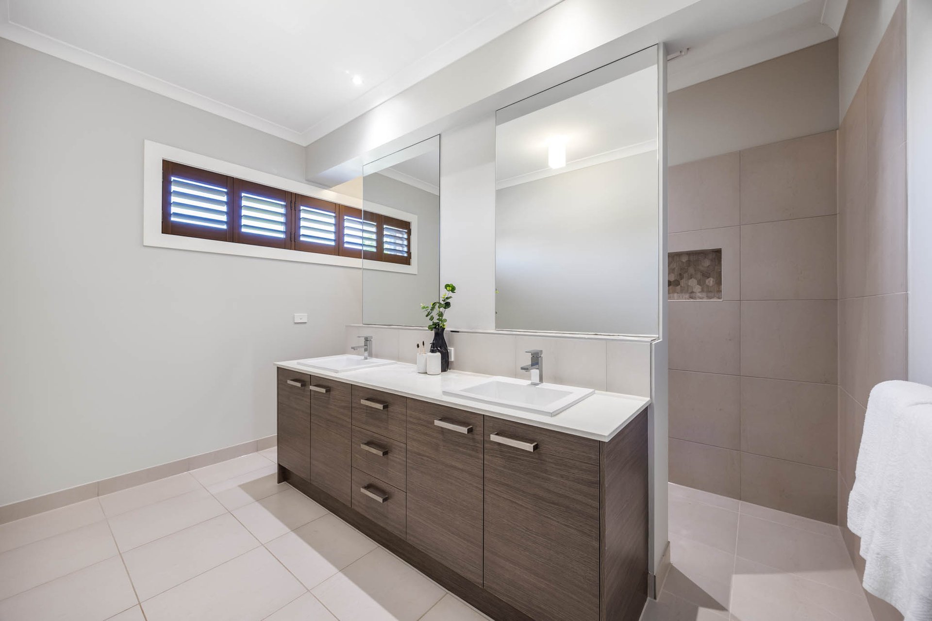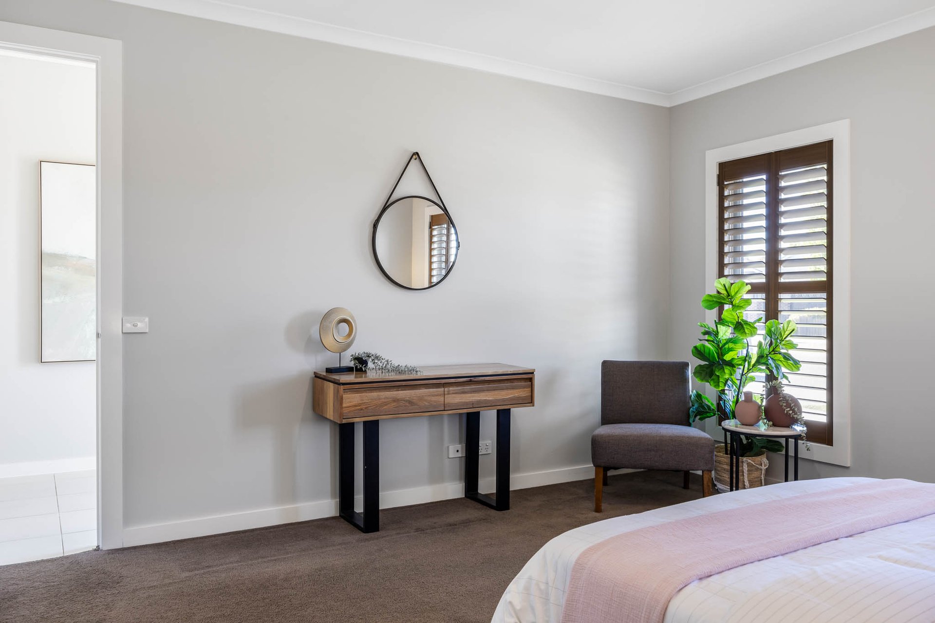 Accommodation unfolds across four beautifully scaled bedrooms. The main suite is an elegant retreat with plantation shutters, dual walk-in robes, and a luxe ensuite featuring a twin stone vanity and a walk-in shower. Separated to their own wing, three further robed bedrooms enjoy use of the central bathroom finished with a stone vanity, niched shower, bath, and a separate WC.