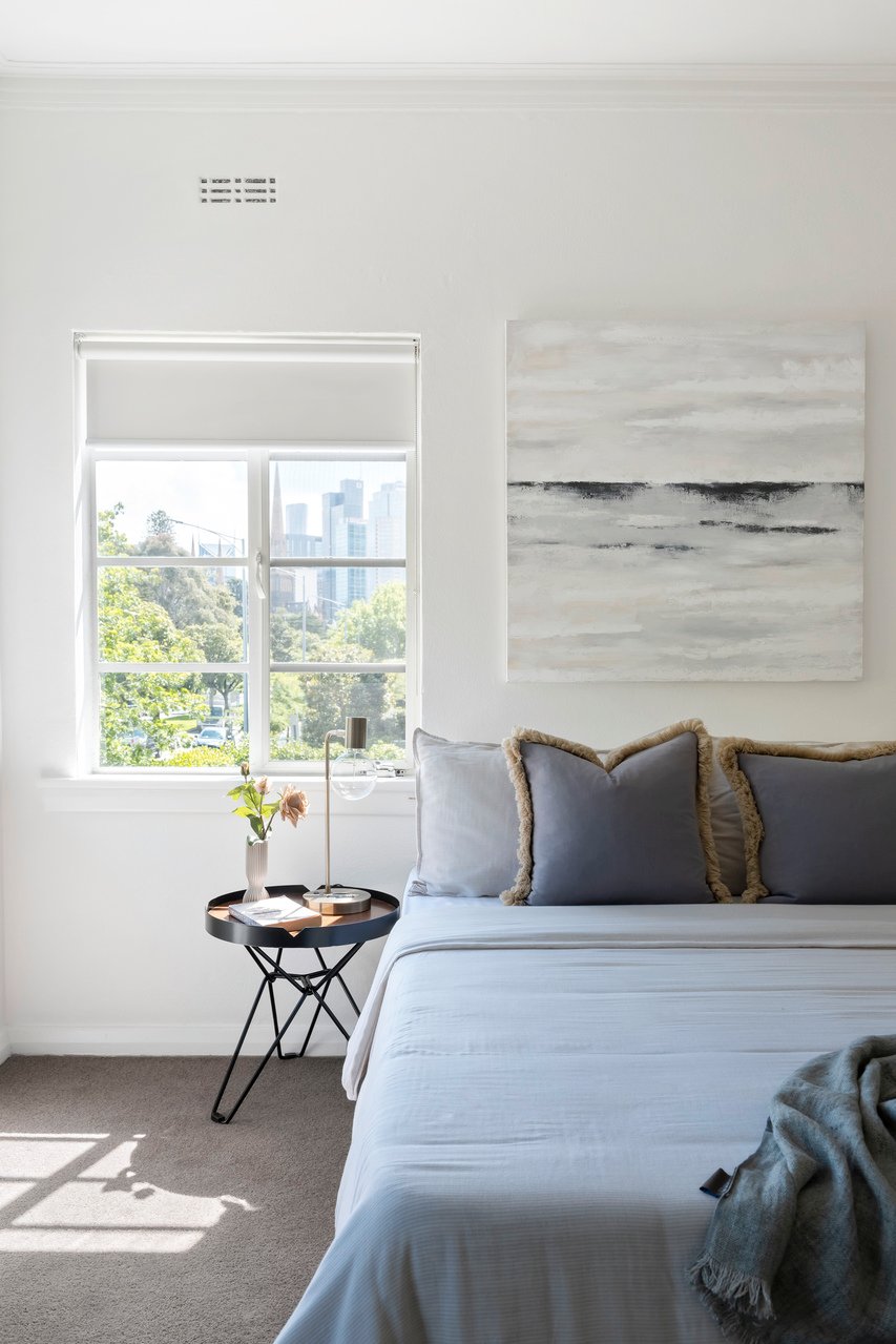 Stepping inside, the warmth of new timber floors and soft morning light set a tone of effortless charm. A broad living and dining area invites both quiet relaxation and easy entertaining, flowing to a private balcony where coffee comes with a view of treetops and the tranquil rhythm of East Melbourne.