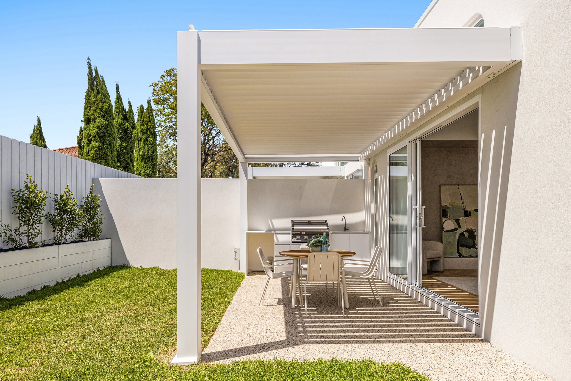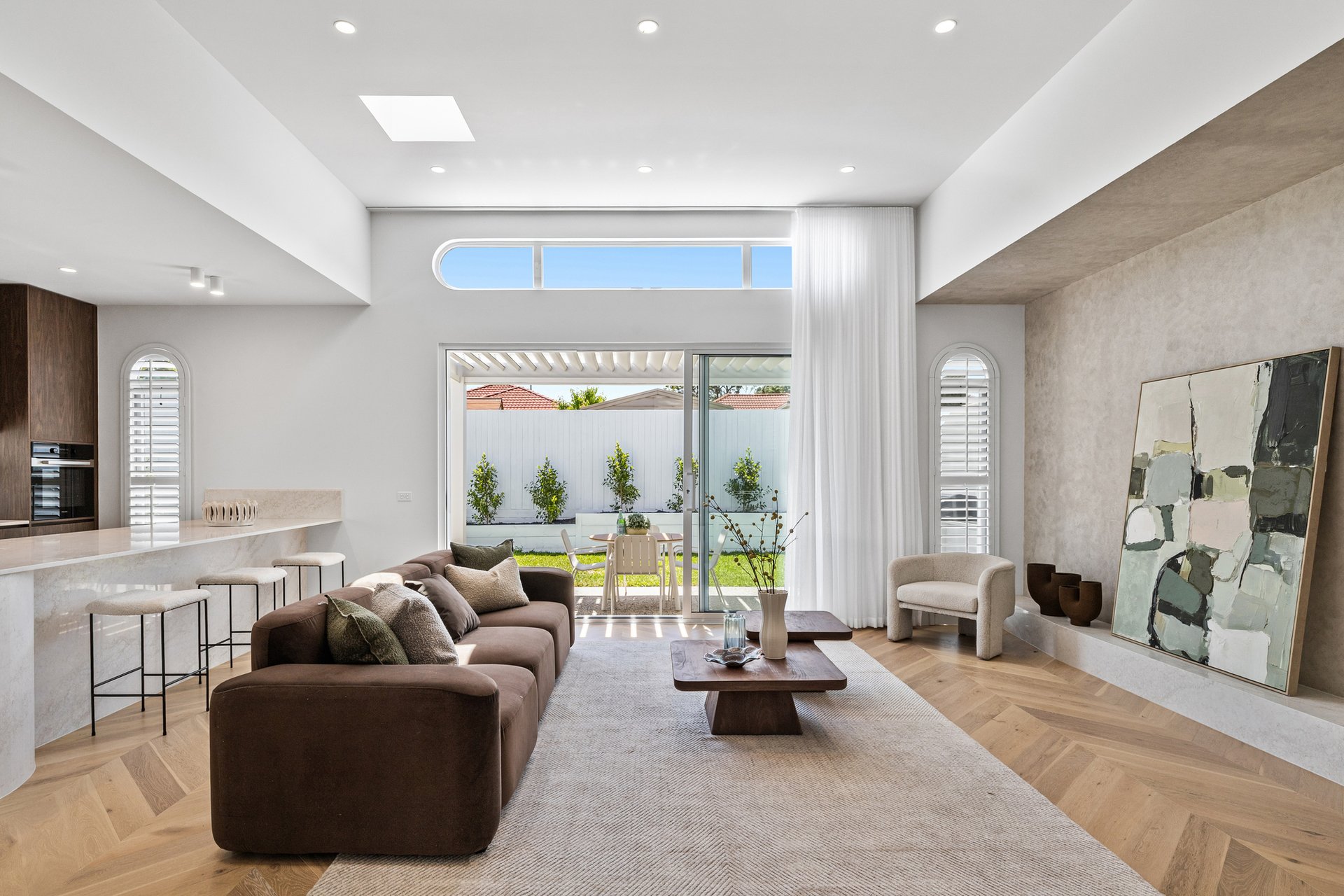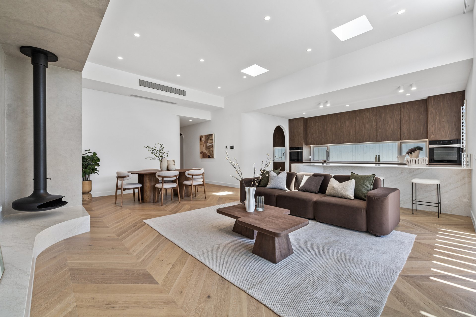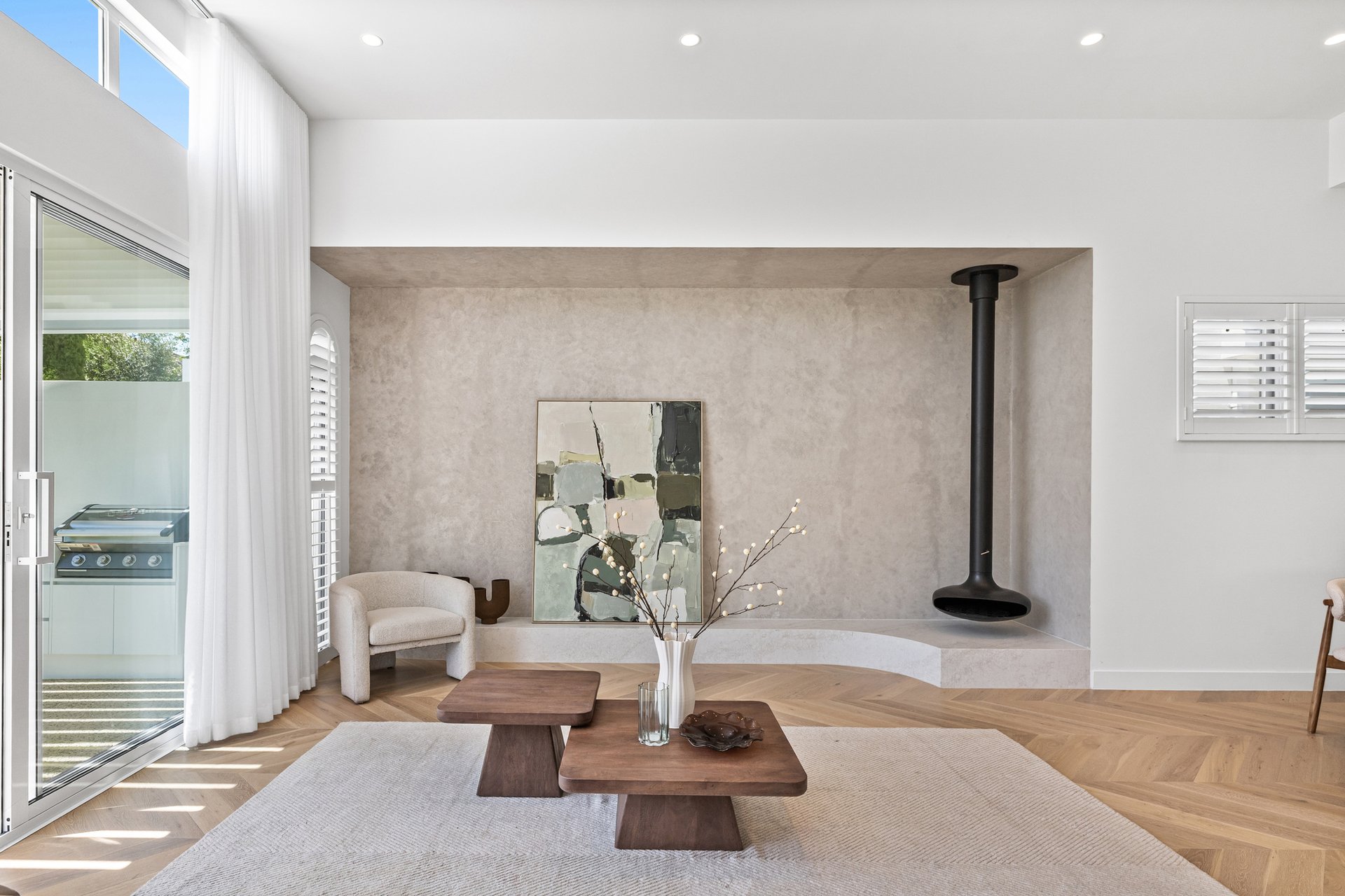 The open-plan living and dining area has been designed for effortless indoor–outdoor flow, with suspended fireplace, extending to a north-facing alfresco space under an automatic louvred pergola with LED lighting and a built-in Beefeater barbecue. A statement kitchen anchors the space, showcasing Miele appliances, a full butler's pantry, herringbone timber flooring, and beautifully executed absolute-grain timber joinery.