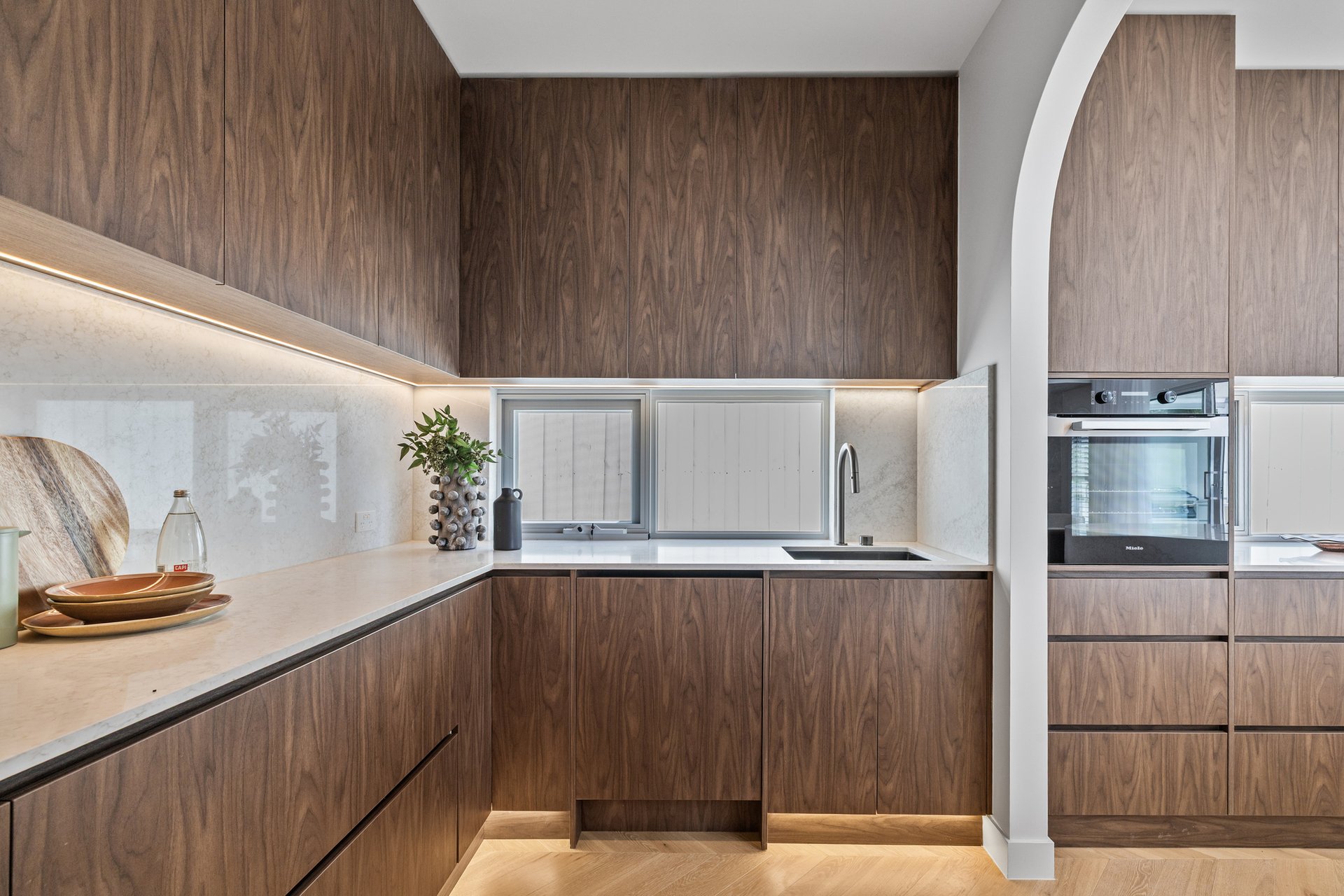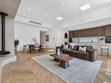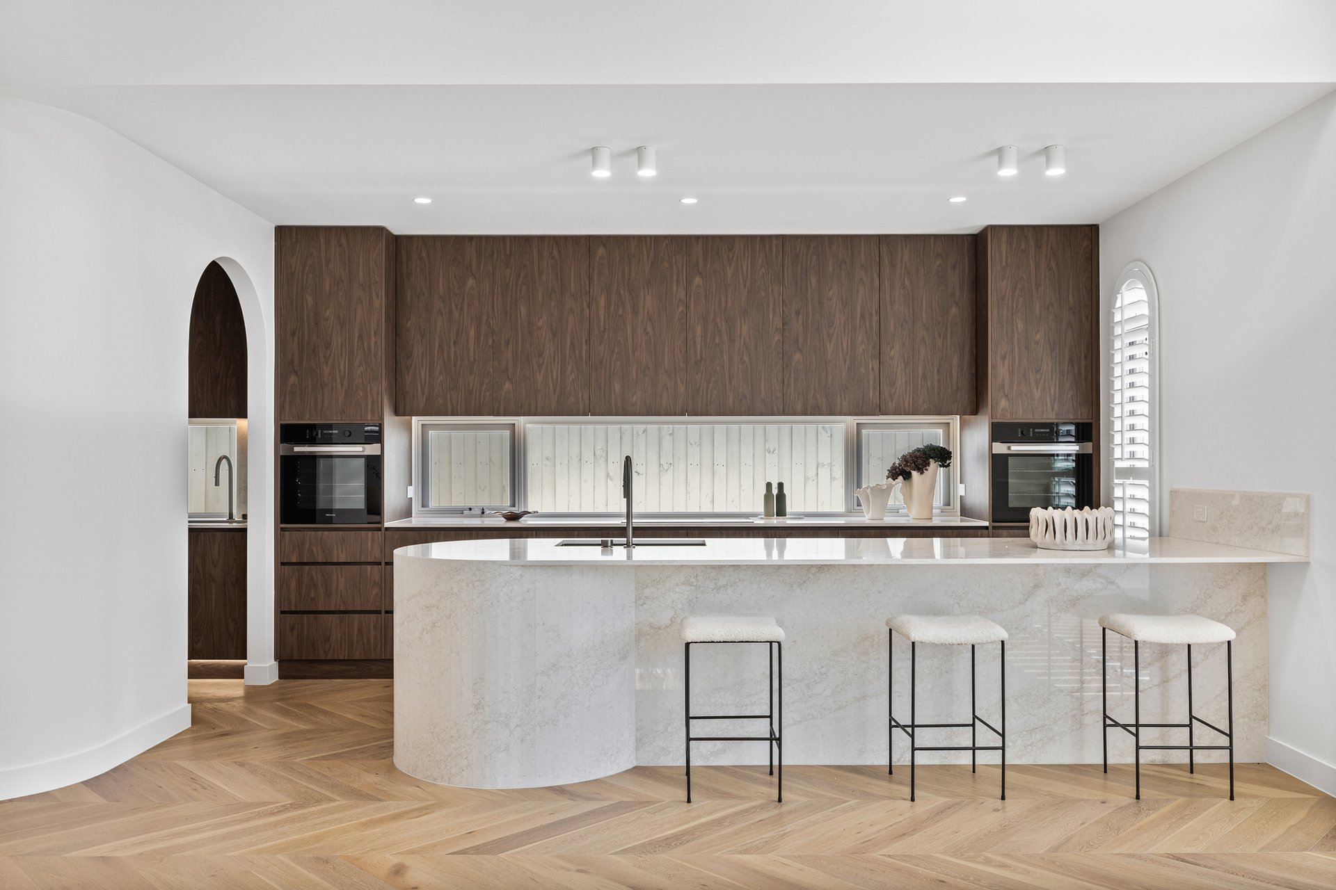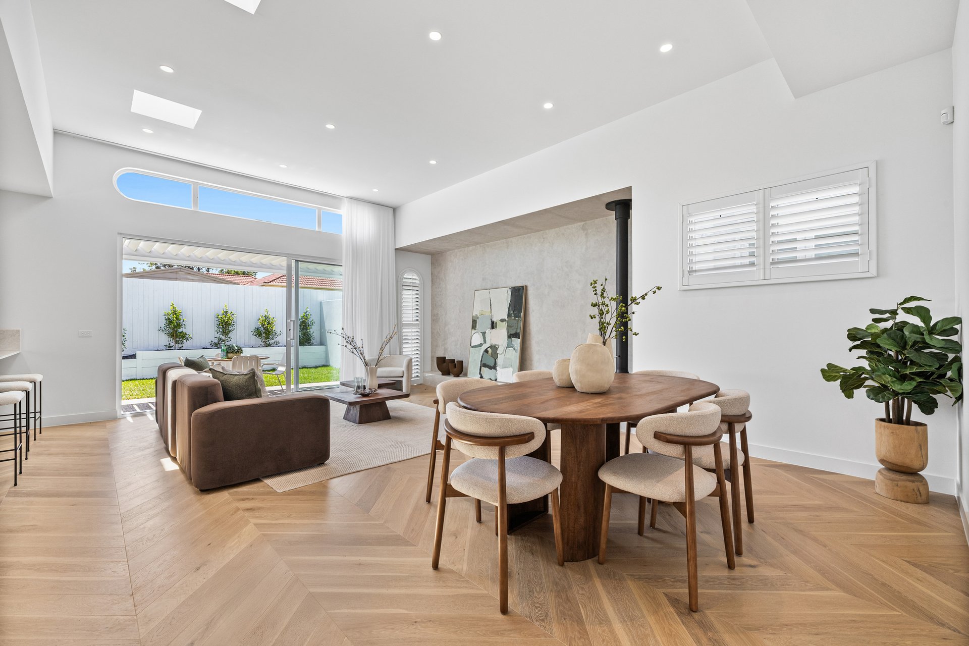 The open-plan living and dining area has been designed for effortless indoor–outdoor flow, with suspended fireplace, extending to a north-facing alfresco space under an automatic louvred pergola with LED lighting and a built-in Beefeater barbecue. A statement kitchen anchors the space, showcasing Miele appliances, a full butler's pantry, herringbone timber flooring, and beautifully executed absolute-grain timber joinery.