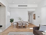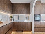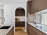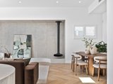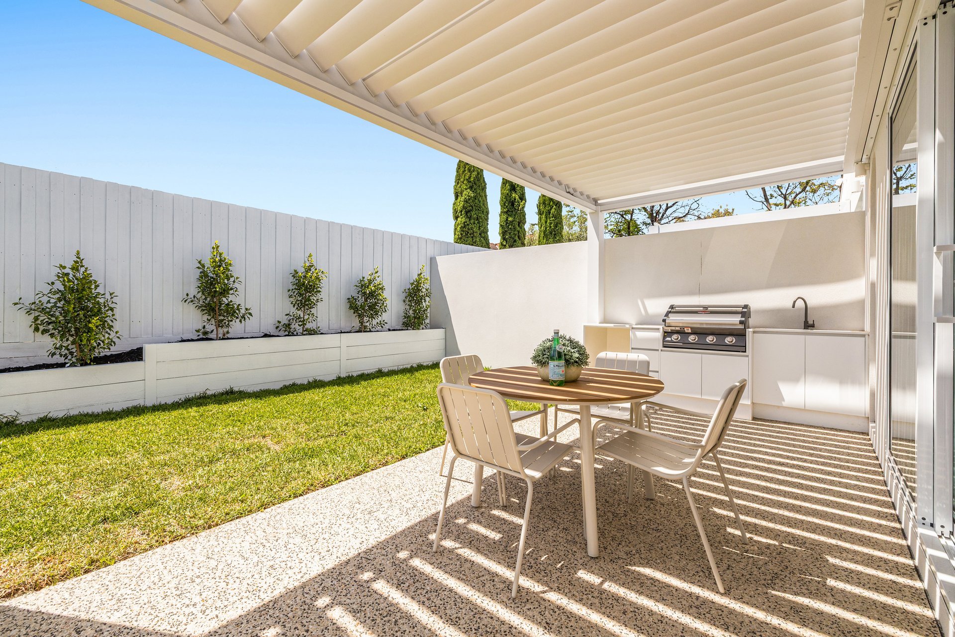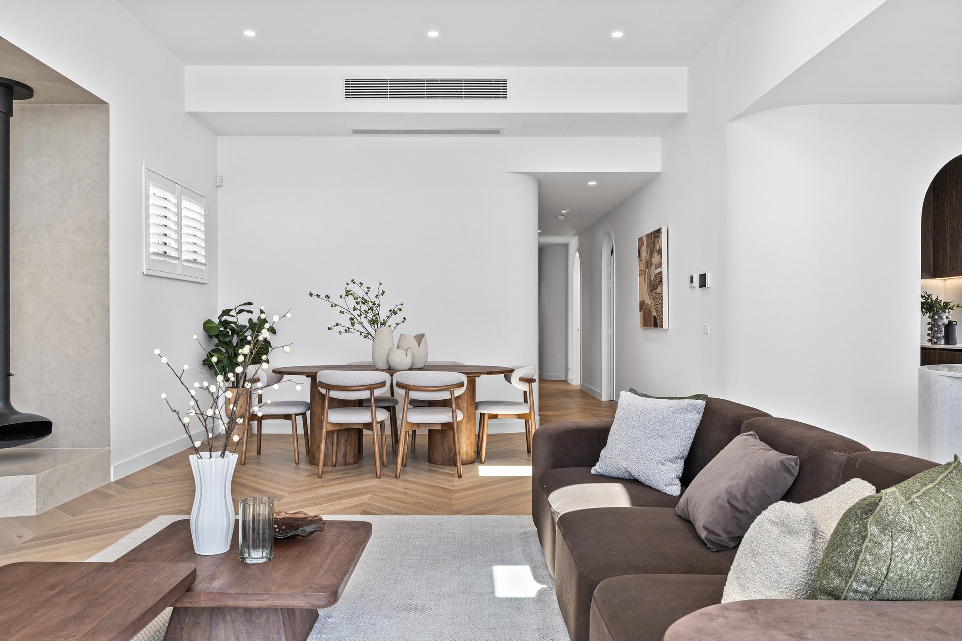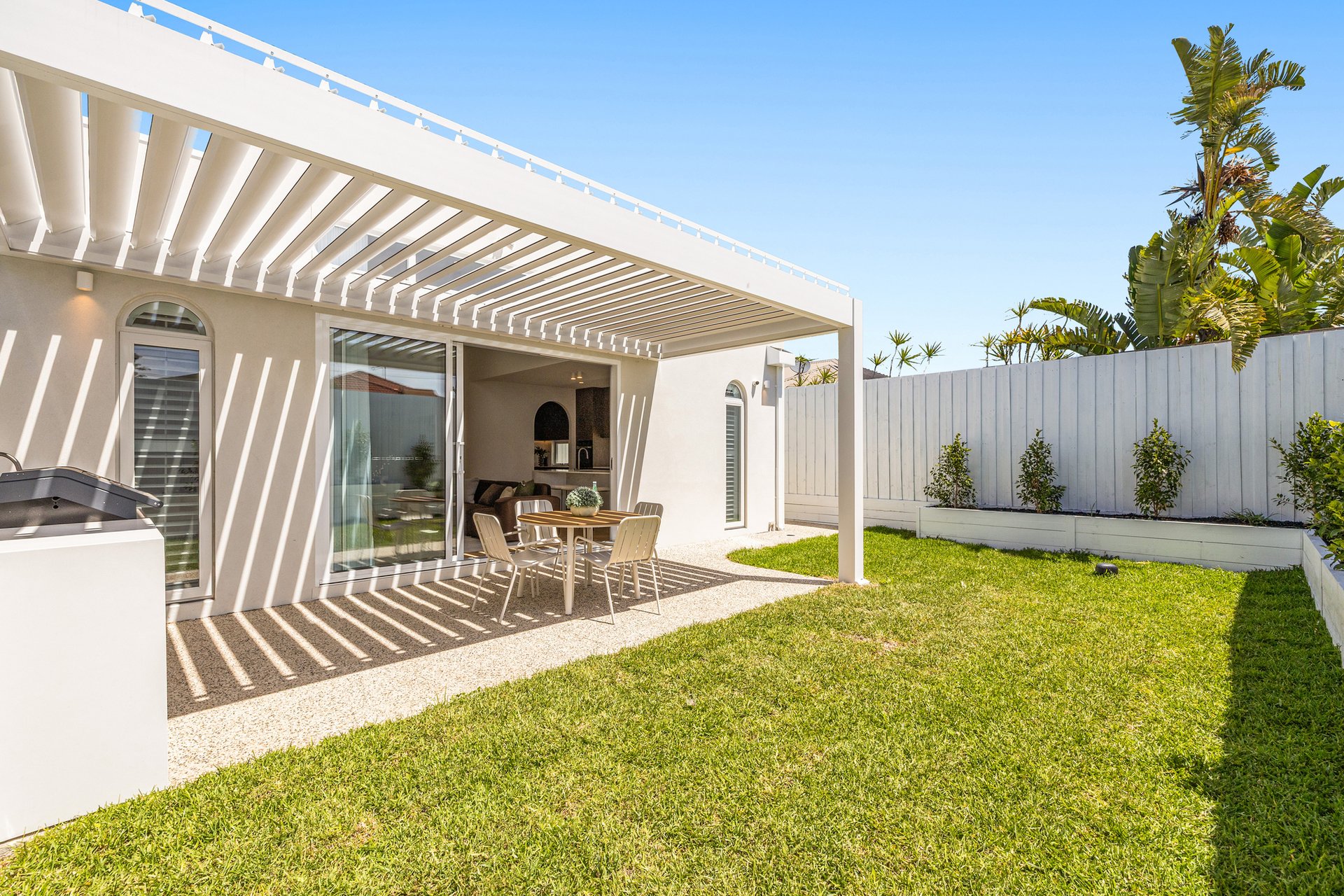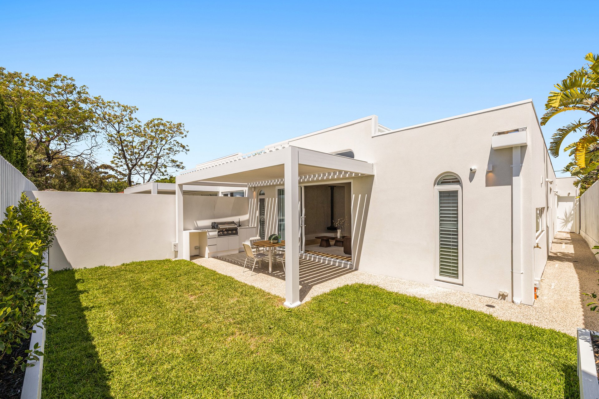 The open-plan living and dining area has been designed for effortless indoor–outdoor flow, with suspended fireplace, extending to a north-facing alfresco space under an automatic louvred pergola with LED lighting and a built-in Beefeater barbecue. A statement kitchen anchors the space, showcasing Miele appliances, a full butler's pantry, herringbone timber flooring, and beautifully executed absolute-grain timber joinery.