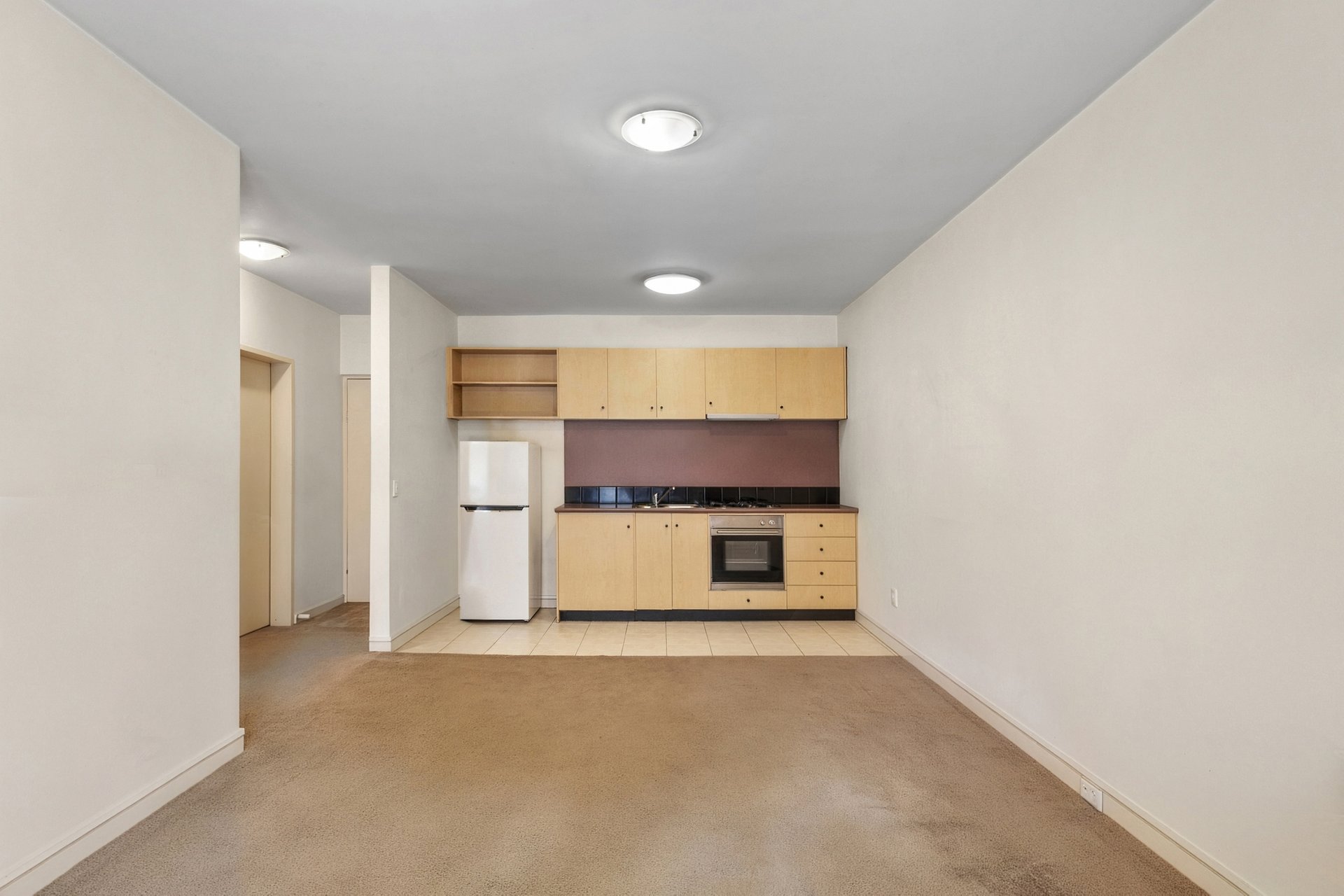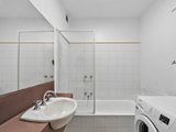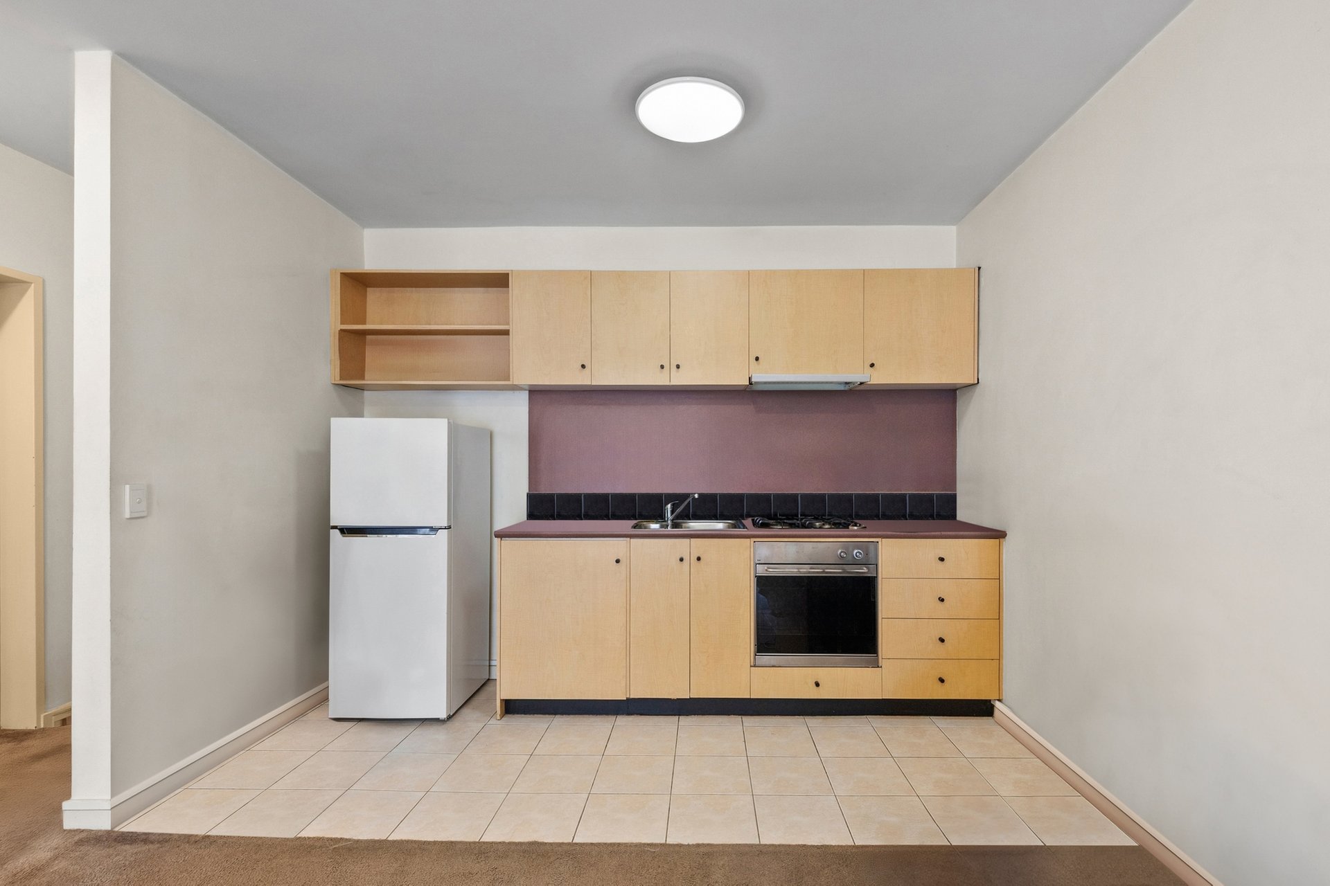 The open plan living and dining area is bright and inviting, flowing to a private balcony for easy indoor-outdoor living. The kitchen is neatly appointed with tiled flooring, a Magic Flame gas cooktop and Blanco oven, offering a practical and efficient layout. A well-proportioned bedroom and central bathroom with shower-over-bath complete the accommodation.